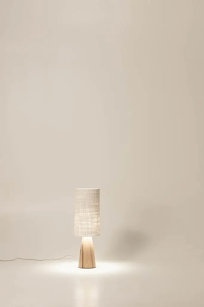Guma FL4S lamp by Jeroen De RuddereDimensions: D 25 x H 80 cmCord Lenght: 175 cmDimmable: YesMaterials: Oak Brutal nature and textile.All pieces are CE certified.Each lamp is handmade so the measurements may differ minimally.