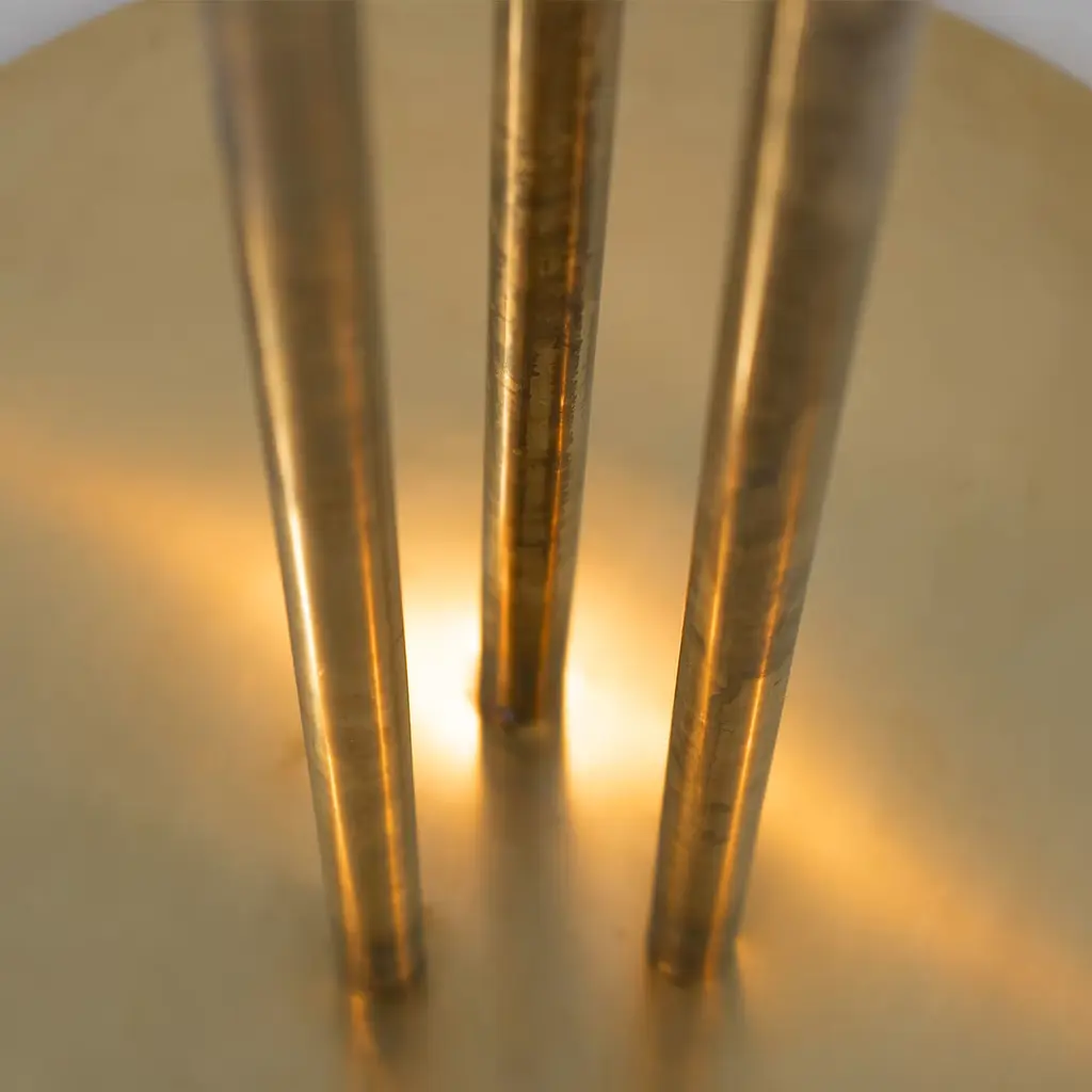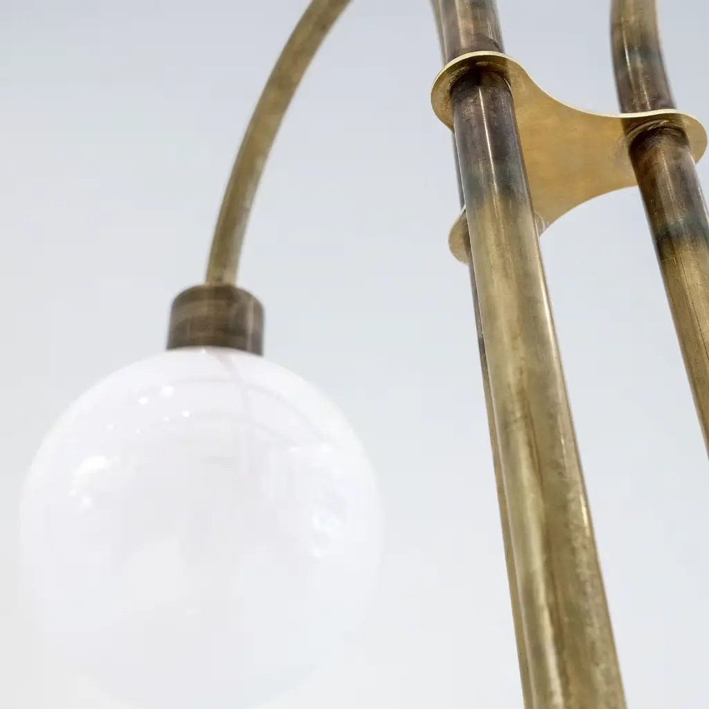 The Habiba floor lamp features three curved brass stems, each delicately holding handblown Murano glass boules. The glass, with its fading white tint, softens and diffuses light, creating an intimate and warm atmosphere. Crafted with Murano glass and natural brass, the design is a harmonious fusion of craftsmanship and timeless elegance. Custom sizes and finishes available on request. Bulb are included.