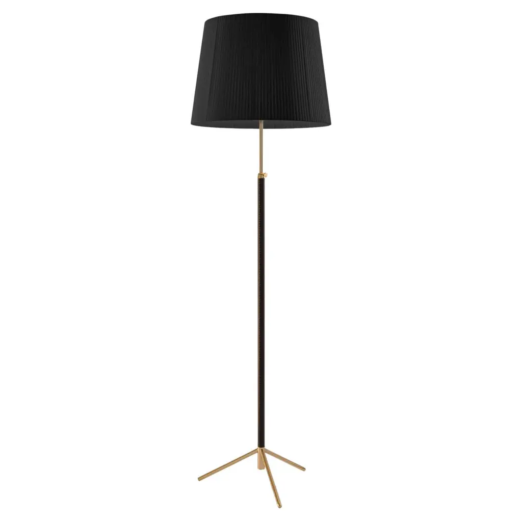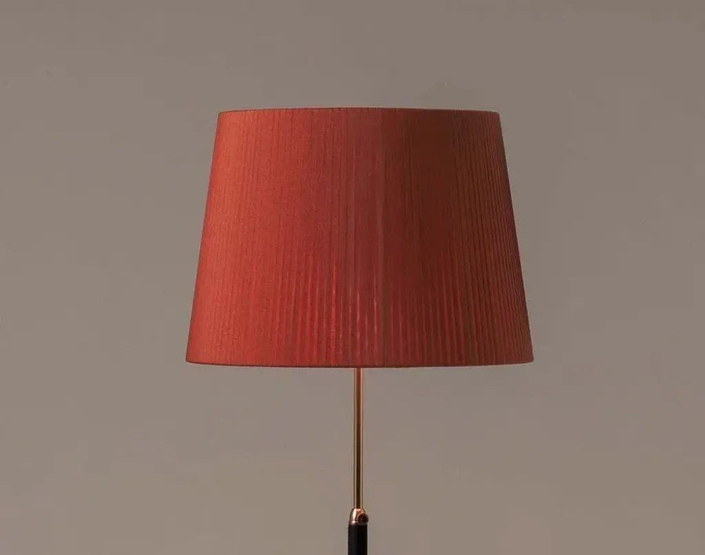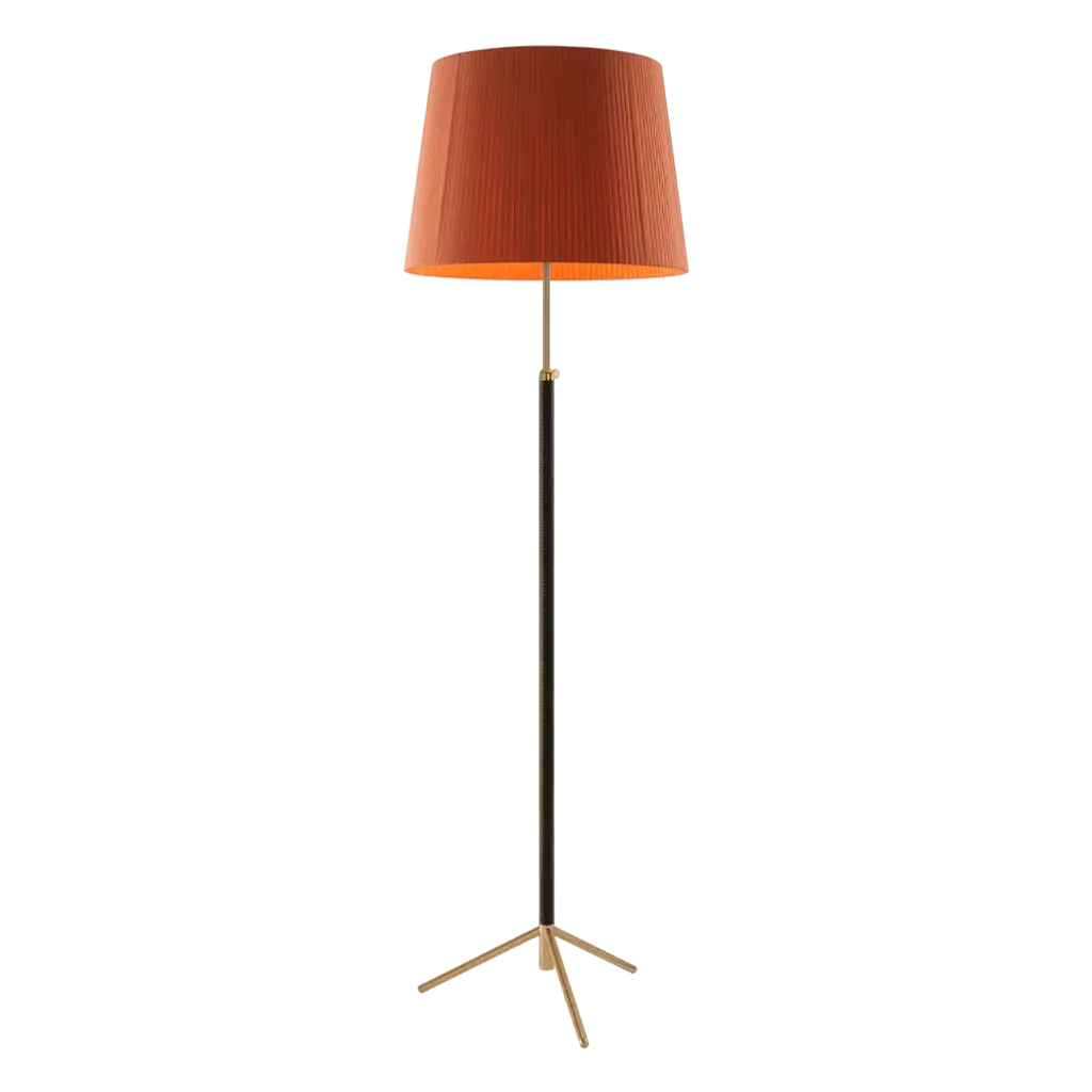 Red and brass pie de salón g1 floor lamp by jaume sans. Dimensions: d 45 x h 120-160 cm. Materials: metal, leather, ribbon. Available in chrome-plated or polished brass structure. Available in other shade colors and sizes. This slender synthesis of traditional lamps is a sparkle of timeless elegance created in a context of the avant-garde. The combination of materials with its symmetrical, leather-wrapped centre shaft, its choice of three shade materials and eight colour options make it a paradigm of industrial craftsmanship. Height adjustable lampshade. Dimmer included. this piece is attributed to the mentioned designer/maker. It has no attribution mark and no official proof of authenticity, however it is well documented in design history. I take full responsibility for any authenticity issues arising from misattribution, up to 250v (europe/uk standard).
