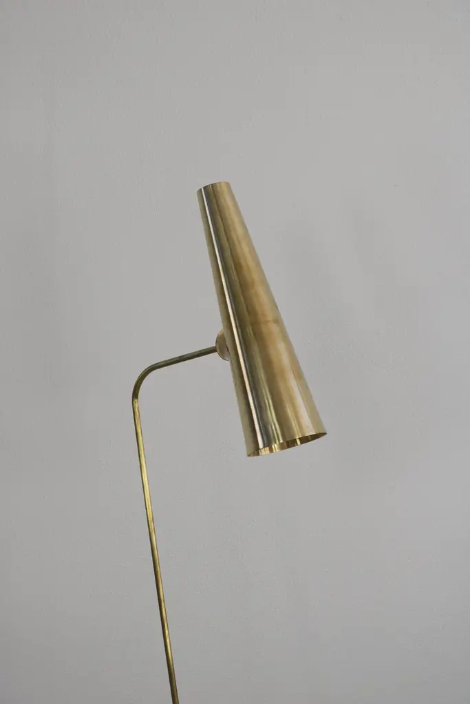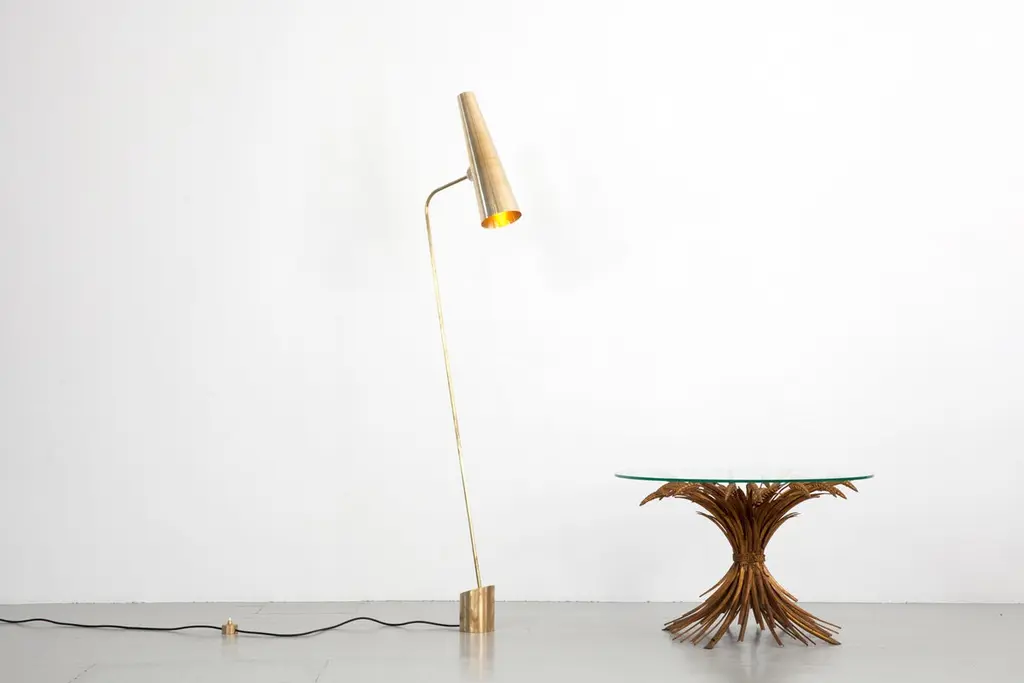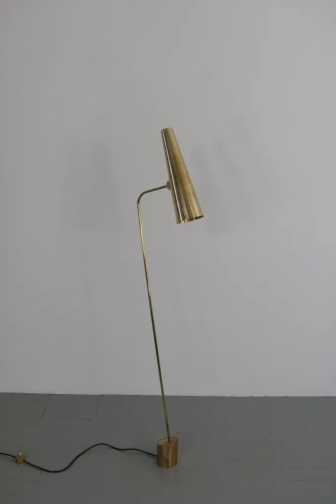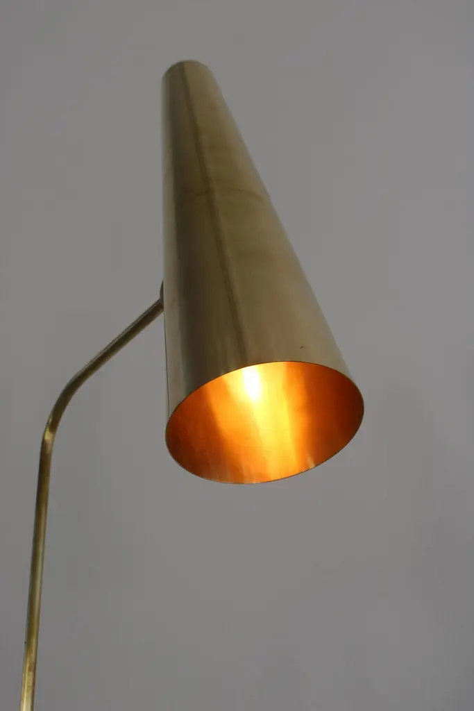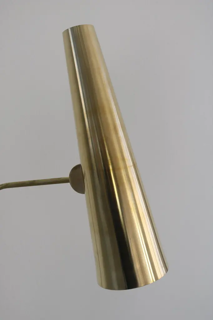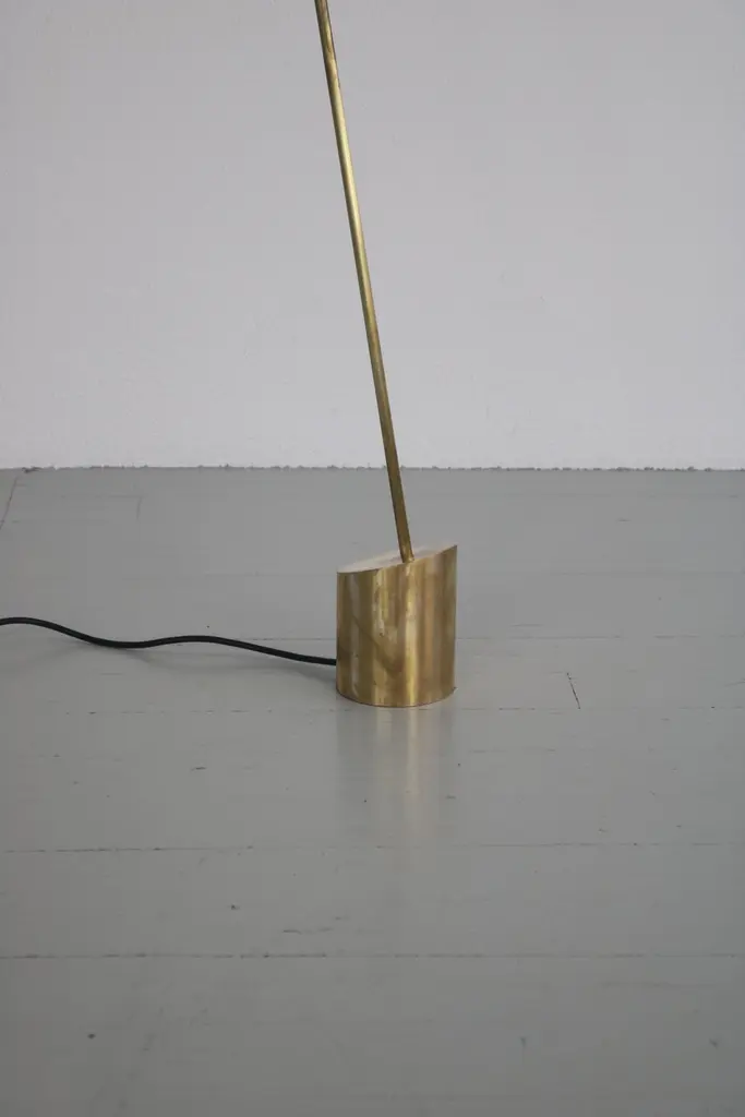 The elegant handmade model called "Tozzo" is composed of a stabile brass cylinder under the typical, Fine curved body, followed by an also typical conical natural brass lampshade. All in all that brings a height of about 150 cm.The brass is untreated and it gets over time a nice patina if it is not polished regularly.Feel free to contact us for more detailed pictures.