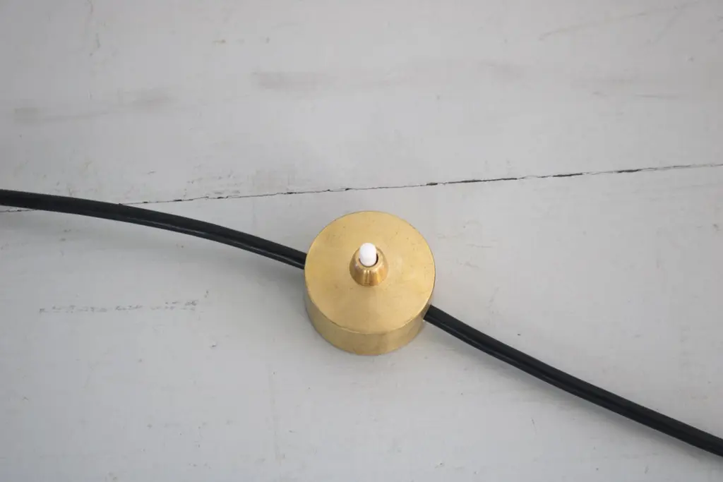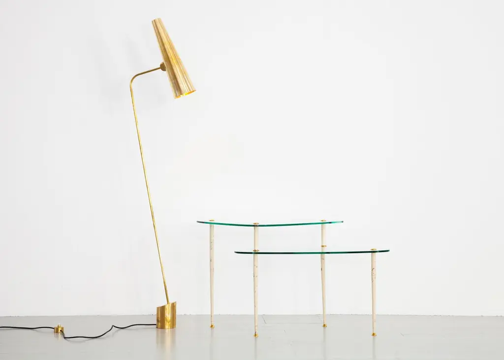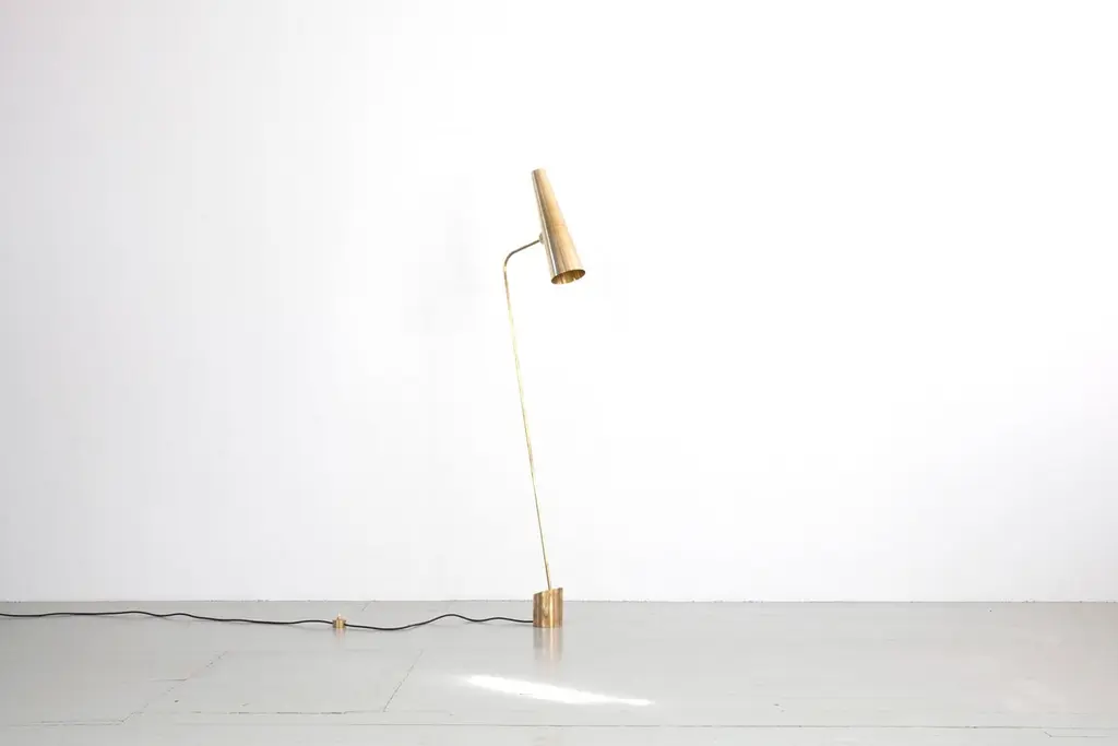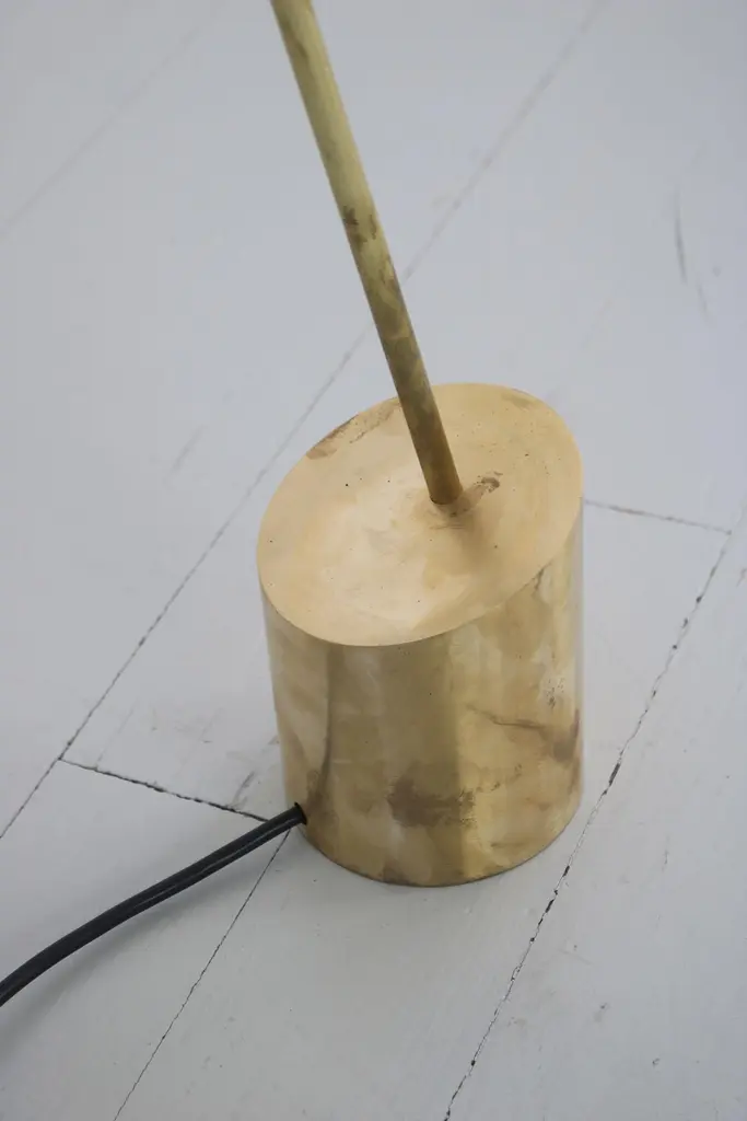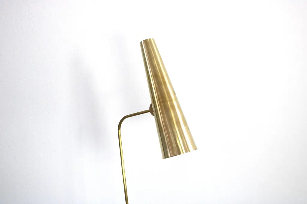 The elegant handmade model called "Tozzo" is composed of a stabile brass cylinder under the typical, Fine curved body, followed by an also typical conical natural brass lampshade. All in all that brings a height of about 150 cm.The brass is untreated and it gets over time a nice patina if it is not polished regularly.Feel free to contact us for more detailed pictures.