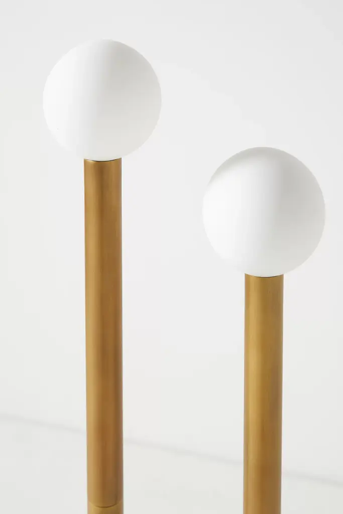 Playfully modern, this floor lamp features a tubular steel silhouette topped with two matte glass globes that emit a soft, illuminated glow. *This item is UL listed, meaning it has been tested and approved to meet the government-regulated safety standards for the USA. Use with electrical outlets 110-120v or lower, as anything higher can cause fire or injury. If you're purchasing this item for use outside of the United States, employ the adapter and voltage converter suited for your country.*