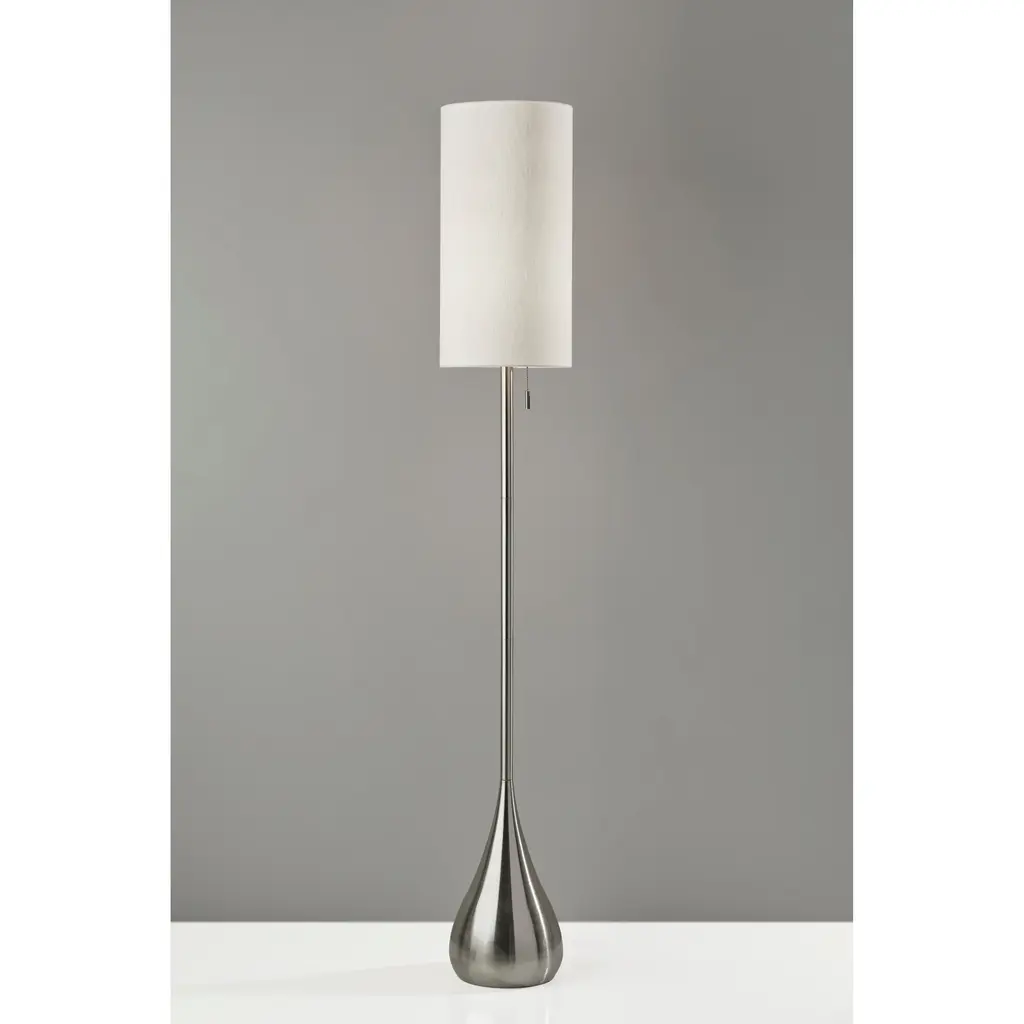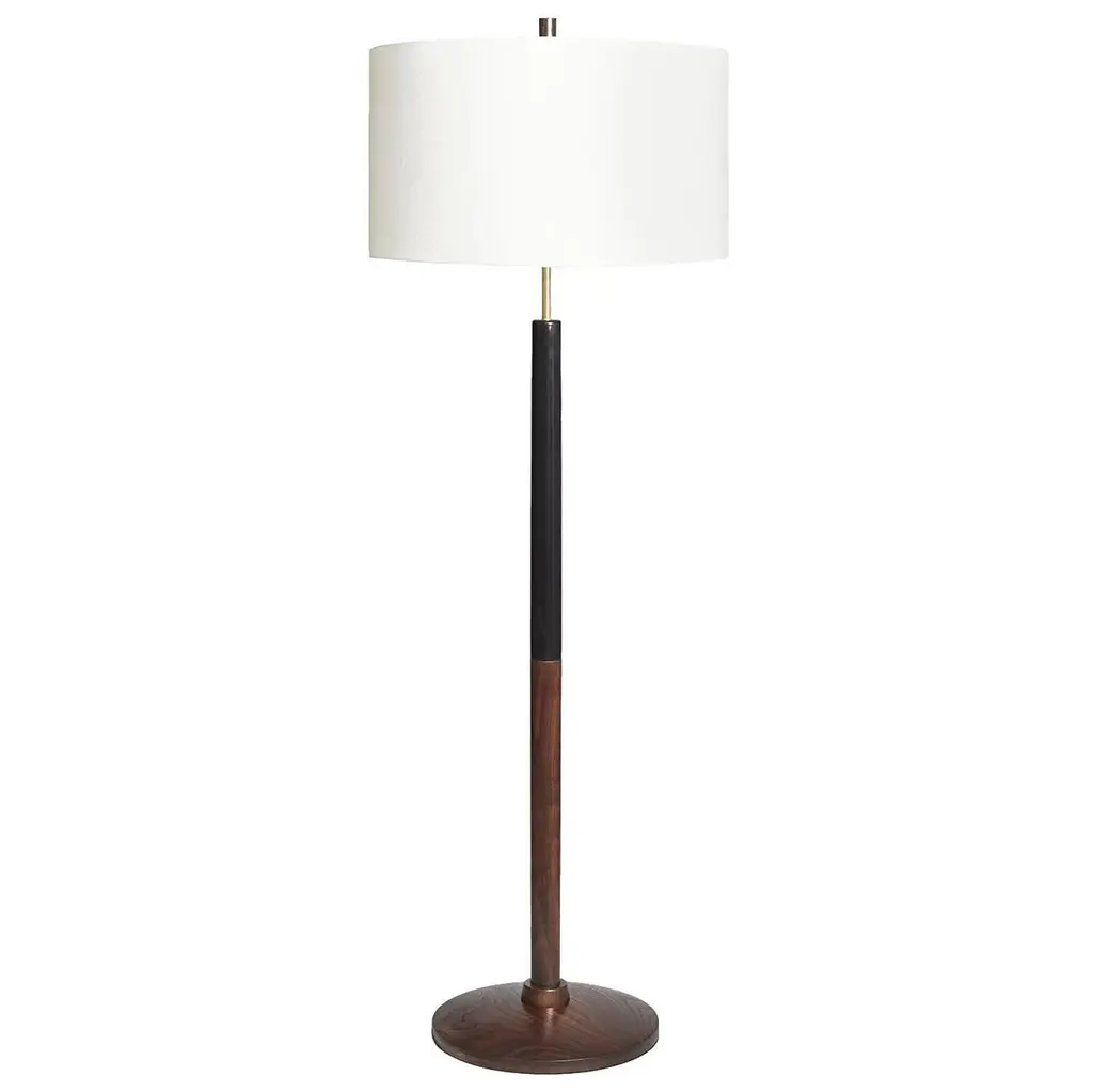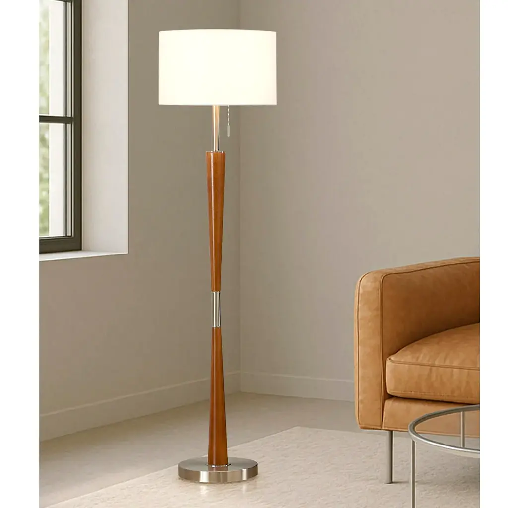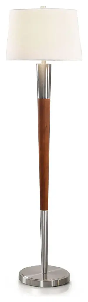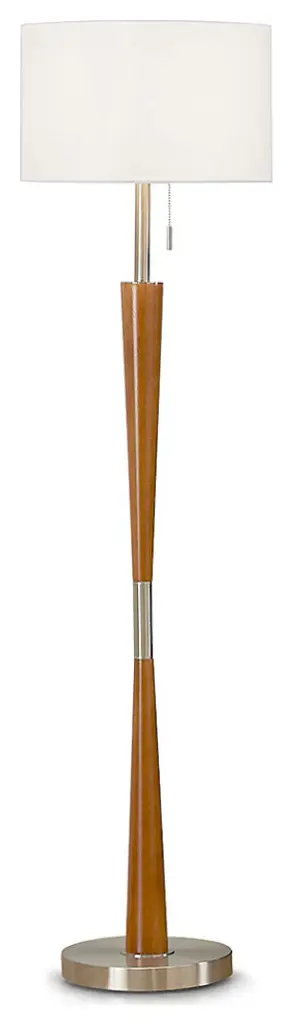 Pairing warm woods with cool metals is a hallmark of Mid-Century Modern style. The elliptical wood pole and finial complement a satin-finish steel base; a white fabric drum shade ties it all together.