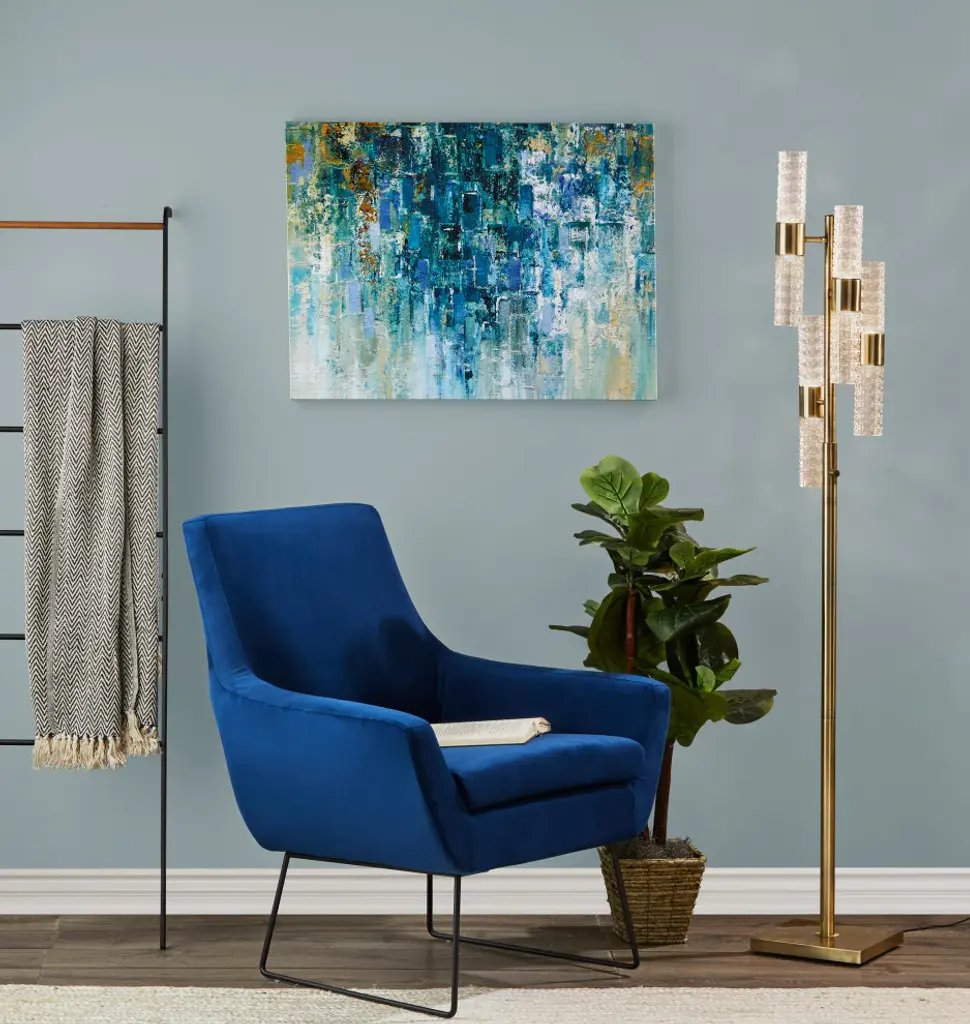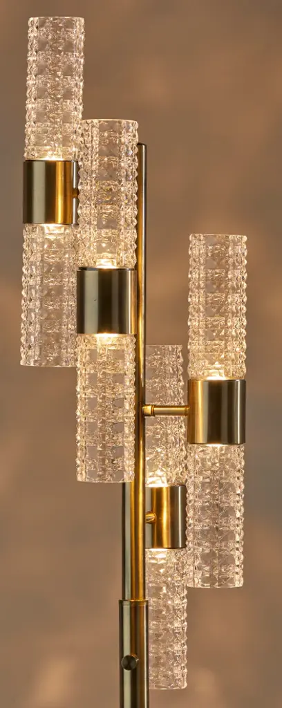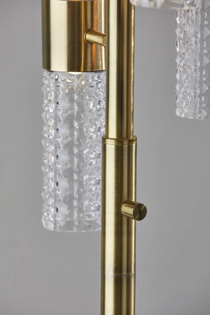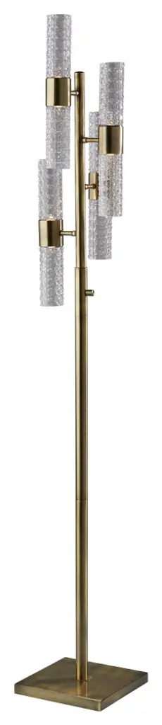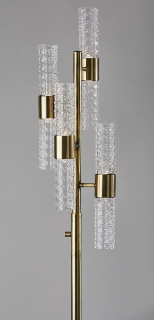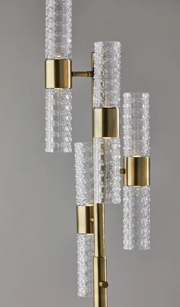 Catch the eye of all your guests with the Harriet LED Floor Lamp. A classy antique brass base and pole holds up eight tall, skinny textured glass cylinder shaped shades that are staggered to create an intriguing silhouette. The warm, energy efficient LED light reflecting off of the carefully cut glass creates a striking, artistic glow. Place this lamp in your bedroom or living toom for soft, ambient lighting and a pop of glamourous, mid-century style. A full range rotary dimmer switch on the pole allows you to easily access your desired brightness.ETL TestedDry RatedUses: 8 x 4W LED BULB INCLUDEDFull Range Dimmer Rotary Dimmer Switch on Pole