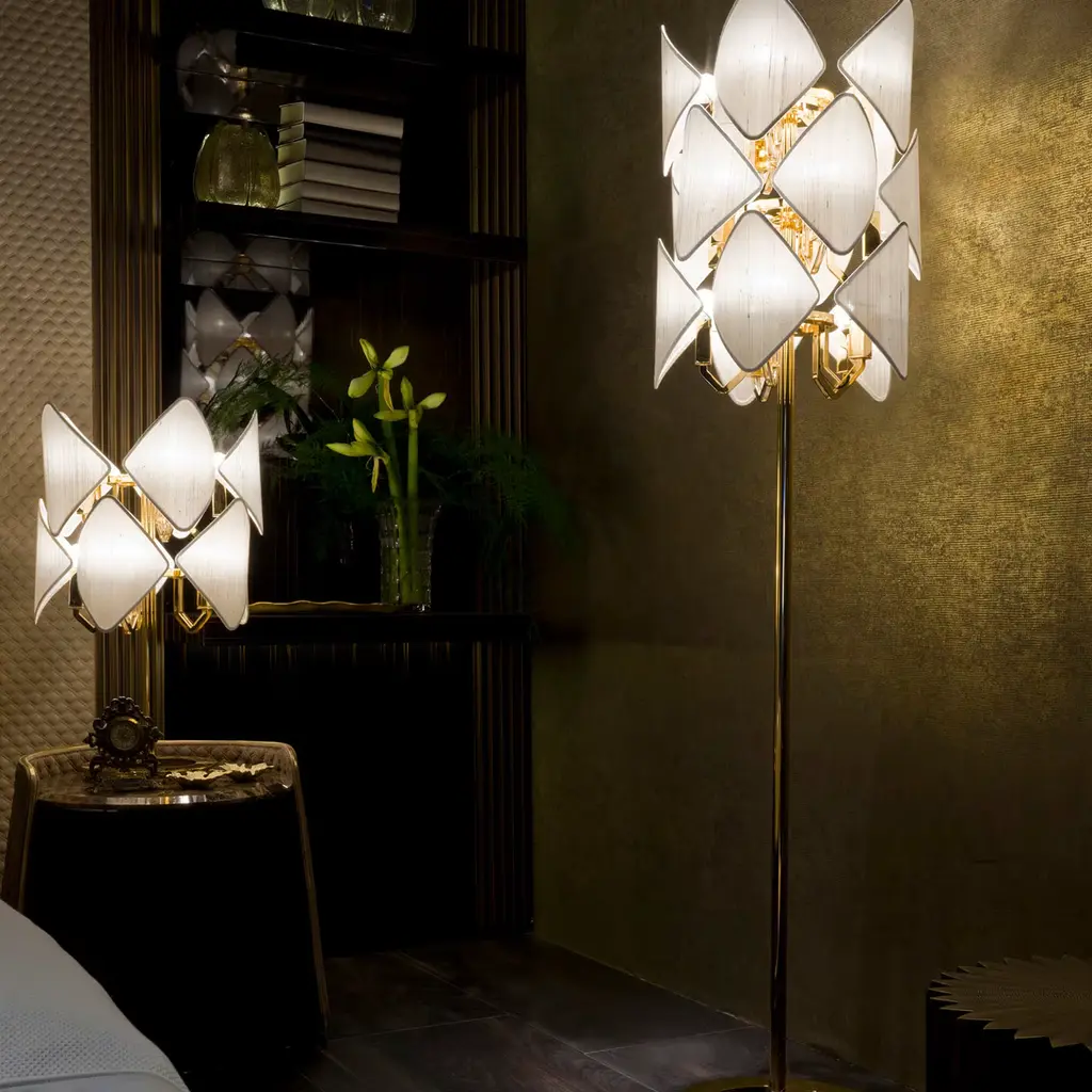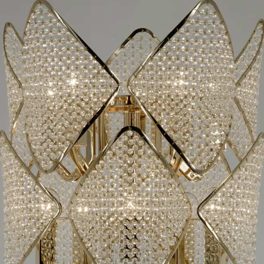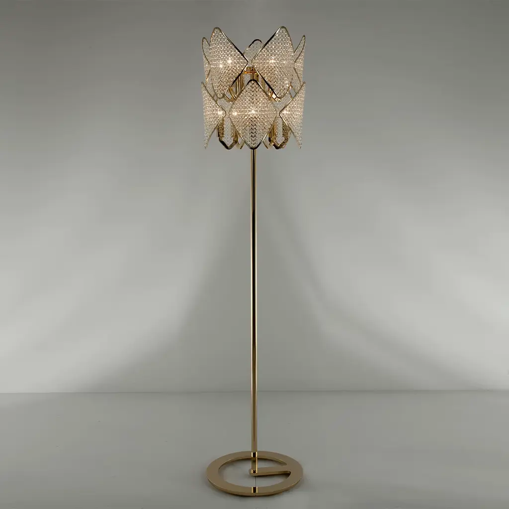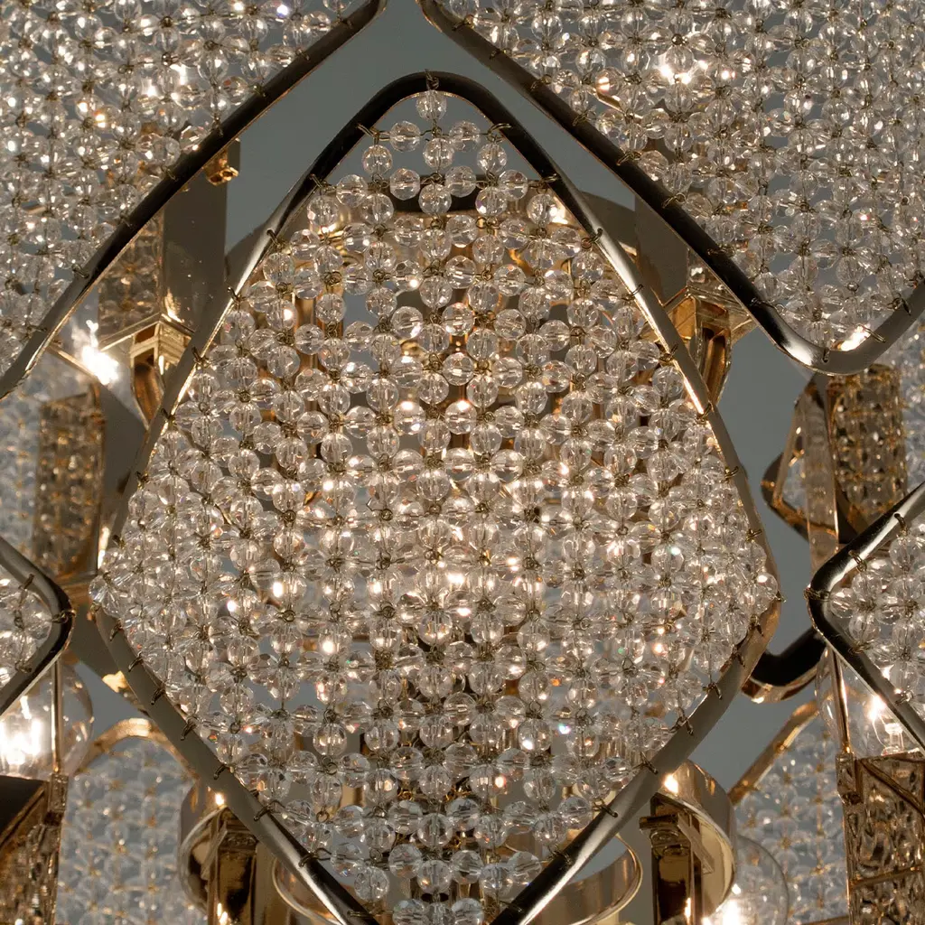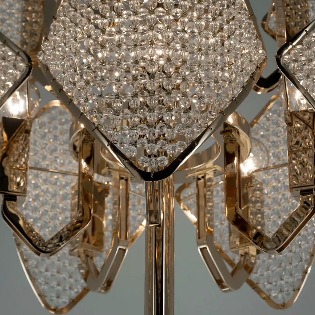 The models are obtained by arranging the rhombuses over ring-like elements of different diameters and reminding them of top-level gold working. The modules, set ajar, look like precious gems variously mounted like bracelets, rings, or parures. The choice of color nuances and metallic finishes is thought always to obtain combinations that glorify the preciousness of the artifact. 10-light floor lamp. Bulb not supplied. Available in custom sizes and finishes. Metal and crystals. Gold plated and cut clear pearls.