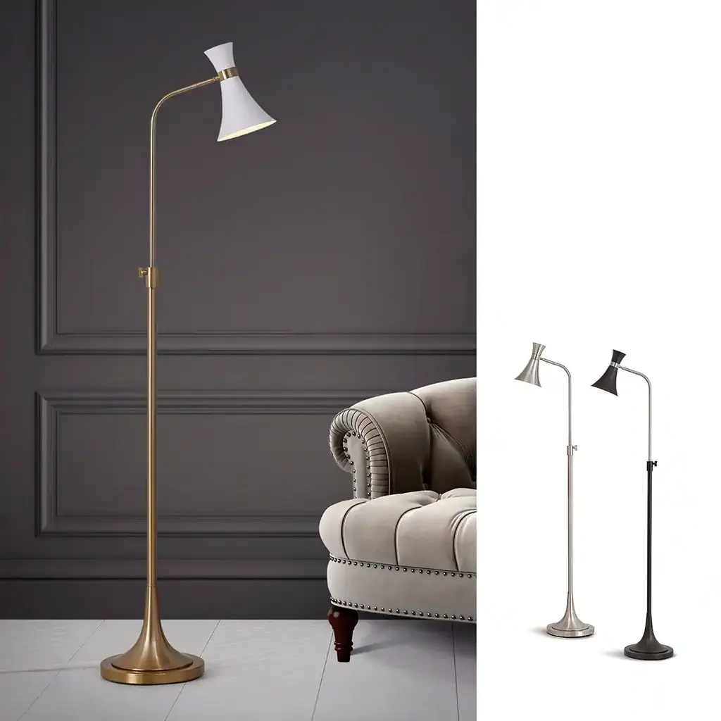 HOMEGLAM design, the Bonnie modern classic design metal floor lamp with swiviable light arms, tiltable lamp shades and easy control 4-way rotary switch. It is a perfect additions to light your space with function and styleFeatures: • Adjustable 70"H, swivel one light metal floor lamp • 6.5"ø tiltable metal lamp shade, 11.75"ø heavy weighted base • On/off inline foot step switch • Uses one A19 60W max. equivalent LED led bulb, *Bulb not included • 110V, UL Listed, Assembly required