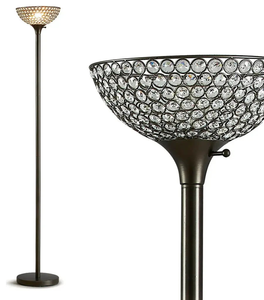The supreme elegance of this torchiere floor lamp is sure to dazzle all who look upon it. The heavy metal construction is adorned with a crystal shade for a touch of decadence and glamour. A three-way rotary switch offers easy operation for this lovely addition to home illumination.Features:Metal torchiere floor lampClear crystal glass lamp shade11-inch lamp shadeHeavy weighted lamp baseHeavy metal construction3-way socket rotary switchUses one E26 baseA19, 3-way 150 watt max incandescent or LED bulb (not included)UL listed Assembly requiredBrushed nickel or dark bronze finish options11 inches in diameter x 71 inches high