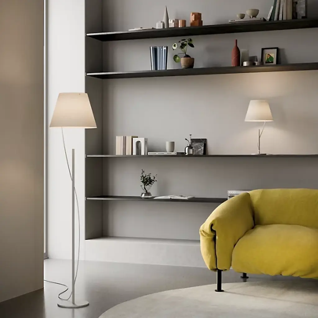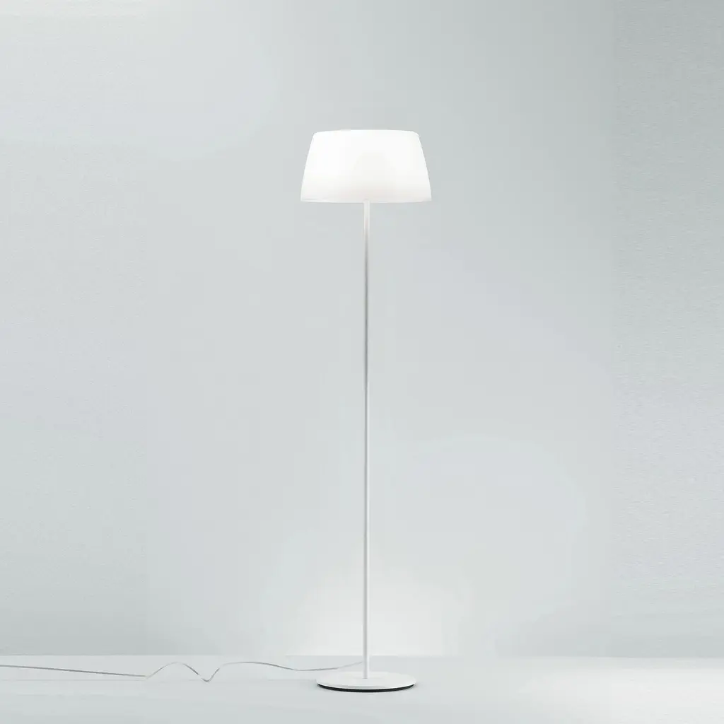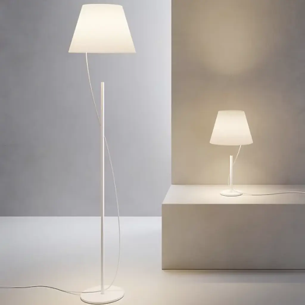 The Hover LED Floor Lamp by LODES stands out with its distinctive contemporary flair. A creation from designer YOY, it is made with precision from aluminum, its shade featuring a distinctive paper material. The design creates an enchanting illusion where the lampshade seems detached from the base, connected by a single cable gracefully traversing the stem and emerging on the other end. This artistic arrangement produces a mesmerizing effect, making the light source appear almost weightless and suspended in mid-air, reminiscent of a gracefully floating balloon.