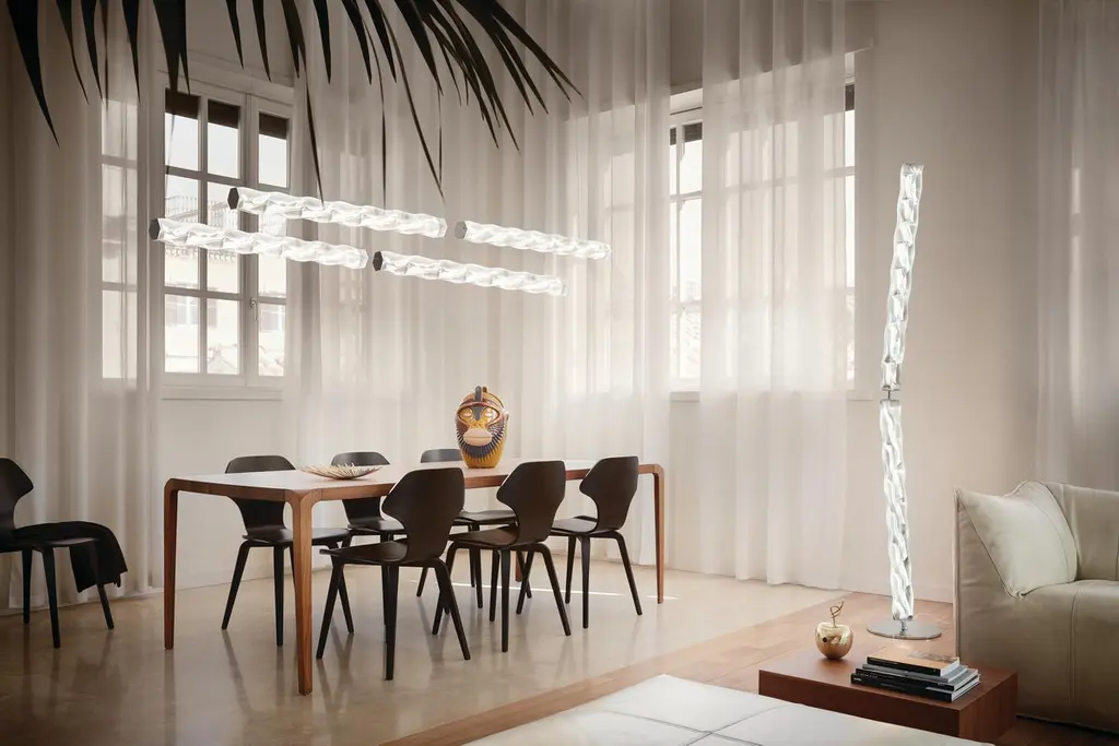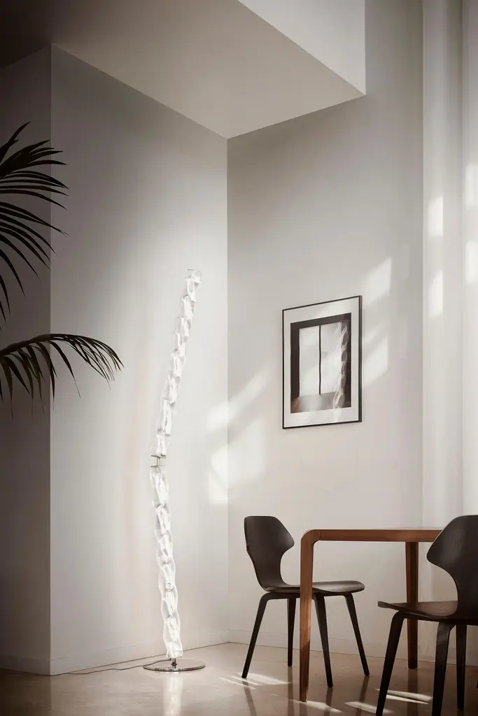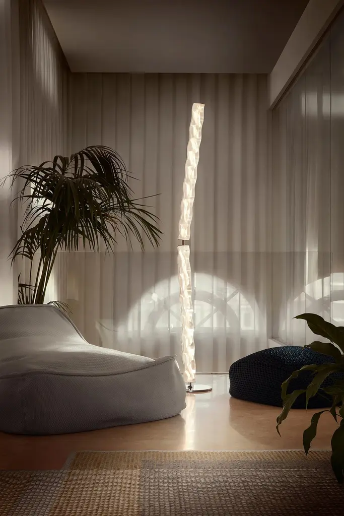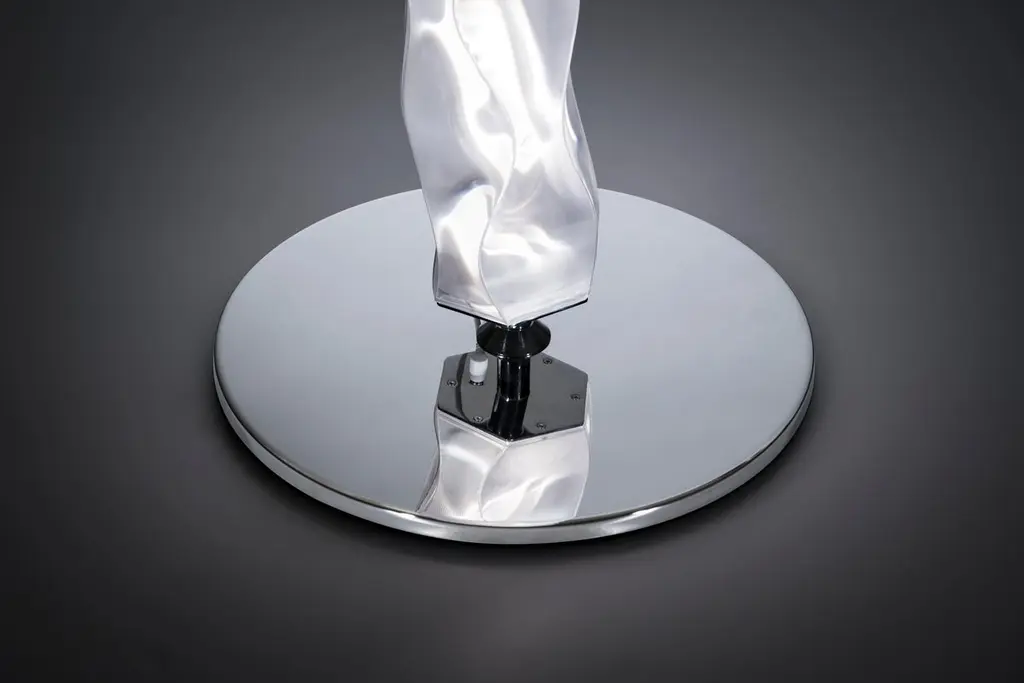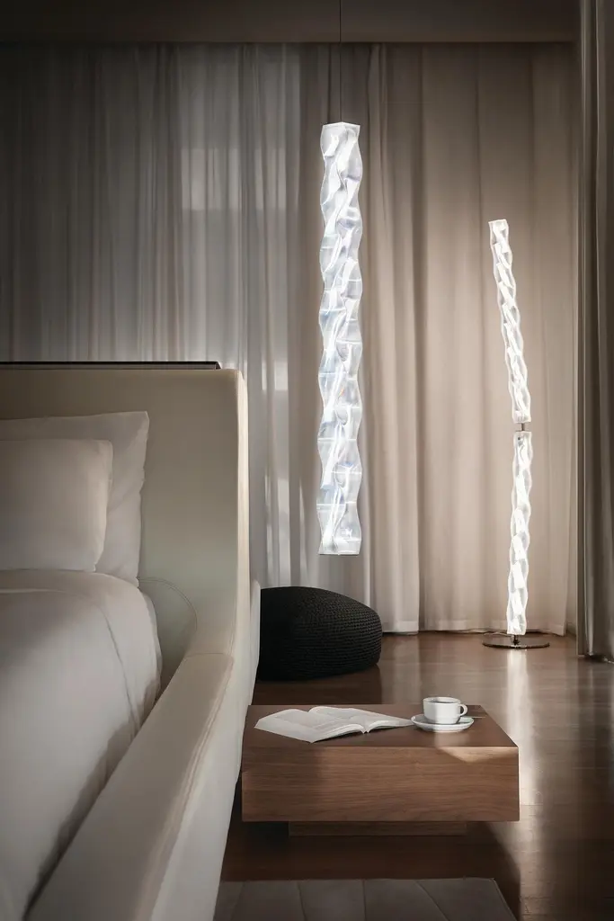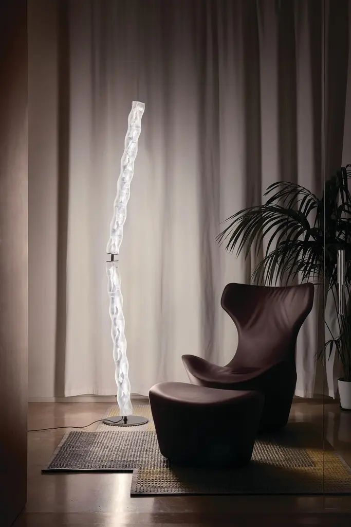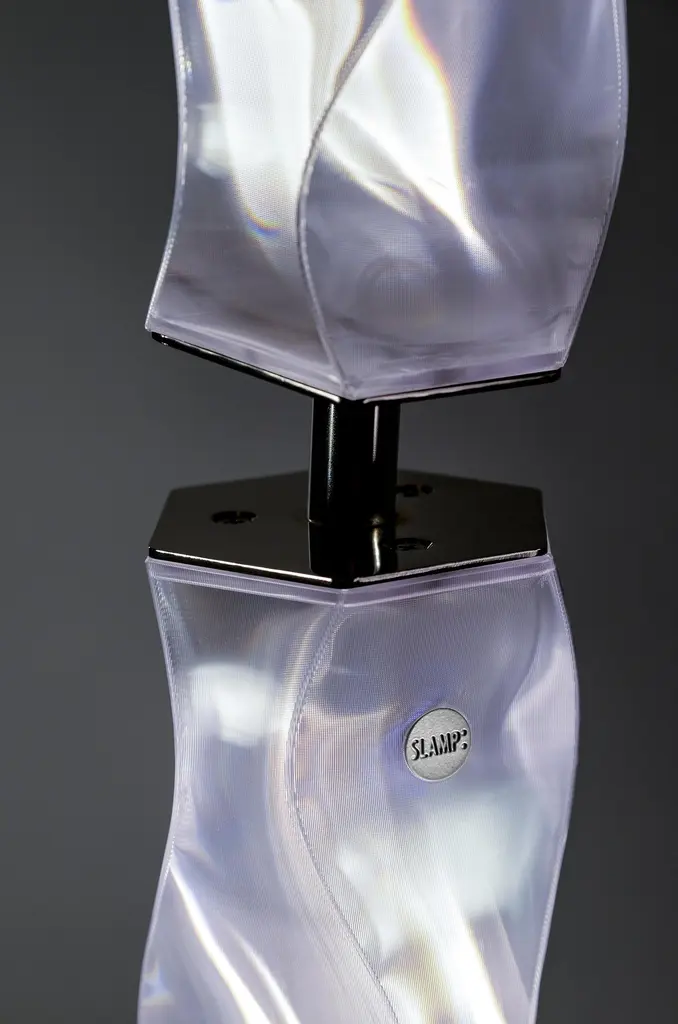 Solid, yet fluid: the magical effect is created with an invisible steel frame hidden under layers of Slamp’s innovative Lentiflex®, a material that liquifies LED illumination. The light is transformed into a soft, uniform, almost weightless, floating glow. The design and bend of the floor lamp were inspired by the outreached hands of Michelangelo’s “Last Judgement” in the Sistine Chapel. The light touch dimming system is ergonomically placed, and blinks when the lamp is at minimum and maximum brightness. Just like the Hugo, Hugo Vertical, and Hugo Architectural system, Hugo Floor respects the UNI EN 12464 standard for office illumination. The transformer plugs in and the cord is black to avoid showing any dirt while resting on the floor. It’s very easy to assemble: the two modules have a pre-set inclination, and simply connect together.Size: 32 cm x h. 207 cm / 12-3/4” x h. 81-1/2Made of: Technopolymer / Lentiflex - Stainless StellWith: integrated dimmerIntegrated LED source 40W - 7000 lumen - 3000k - dimmable