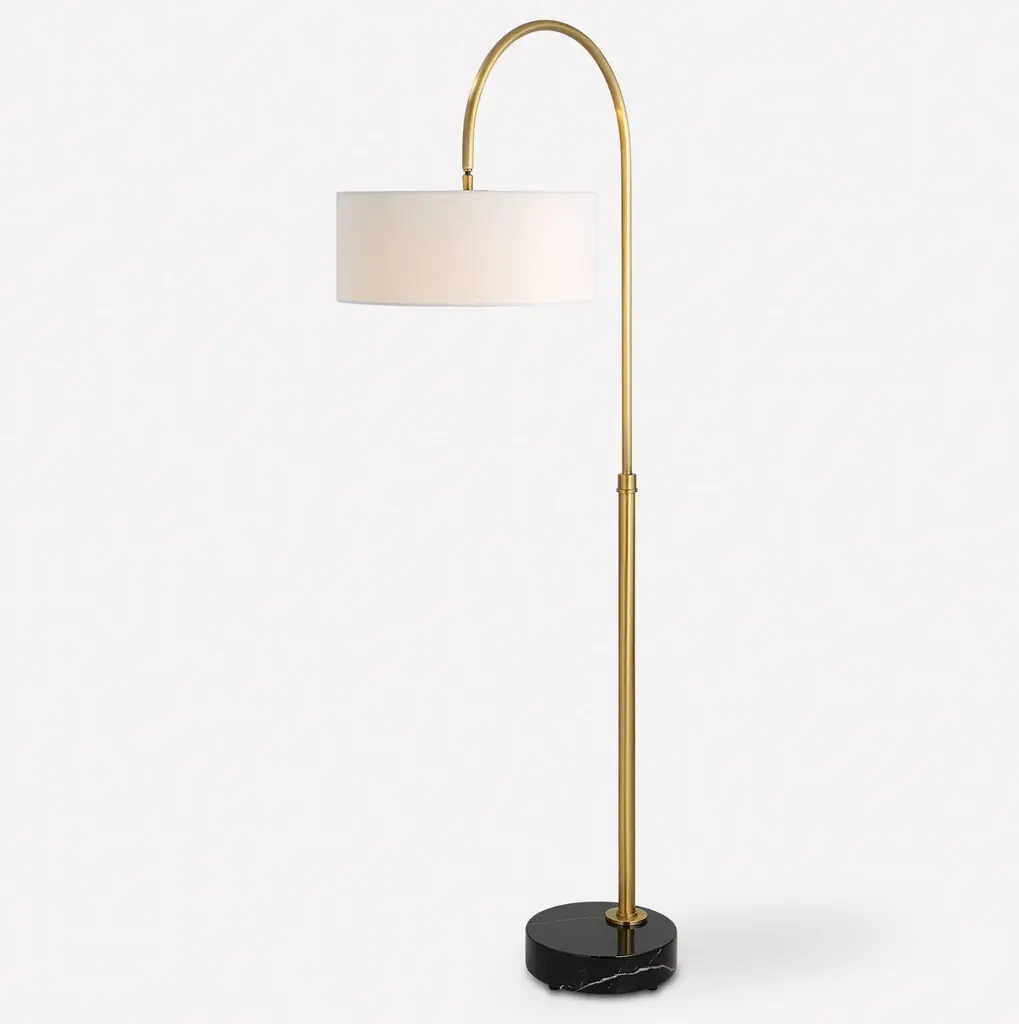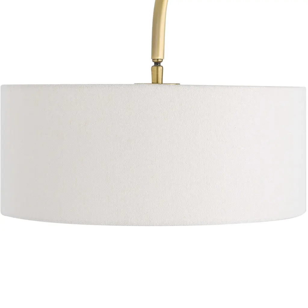 Constructed from iron with a luxurious plated antique brushed brass finish, the Huxford floor lamp features a traditional arc design and a pivoting neck, providing the option to adjust the angle of the shade. It is elegantly paired with a sleek black marble base, showcasing natural veining, and a round hardback white linen shade for a timeless look.