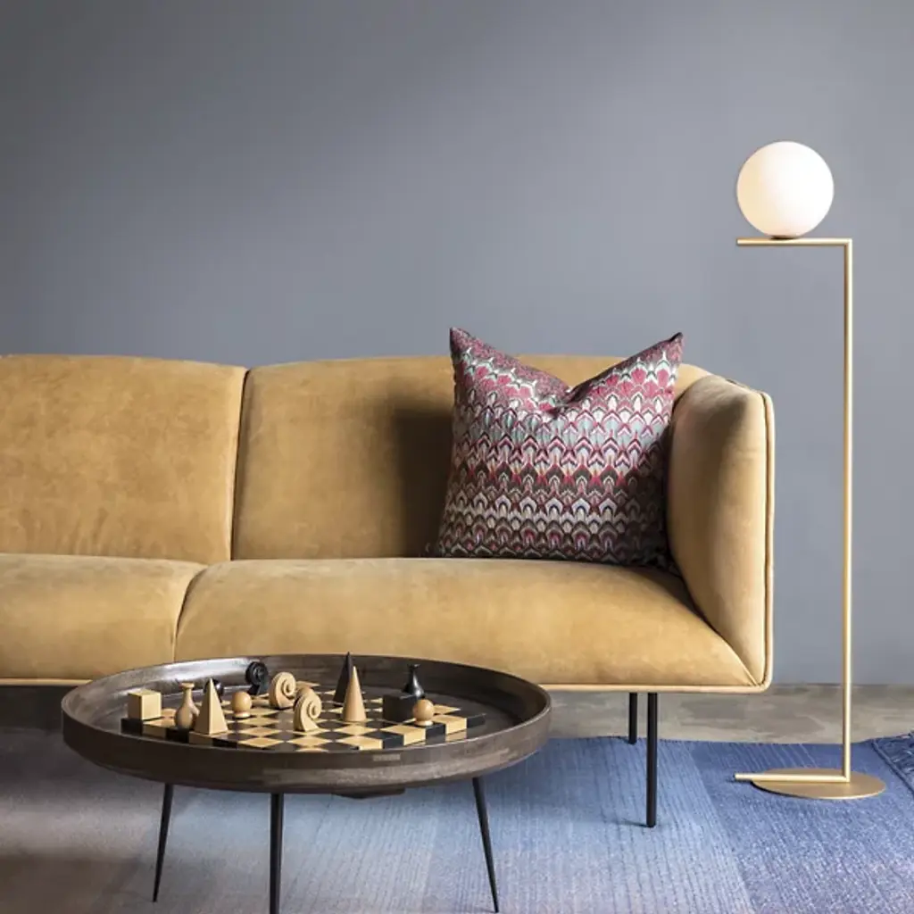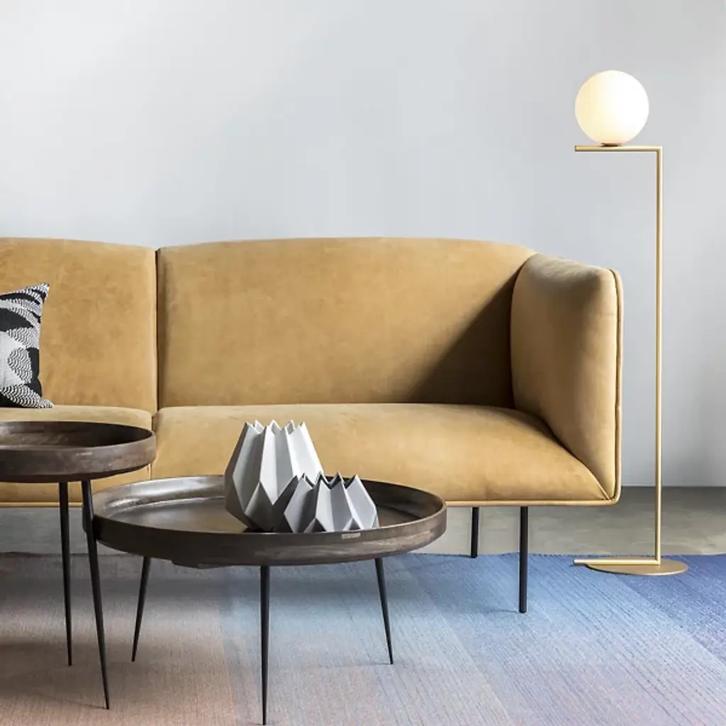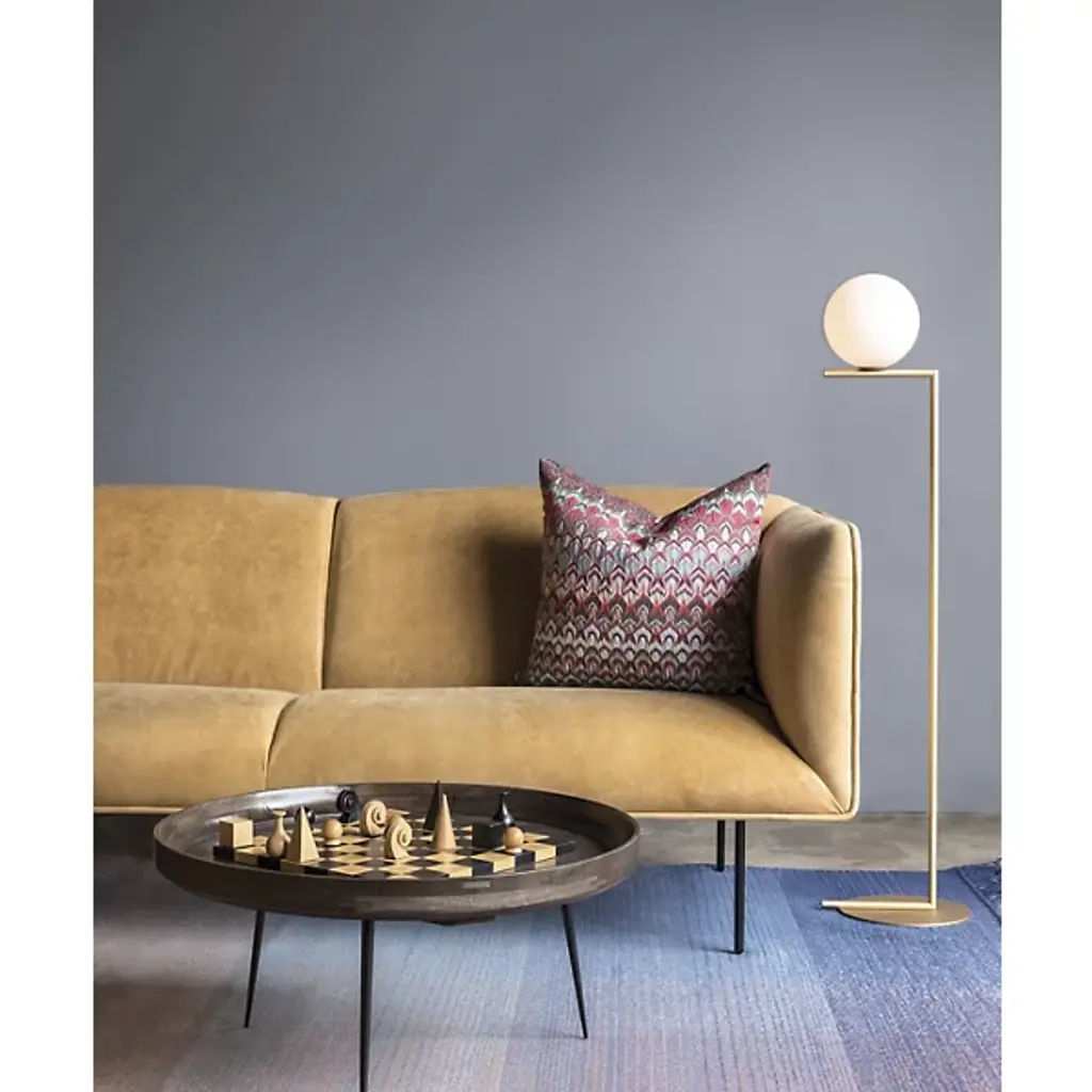 Perched on a slender metal arm, the spherical diffuser of the Flos IC Floor Lamp relies on careful engineering to balance easily on its minimalistic frame. The opal shade diffuses the light warmly, playing off the metallic finish of the bracket shaped stem. Seeming to defy normal laws of physics, the unusual form and balancing act invites curiosity even when not lit.