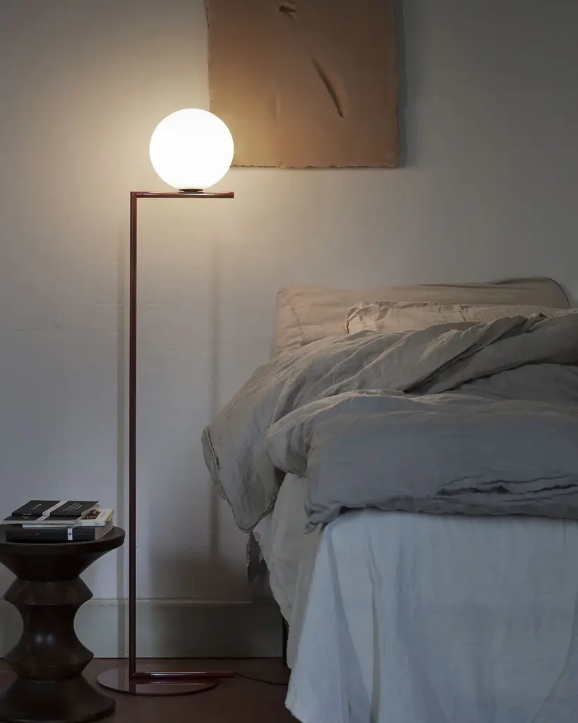 Radiant light, delicate balance: Like the other pieces in his IC Light Series, the IC Lights floor lamp showcases designer Michael Anastassiades' love of industrial simplicity as well as his profound technical skill. The IC floor lamp from FLOS is a case study in balance. After watching a video clip of a contact juggler, designer Michael Anastassiades was inspired by the skill it took to spin and move the set of spheres around the juggler's body. His starting point was to capture the moment where the spheres seemed to freeze in place on the juggler"s arms and edge of his fingers, thus was born the IC collection. FLOS lighting has been crafting incredible Italian objects of light since 1962. Playing with light (and its absence) is fundamental to the well-thought "flosophy" of FLOS. Combine this exploration of light with bold experimentation in shape, material and LED technology-plus the iconic ideas of international-acclaimed designers-and the result is poetic functionality at its best. Emitting a warm and beautiful diffused light, this contemporary indoor floor lamp features a blown opaline glass diffuser. The body is brass- or chrome-finished steel. There is a dimmer on the power cord. IC Lights floor lamp comes in two models and is available in black, brass or chrome finish:- IC Lights F1: 53" H- IC Lights F2: 73" H Inspiration behind the design: Poise is powerful: That's the message Michael Anastassiades offers with his IC Light Series. From the skillful balance of the sphere and baton that invokes thoughts of a dexterous juggler's act to the lamp's name-IC, a reference to the identity code used to evaluate immigrants entering the UK-the designer makes a commanding statement.