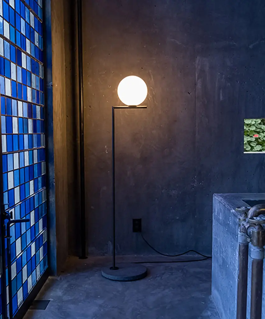 Designed by Michael Anastassiades in 2014, the IC lighting collection explores balance and simplicity of materials. For this minimalist collection, designer Anastassiades took inspiration from a video of a contact juggler spinning a set of spheres, balancing them around on his arms, and moving them to the tips of his fingers. Bulb not included. 5-m cable with Schuko IP44 plug suitable for outdoor use. Backlit floor dimmer switch on the IP65 cable enables ON/OFF function and brightness regulation 30-100% (with dimmable LED bulb). This authentic design is produced in Italy exclusively by Flos.