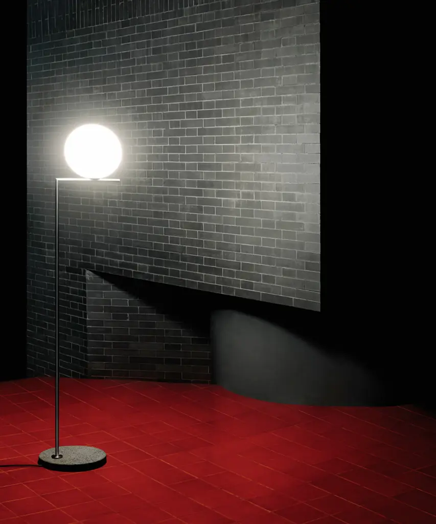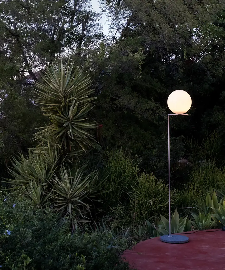 Designed by Michael Anastassiades in 2014, the IC lighting collection explores balance and simplicity of materials. For this minimalist collection, designer Anastassiades took inspiration from a video of a contact juggler spinning a set of spheres, balancing them around on his arms, and moving them to the tips of his fingers. Bulb not included. 5-m cable with Schuko IP44 plug suitable for outdoor use. Backlit floor dimmer switch on the IP65 cable enables ON/OFF function and brightness regulation 30-100% (with dimmable LED bulb). This authentic design is produced in Italy exclusively by Flos.