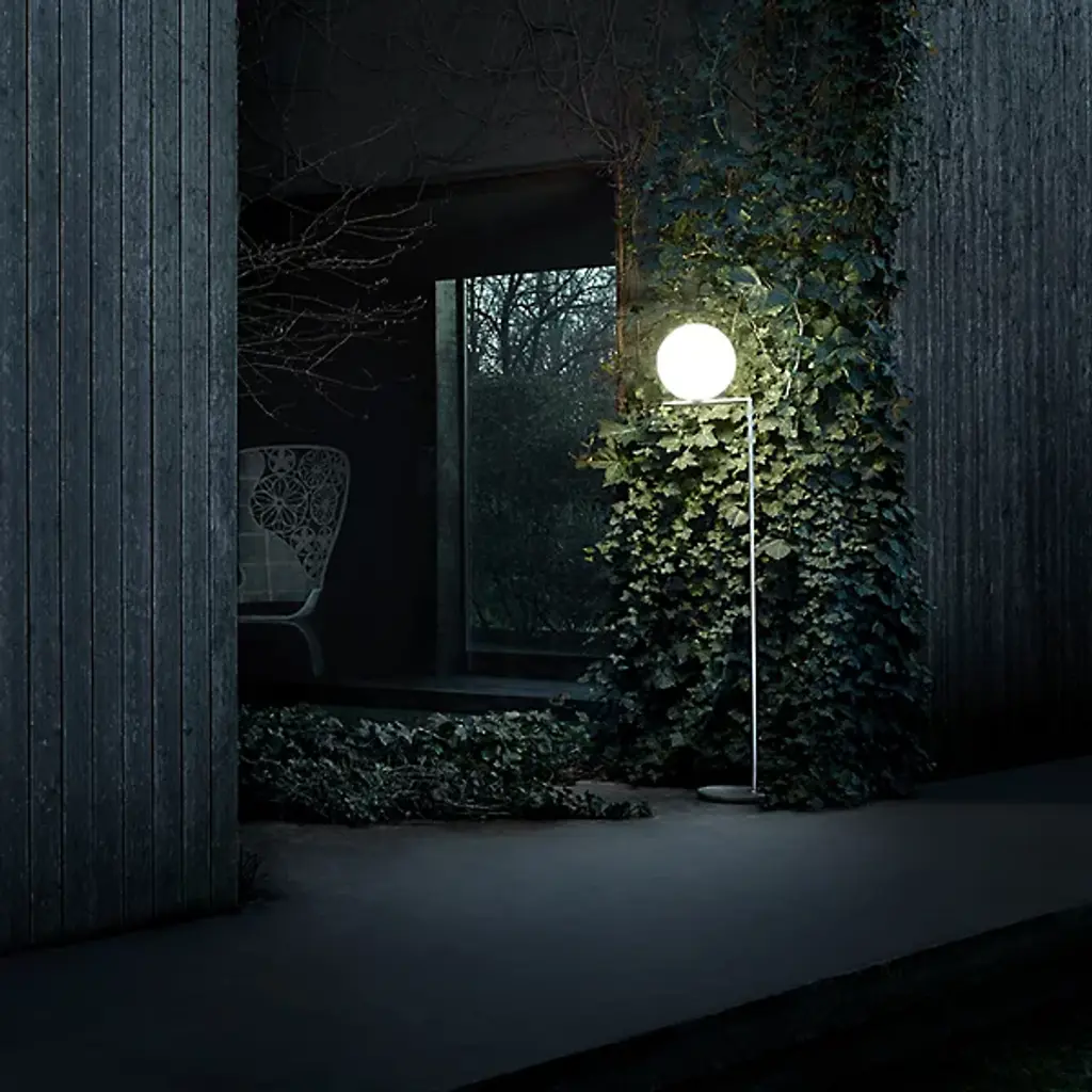 An elegant balancing act captured in time with shape and light. The IC Lights Outdoor Floor Lamp from FLOS is a minimalist piece conjured up by designer Michael Anastassiades as he studied the mesmerizing movement of a juggler's seemingly floating array of objects. The juggler ball carries the same charming spirit with this design's blown glass shade. Its metal frame stands gracefully with a focused figure, balancing the glass sphere with razer-sharp precision. A clean LED light shines through the sphere in a showstopping glow. An Italian stone base brings stability to the figural frame and a sophisticated surface.