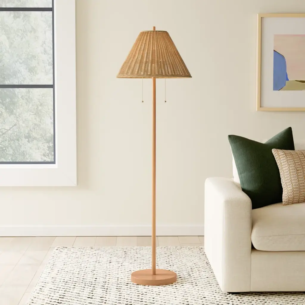 Our mid-century-inspired rattan floor lamp has a modern, conical shade that adds tropical chic to any room. Use two LED bulbs to provide bright light for reading, or light just one for a moody ambiance. This classic lamp adds a retro touch to the living room, bedroom, or home office.