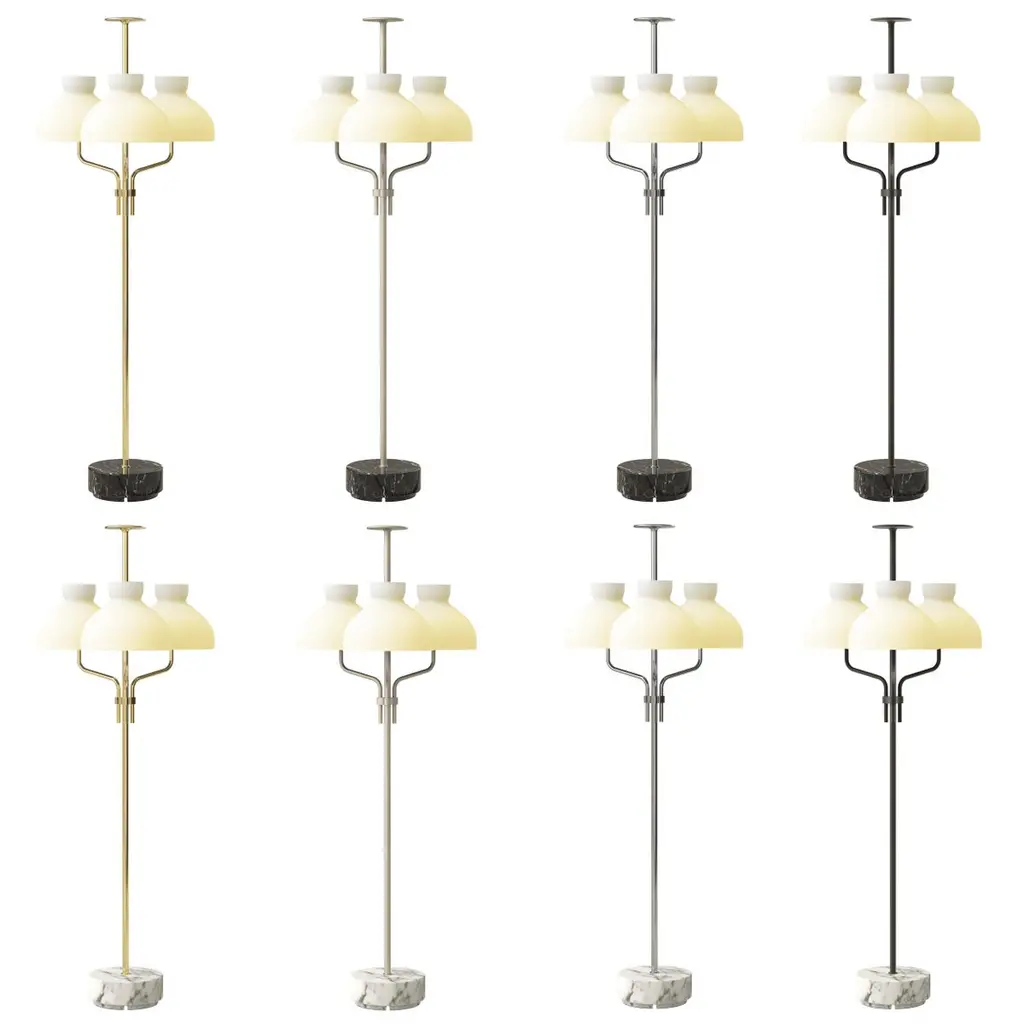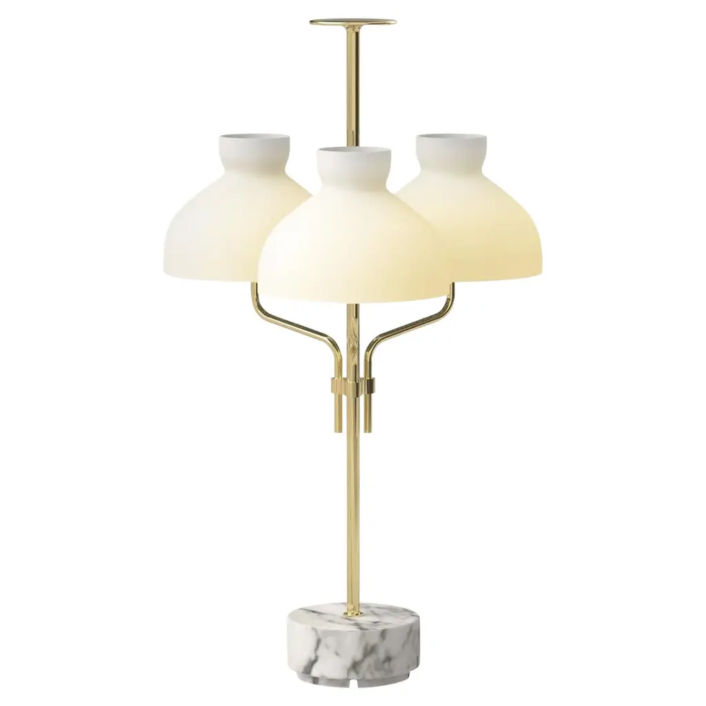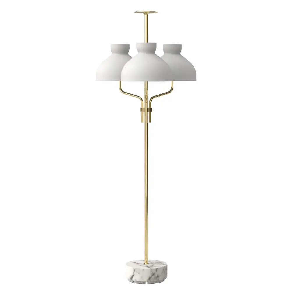 Ignazio Gardella 'Arenzano Tre Fiamme' Floor Lamp in White Marble and Brass.Ignazio Gardella was one of the leading figures in Italian twentieth-century architecture. A graduate of the Politecnico di Milano, he founded Azucena with Luigi Caccia Dominioni and Corrado Corradi Dell’Acqua in 1947. A renowned architect, he continued producing iconic furniture and lighting designs until the 1990s.Originally designed by Gardella in 1963 for Azucena, this authorized Tato Italia re-edition is executed in polished brass and white Carrara marble with three Venetian blown opaline glass diffusers.Price is per item. Available in unlimited quantities in choice of brass, chrome, satin bronze, or satin nickel stem with black Marquinia or white Carrara marble base. Prices vary; kindly inquire for more information. This listing is for the brass variant with white marble base.In stock lead time 12-14 weeks. Out of stock lead time can add an additional 10 weeks or longer. Please note that inventory availability subject to change without notice. For time-sensitive orders, kindly inquire prior to purchasing.Each shade accommodates 3x US E12 candelabra base bulbs max 5W LED, (nine total bulbs, not included). Not UL listed, but recommended UL listing possible from an authorized 3rd party vendor for an additional cost. Contact us for more information.Made to order. All sales final.