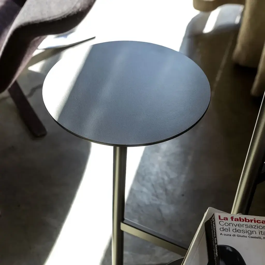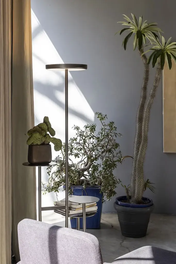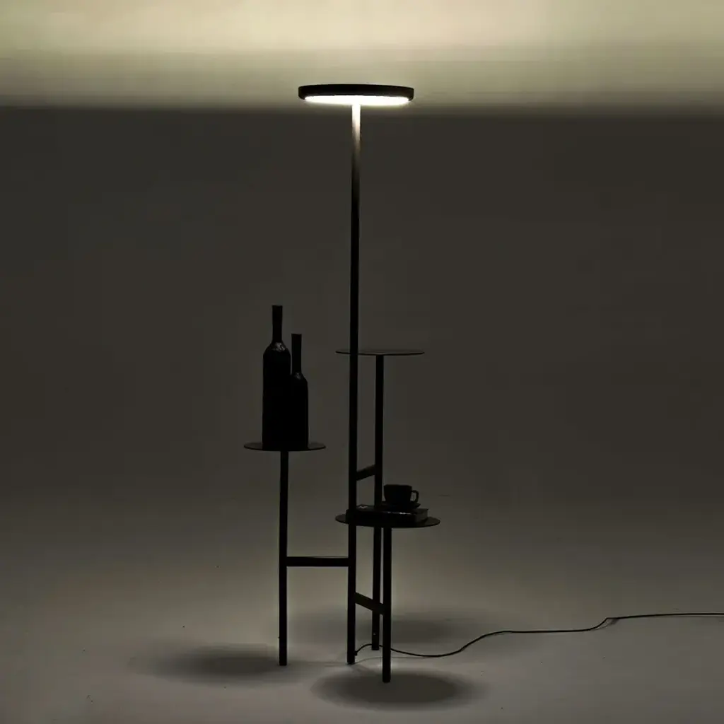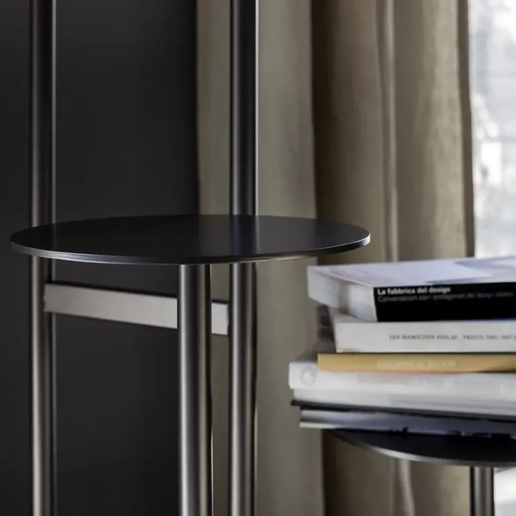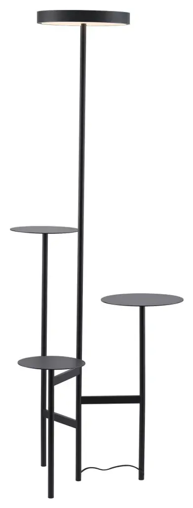 Ikebana Piantana is a floor lamp in matte black painted metal with dimmable LED lighting. The floor-standing version with dual light includes three display shelves with diameters of 32, 29, and 36 cm.