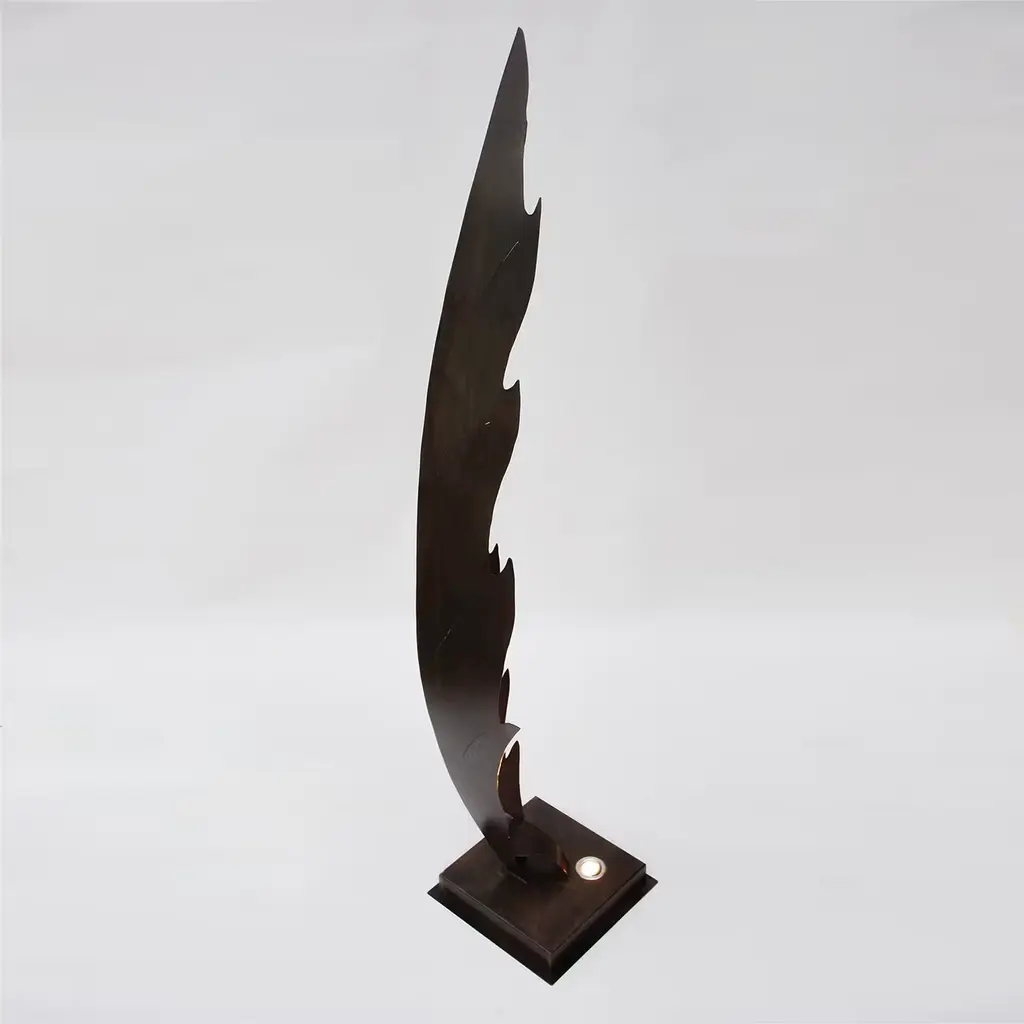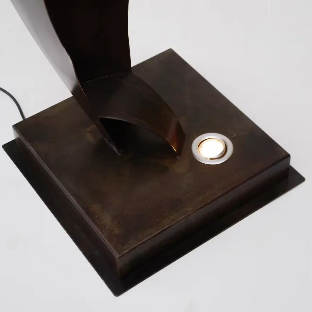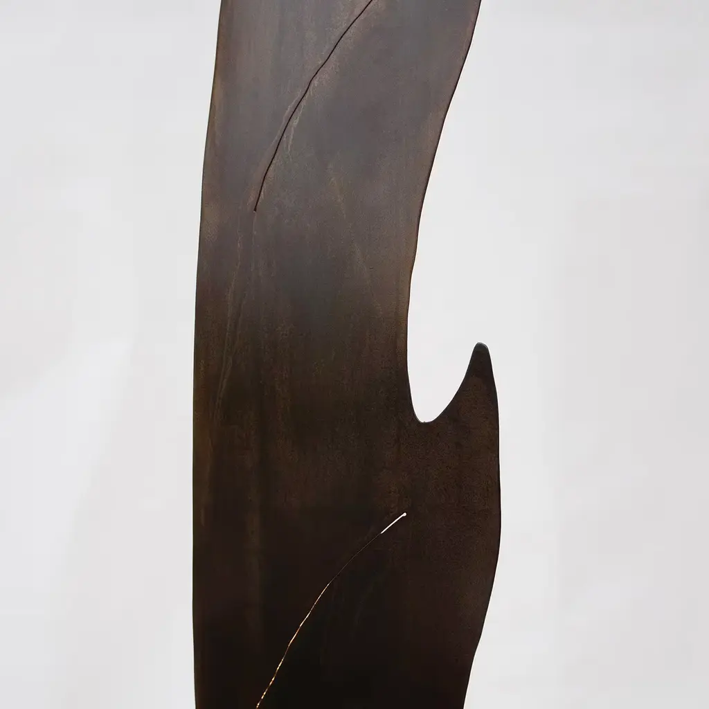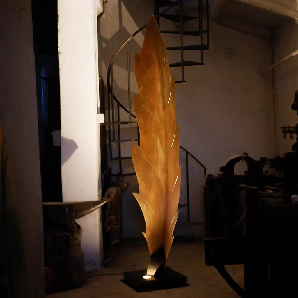Perfect synthesis between naturalistic inspiration and excellent craftsmanship, this sculptural floor lamp handcrafted from COR-TEN boasts the silhouette of a giant cherry leaf. Its luxe bronze shade is obtained by treating the steel with specific acids, lending further elegance to the frame that is illuminated by the spotlight placed in the plinth base. The final effect is evocative and reassuring, capable of adding warmth to any room of the house or office.