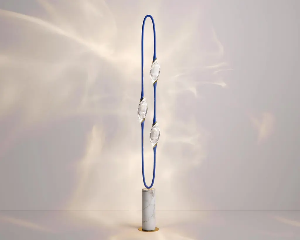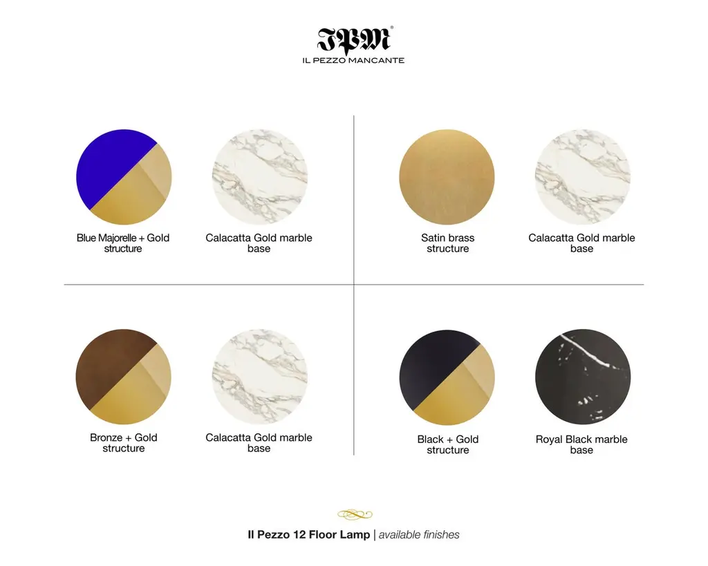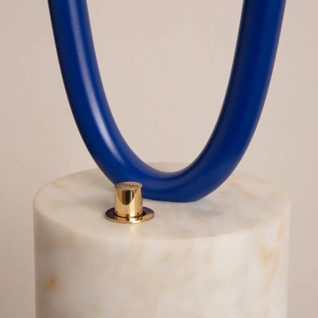 Il Pezzo 12 Floor Lamp is a stunning circular shape that carries the three light sources in its endless rotation, supported by a marble base that enhancesits cleanliness and purity. Illuminated by LEDs, the three solid crystals create a unique and immersive glow that fills the room with mesmerizing patterns.Il Pezzo 12 Floor Lamp is born in Blue Majorelle finish, inspired by designers Barbara Bertocci and Cosimo Terzani’s love for the incredible Moroccan colors, particularly the vibrant and overwhelming blue, typical of Berber burnouses. Experiencing the exquisite craftsmanship of this piece, combined with highly advanced LED technology, is truly fascinating. Notably, the lamp features a distinctive element: a metal cylinder nestled inside the marble, containing the lamp's serial number. Let’s unveil this hidden detail!Il Pezzo 12 Floor Lamp is available in differente finishes, each one combined with its own marble base.It's available for European (230v) or US (110v) electric.It's dimmable, the rotary wireless dimmer is included and it's compatible with Tuya, Google Home, Amazon Alexa, Smart Life. All electric equipment are included.All our masterpieces are meticulously crafted in our Atelier located in Florence, Italy, from a small team of people driven by a shared passion for quality and beauty. We constantly strive to create unparalleled works of art, where each piece is a testament to our commitment to craftsmanship and innovation.