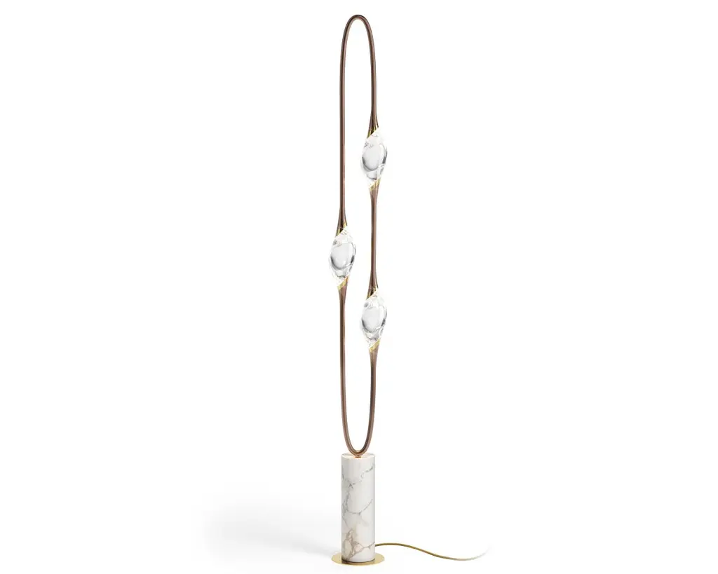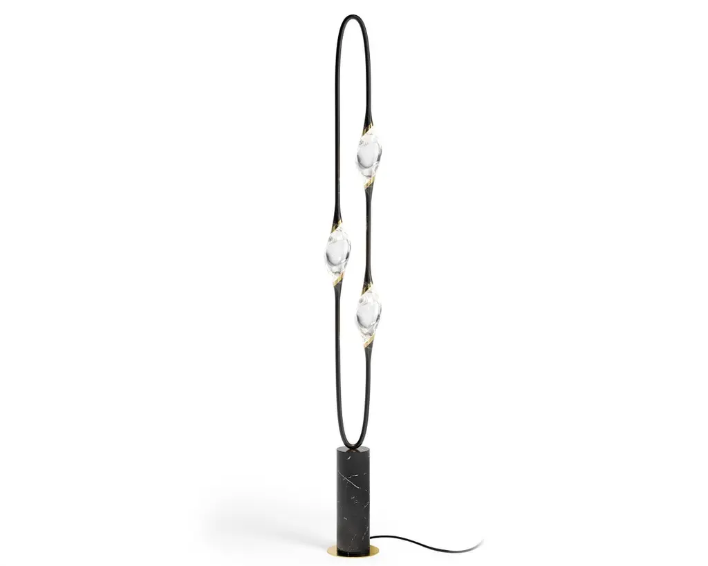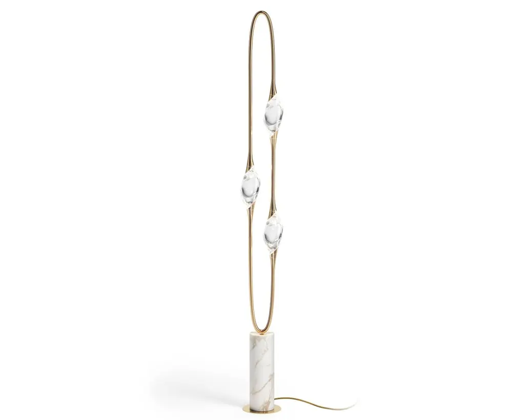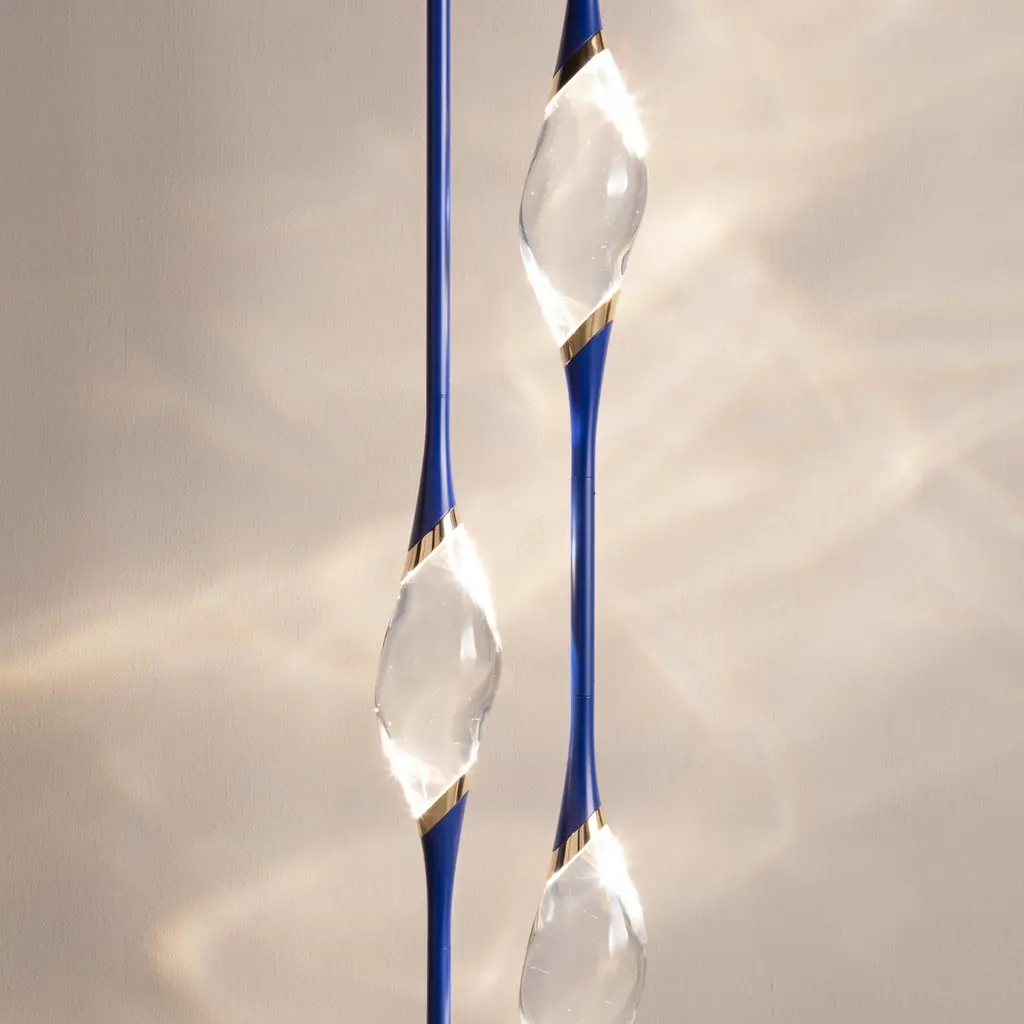 Il Pezzo 12 Floor Lamp is a stunning circular shape that carries the three light sources in its endless rotation, supported by a marble base that enhancesits cleanliness and purity. Illuminated by LEDs, the three solid crystals create a unique and immersive glow that fills the room with mesmerizing patterns.Il Pezzo 12 Floor Lamp is born in Blue Majorelle finish, inspired by designers Barbara Bertocci and Cosimo Terzani’s love for the incredible Moroccan colors, particularly the vibrant and overwhelming blue, typical of Berber burnouses. Experiencing the exquisite craftsmanship of this piece, combined with highly advanced LED technology, is truly fascinating. Notably, the lamp features a distinctive element: a metal cylinder nestled inside the marble, containing the lamp's serial number. Let’s unveil this hidden detail!Il Pezzo 12 Floor Lamp is available in differente finishes, each one combined with its own marble base.It's available for European (230v) or US (110v) electric.It's dimmable, the rotary wireless dimmer is included and it's compatible with Tuya, Google Home, Amazon Alexa, Smart Life. All electric equipment are included.All our masterpieces are meticulously crafted in our Atelier located in Florence, Italy, from a small team of people driven by a shared passion for quality and beauty. We constantly strive to create unparalleled works of art, where each piece is a testament to our commitment to craftsmanship and innovation.