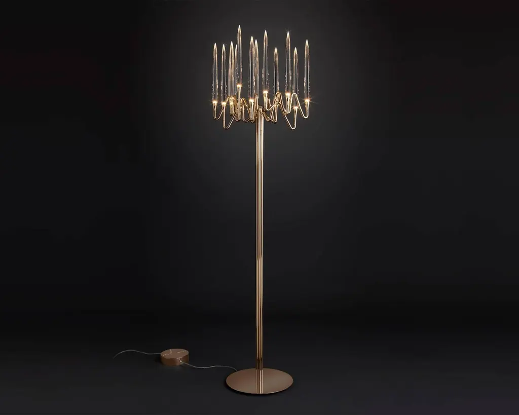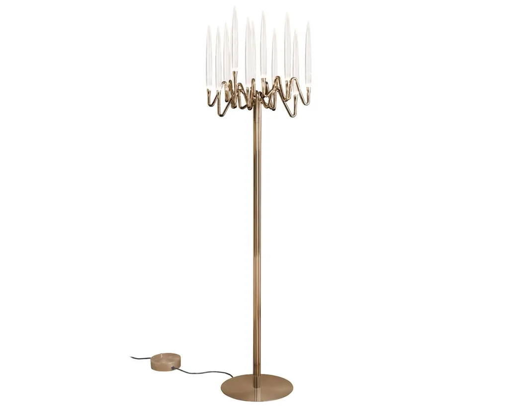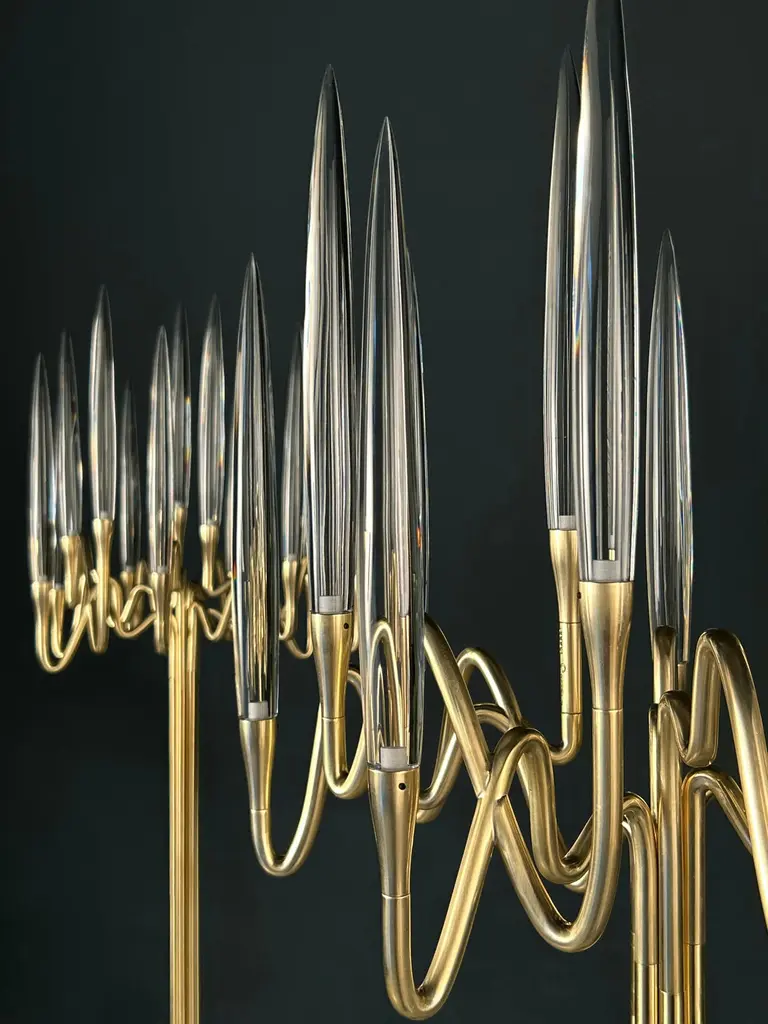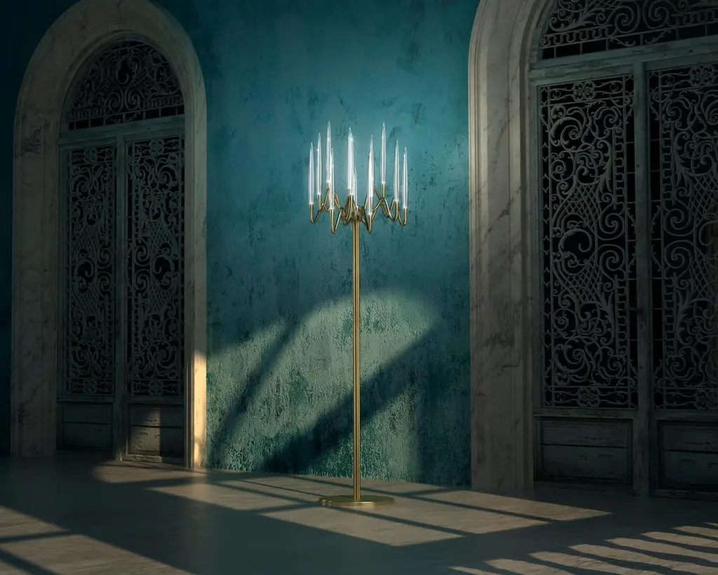 Inspired by Arabic calligraphic art and the icon of the classical candelabrum is Il Pezzo 3, a collection of lamps with a hand-forged brass structure and elegant “candles” crafted from hand blown crystal, according to the noble Tuscan artisan tradition. The candles are illuminated using the latest LED technology, creating a sophisticated and romantic light. Experiencing the exquisite craftsmanship of this piece, combined with highly advanced technology, is truly fascinating.Notably, the lamp features a distinctive element, its “Missing Piece”(“Pezzo Mancante” in Italian): a small brass cylinder containing the serial number, guaranteeing its authenticity and individuality.Custom finishes are also available to suit every preference.All our masterpieces are meticulously crafted in our Atelier located in Florence, Italy, from a small team of people driven by a shared passion for quality and beauty. We constantly strive to create unparalleled works of art, where each piece is a testament to our commitment to craftsmanship and innovation.Structure: hand-carved brassFinish: goldDiffusers: solid crystalLight source: 2.700K LED, CRI>90, dimmable.Size: 44 x 32 x H 172 - 17.3" x 12.6" x H 67.7".