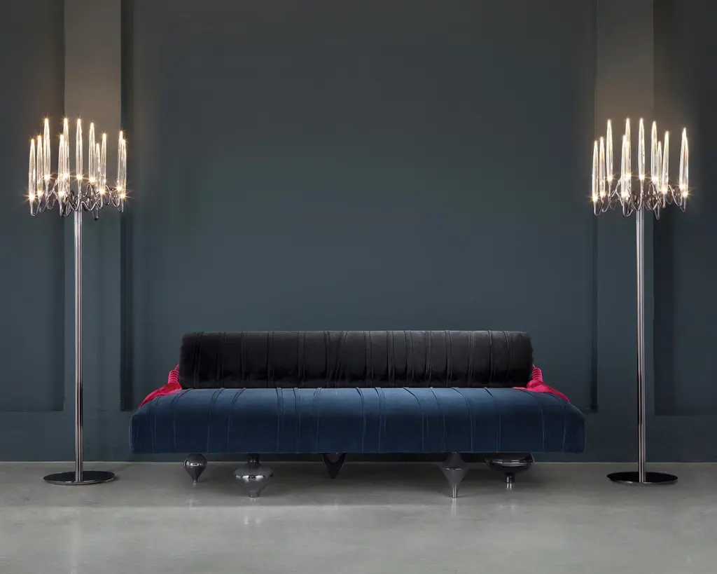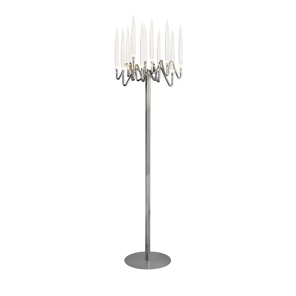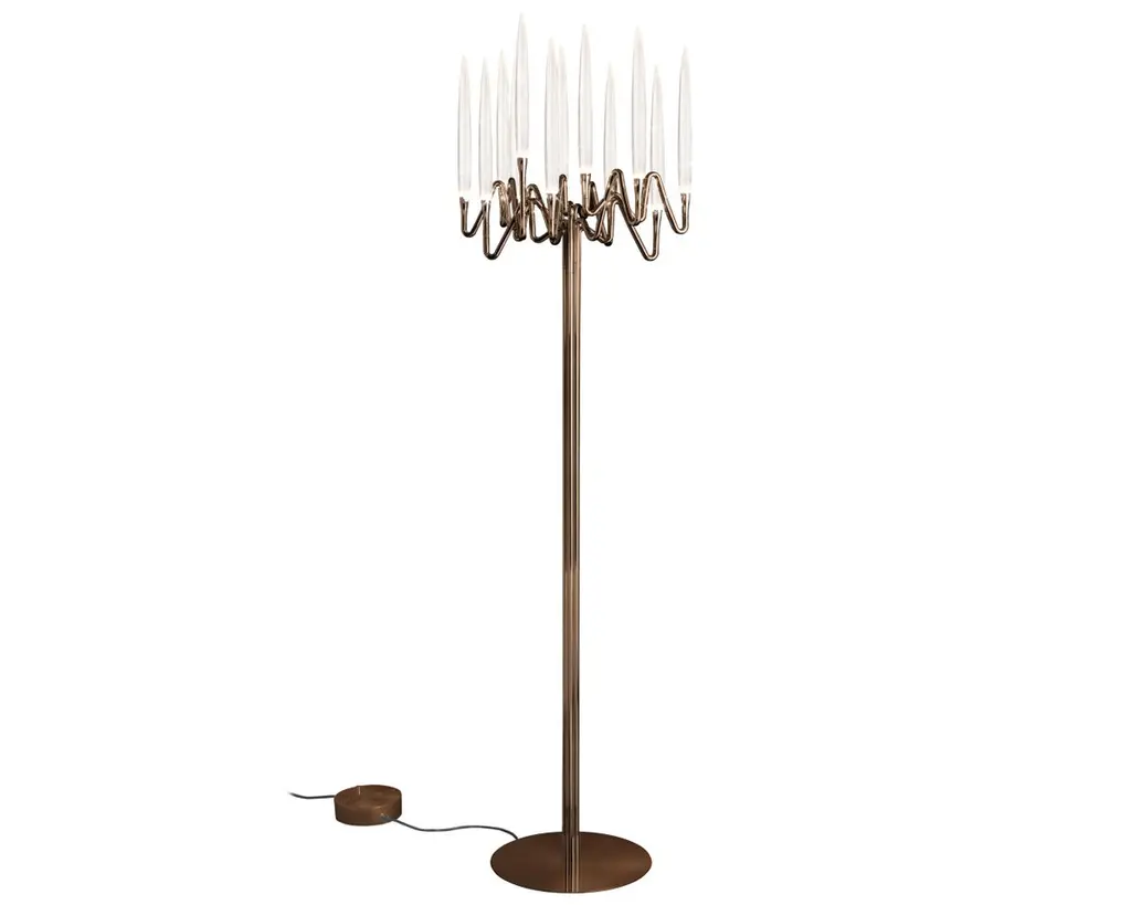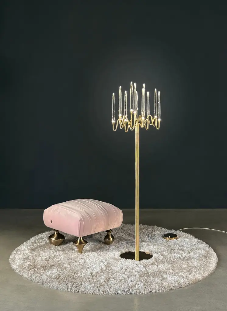 Inspired by Arabic calligraphic art and the icon of the classical candelabrum is Il Pezzo 3, a collection of lamps with a hand-forged brass structure and elegant “candles” crafted from hand blown crystal, according to the noble Tuscan artisan tradition. The candles are illuminated using the latest LED technology, creating a sophisticated and romantic light. Experiencing the exquisite craftsmanship of this piece, combined with highly advanced technology, is truly fascinating.Notably, the lamp features a distinctive element, its “Missing Piece”(“Pezzo Mancante” in Italian): a small brass cylinder containing the serial number, guaranteeing its authenticity and individuality.Custom finishes are also available to suit every preference.All our masterpieces are meticulously crafted in our Atelier located in Florence, Italy, from a small team of people driven by a shared passion for quality and beauty. We constantly strive to create unparalleled works of art, where each piece is a testament to our commitment to craftsmanship and innovation.Structure: hand-carved brassFinish: goldDiffusers: solid crystalLight source: 2.700K LED, CRI>90, dimmable.Size: 44 x 32 x H 172 - 17.3" x 12.6" x H 67.7".