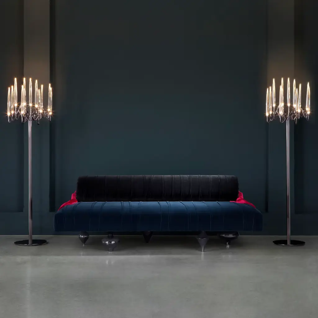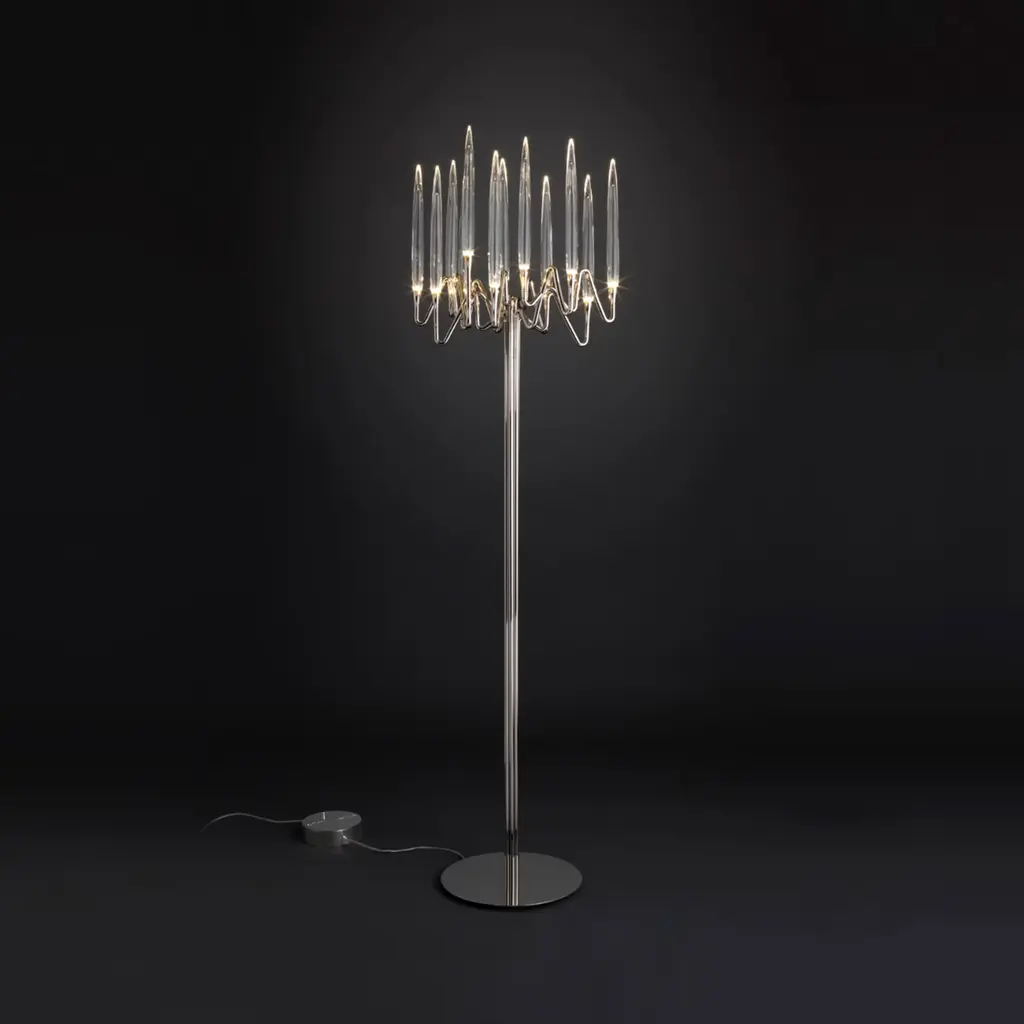 Il Pezzo 3 Floor Lamp, with a hand-crafted brass structure and elegant candles crafted from solid crystal lit from the inside with modern LED lights, creates a sophisticated and romantic atmosphere. In each piece a small brass cylinder carrying a personalized number attests to its uniqueness and authenticity. This piece can be custom made to desired size and finish.