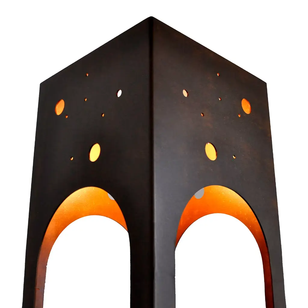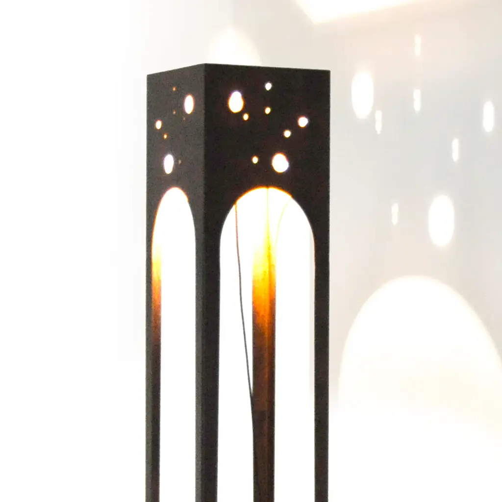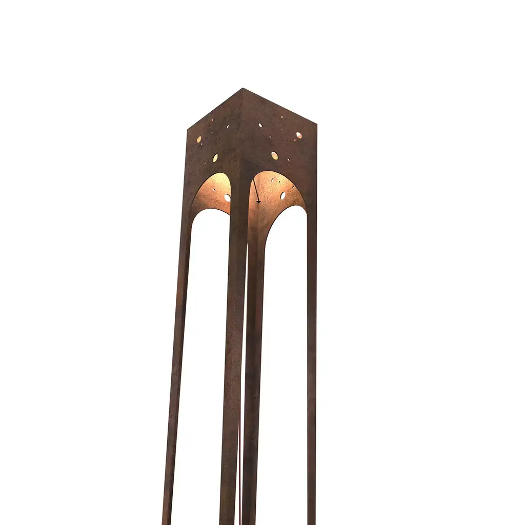 This elegant, slender floor lamp illuminates every interior with originality. It resembles a small, metal architectural structure. The warm tones of its weathering steel body enhance the light's function and the object's iconic character. The colored fabric cable is like an umbilical cord that brings forth light and life. Made in Italy.