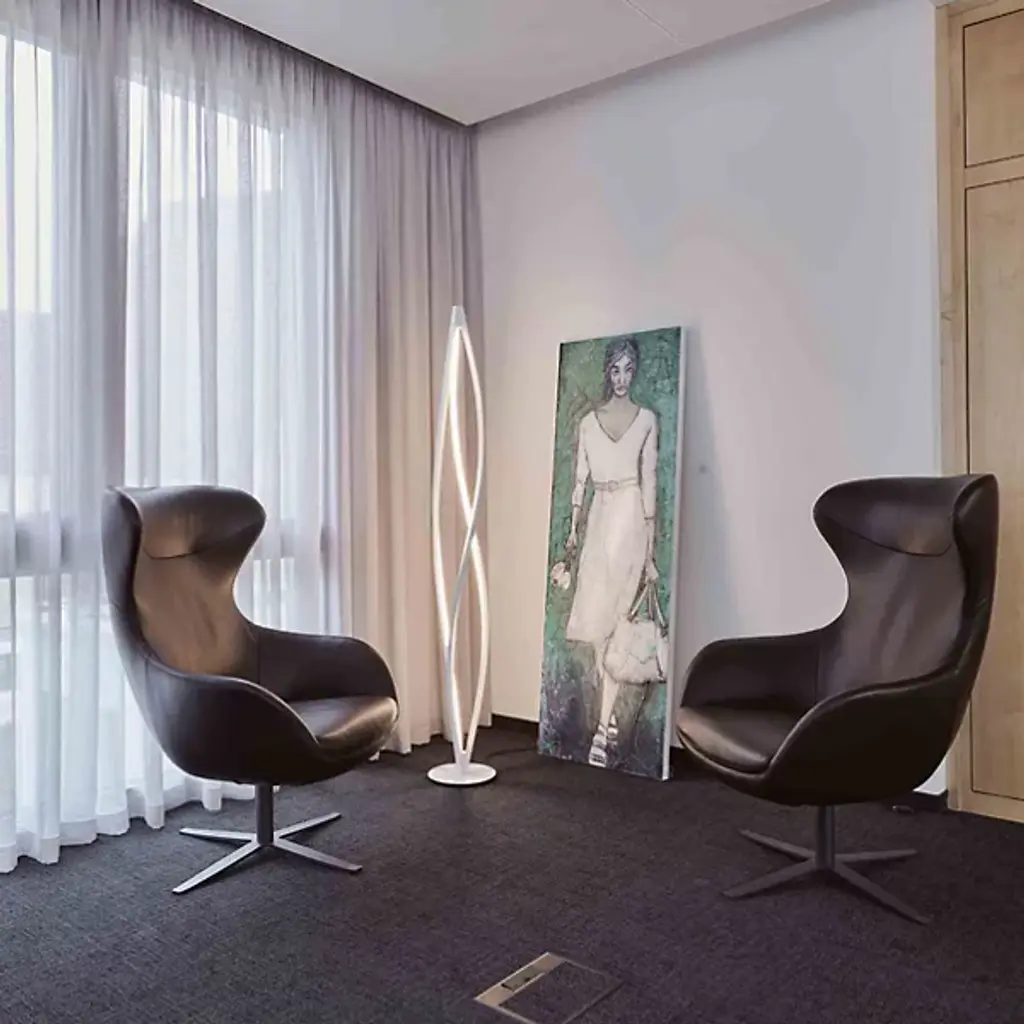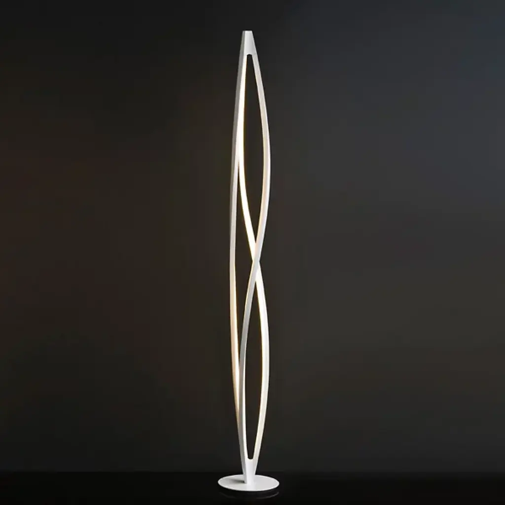 The Nemo In the Wind LED Floor Lamp is a whirlwind of movement. Aluminum columns are twisted and contorted before meeting together at each end, standing strong and balanced with minimal effort. Stretches of LED light modules span the interior length of each metal strip, and shielded with an opal diffuser, spread an even illumination in and around the entire structure. Although emitting an impressive amount of light, the location and diffusion of light from still makes for an attractive ambient light source.