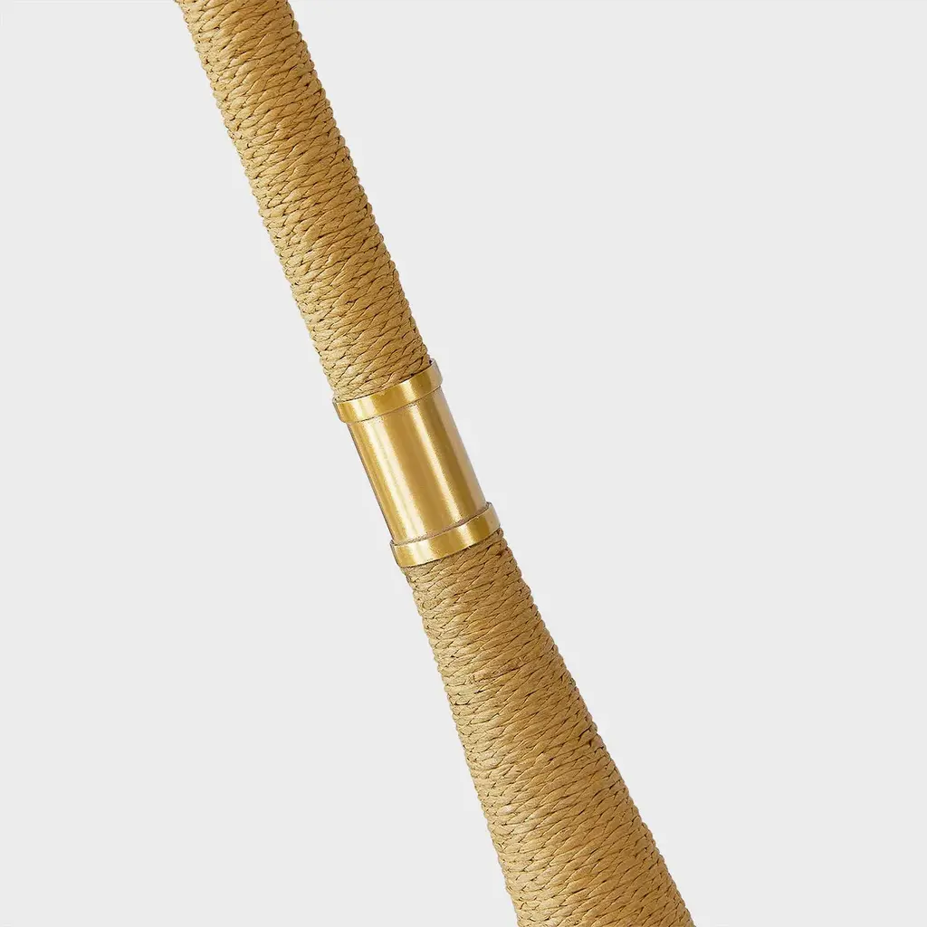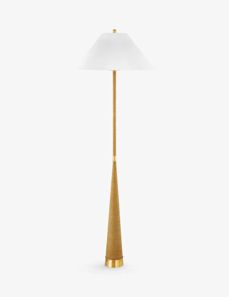 Extremely usable yet trend forward, this striking floor lamp makes a gorgeous organic statement. A slender natural raffia-wrapped stem, tapered at the bottom and straight at the top, has an Aged Brass band at the middle, creating a modern hourglass-like silhouette. A tapered white linen shade and round Aged Brass finial complete the look.