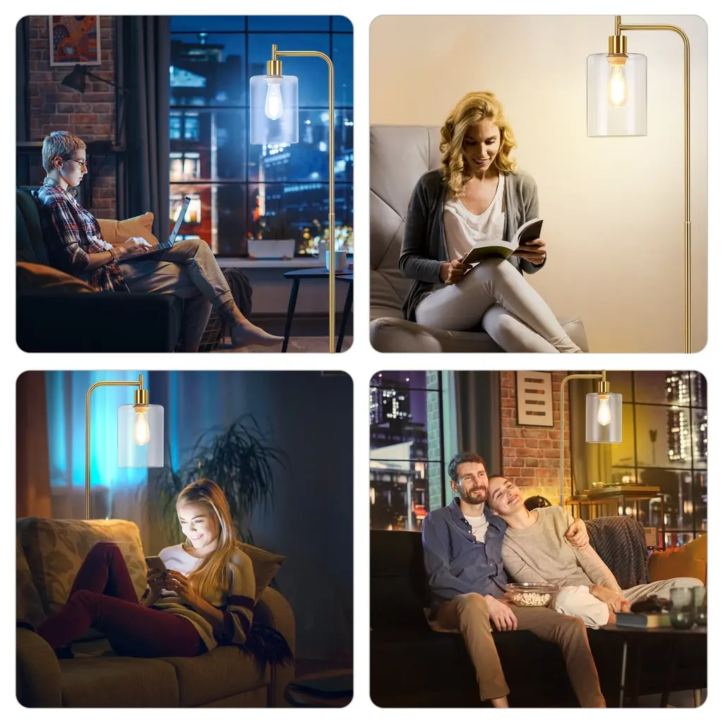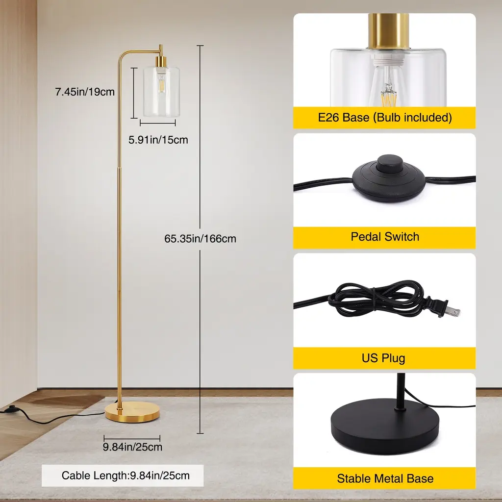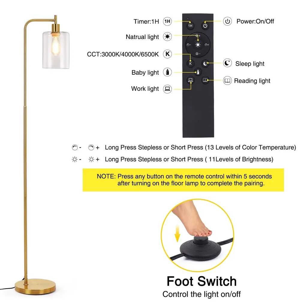 [Modern Design Floor Lamp] – This industrial floor lamp features a simple, modern design that can complement a wide range of furniture styles. It transforms your home decor into a rustic, farmhouse atmosphere and is perfect for your living room, bedroom, corner, or office, taking up very little space while adding an elegant, vintage charm. In the living room, the floor lamp not only provides bright lighting but also blends seamlessly into the space, becoming a subtle decorative accent. [Versatile LED Bulb] – This modern floor lamp comes with an LED bulb that ranges from warm white 3000K to warm 6500K, creating a comfortable atmosphere in your home. You can adjust the color temperature and brightness to suit your mood and ambiance. The bulb is replaceable and compatible with any E26 base ST58, A19, G25, T45, and RGB bulbs, allowing you to switch to the type of bulb you prefer. [Auto-off sleep timer] – The lamp can be set to automatically turn off after illuminating for an hour. This feature is ideal for use before sleep, providing warm light to help you relax until you drift off. After an hour, it shuts off automatically, preventing energy waste in case you forget to turn it off. This function not only saves energy but also enhances your sleep experience, creating a more comfortable and intelligent living environment. [Stable Base, Safe to Use] – The industrial-style floor lamp is equipped with a highly stable base and pole, ensuring it stands securely on the floor and prevents tipping by children, pets, or elderly people. Standing at 65.35 inches tall, it features a rust-resistant black or metallic body and a sturdy, clear glass shade that adds a touch of luxury and elegance. With the pole’s moderate weight, you can easily place it anywhere you desire. [Foot Pedal Switch, Hands-Free Convenience] – For added convenience, we’ve designed the floor lamp with a foot pedal switch. The on/off button is located on the floor, allowing you to easily press it with your foot. With just a simple tap, you can control the light, making it incredibly convenient and completely freeing your hands.