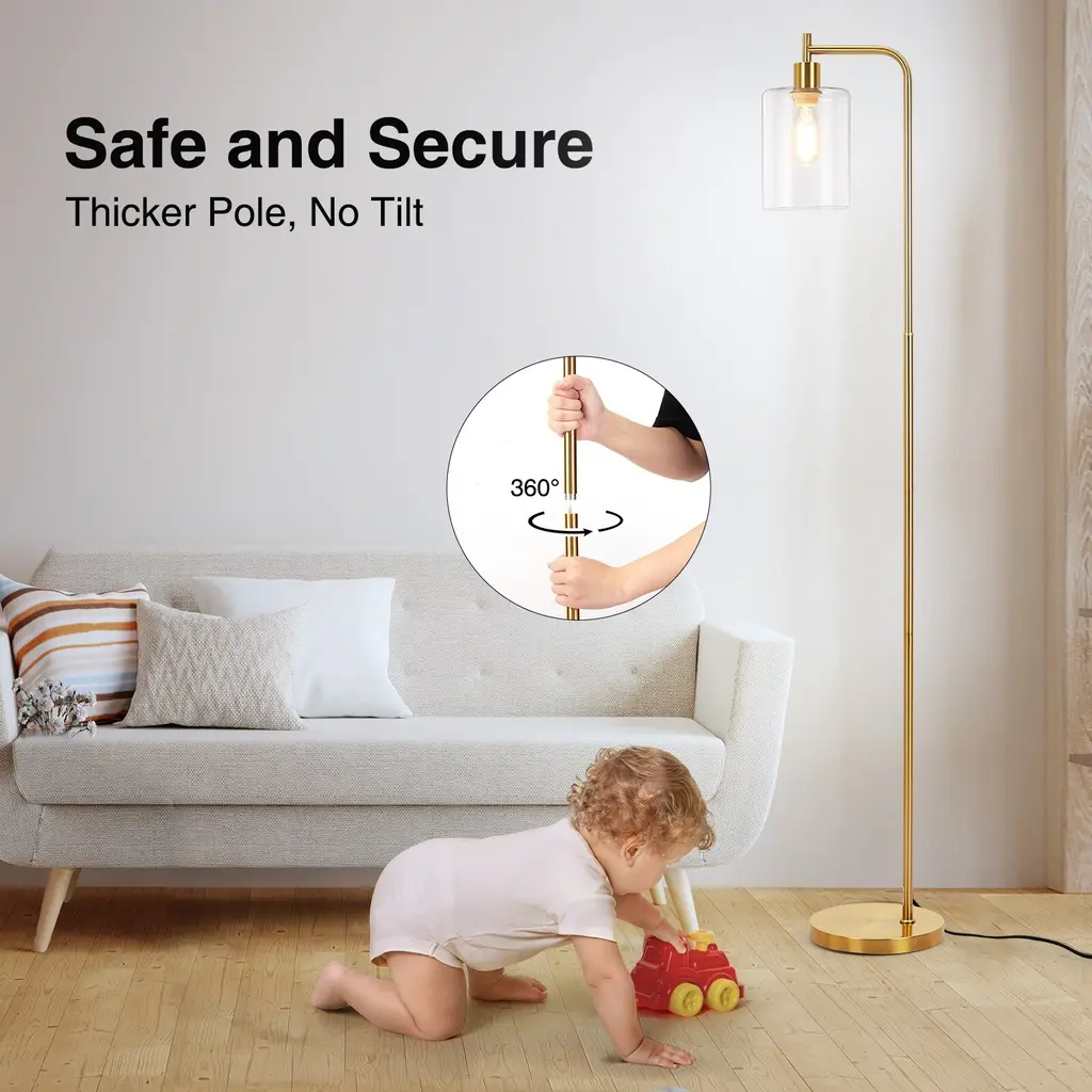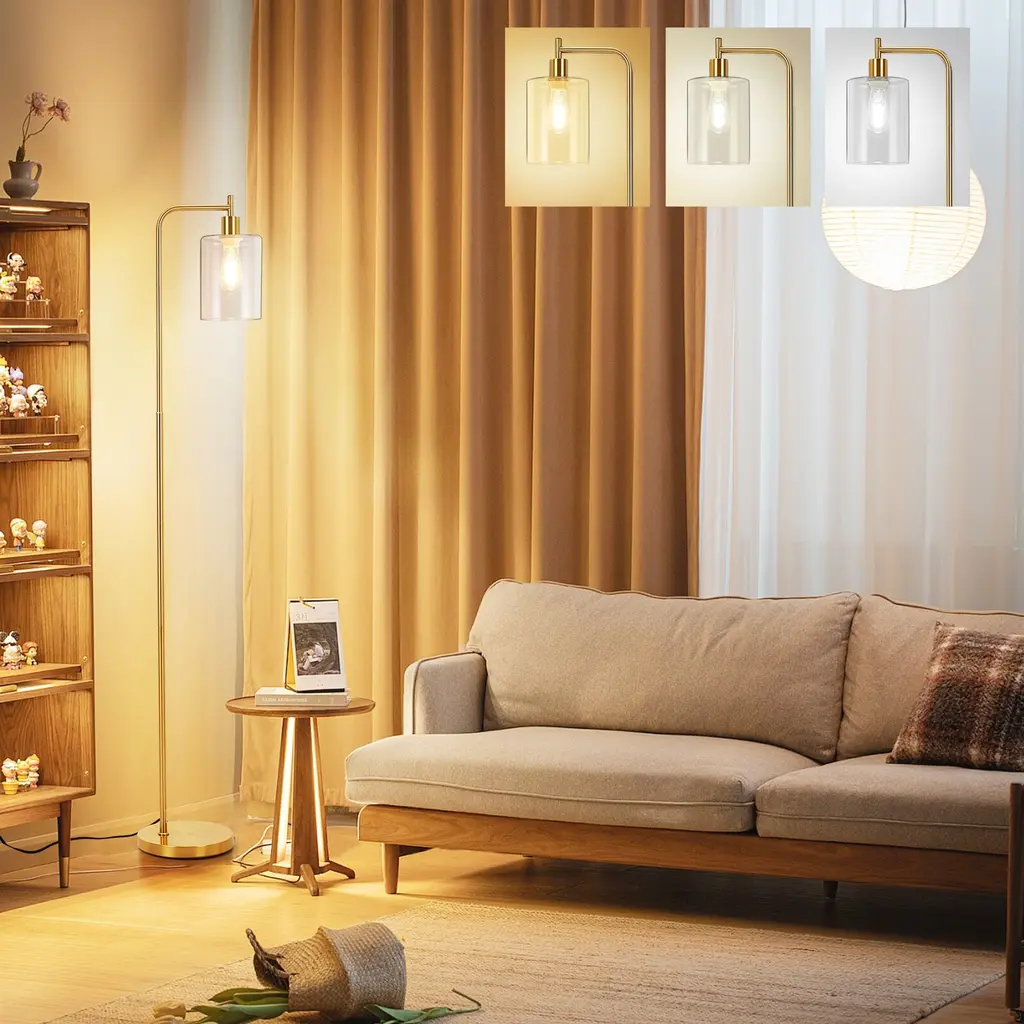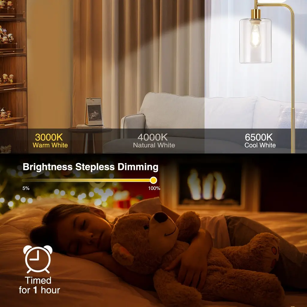 [Modern Design Floor Lamp] – This industrial floor lamp features a simple, modern design that can complement a wide range of furniture styles. It transforms your home decor into a rustic, farmhouse atmosphere and is perfect for your living room, bedroom, corner, or office, taking up very little space while adding an elegant, vintage charm. In the living room, the floor lamp not only provides bright lighting but also blends seamlessly into the space, becoming a subtle decorative accent. [Versatile LED Bulb] – This modern floor lamp comes with an LED bulb that ranges from warm white 3000K to warm 6500K, creating a comfortable atmosphere in your home. You can adjust the color temperature and brightness to suit your mood and ambiance. The bulb is replaceable and compatible with any E26 base ST58, A19, G25, T45, and RGB bulbs, allowing you to switch to the type of bulb you prefer. [Auto-off sleep timer] – The lamp can be set to automatically turn off after illuminating for an hour. This feature is ideal for use before sleep, providing warm light to help you relax until you drift off. After an hour, it shuts off automatically, preventing energy waste in case you forget to turn it off. This function not only saves energy but also enhances your sleep experience, creating a more comfortable and intelligent living environment. [Stable Base, Safe to Use] – The industrial-style floor lamp is equipped with a highly stable base and pole, ensuring it stands securely on the floor and prevents tipping by children, pets, or elderly people. Standing at 65.35 inches tall, it features a rust-resistant black or metallic body and a sturdy, clear glass shade that adds a touch of luxury and elegance. With the pole’s moderate weight, you can easily place it anywhere you desire. [Foot Pedal Switch, Hands-Free Convenience] – For added convenience, we’ve designed the floor lamp with a foot pedal switch. The on/off button is located on the floor, allowing you to easily press it with your foot. With just a simple tap, you can control the light, making it incredibly convenient and completely freeing your hands.