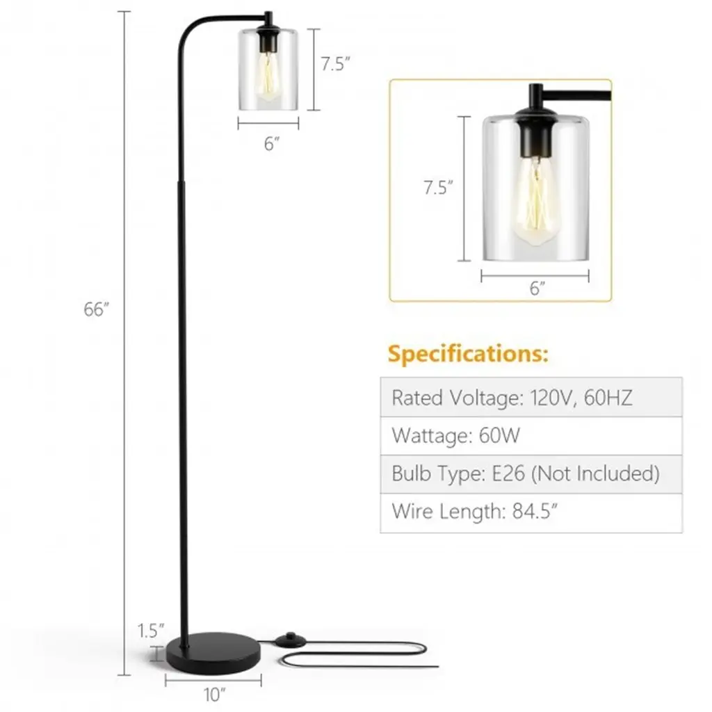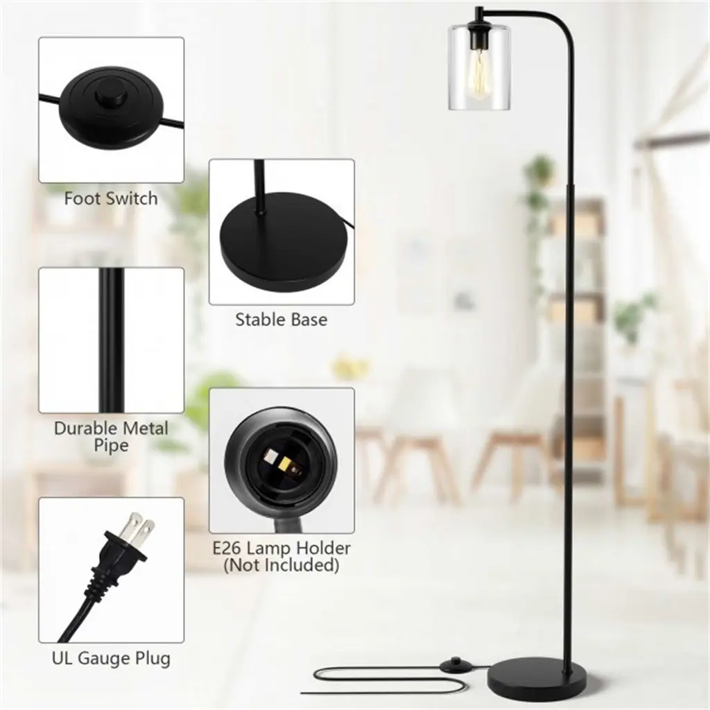 The base was being designed carefully and light pole of the all-black metal structure to ensure high stability and durability. With the hanging glass shade and classic blackpoll add a vintage yet upscale look to your living room or bedroom. In addition; the transparent glass lampshade can greatly increase the light transmittance and provide enough brightness to illuminate your house. In this way; even at night; you can work; read; or study well. Enjoy warm; cozy reading light that creates a comfortable space beside your book chair; it's a great alternative to unpleasant overhead lights. If you are looking for a unique lamp to make your house more attractive; then this industrial floor lamp is your ideal choice! Perfect decoration for anywhere in your home or officeElegant lighting creates a comfortable atmosphereStrong iron materials ensure high durability and long service lifeLightweight design and compact size for easy storage and transportTransparent glass lampshade effectively improves light transmittanceProvide you with a good lighting experience and protect your eyesUL certification ensures the floor lamp's quality and user's safetyFootswitch help you turn on or off the light easily with your feetEasily complete the assembly with detailed instructionHighlightsIndustrial Floor Lamp: This metal floor lamp has a unique industrial design that can quickly catch the attention of other guests and impress them. The special transparent glass lampshade makes it ideal for multiple styles of decorationSafe & Durable Materials: Made of high-quality steel, the lampposts of our floor lamps are not easily deformed to ensure durability. Transparent glass lampshade increases light transmission, making it easy to read or work at night and keep your eyes from getting hurt.Simple Assembly & Maintenance Steps: With detailed instruction and all needed accessories, you can easily complete the assembly of this industrial floor lamp. Besides, our floor lamp does not need to be deliberately maintained and cleaned