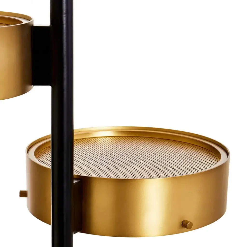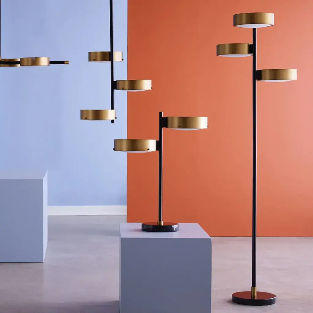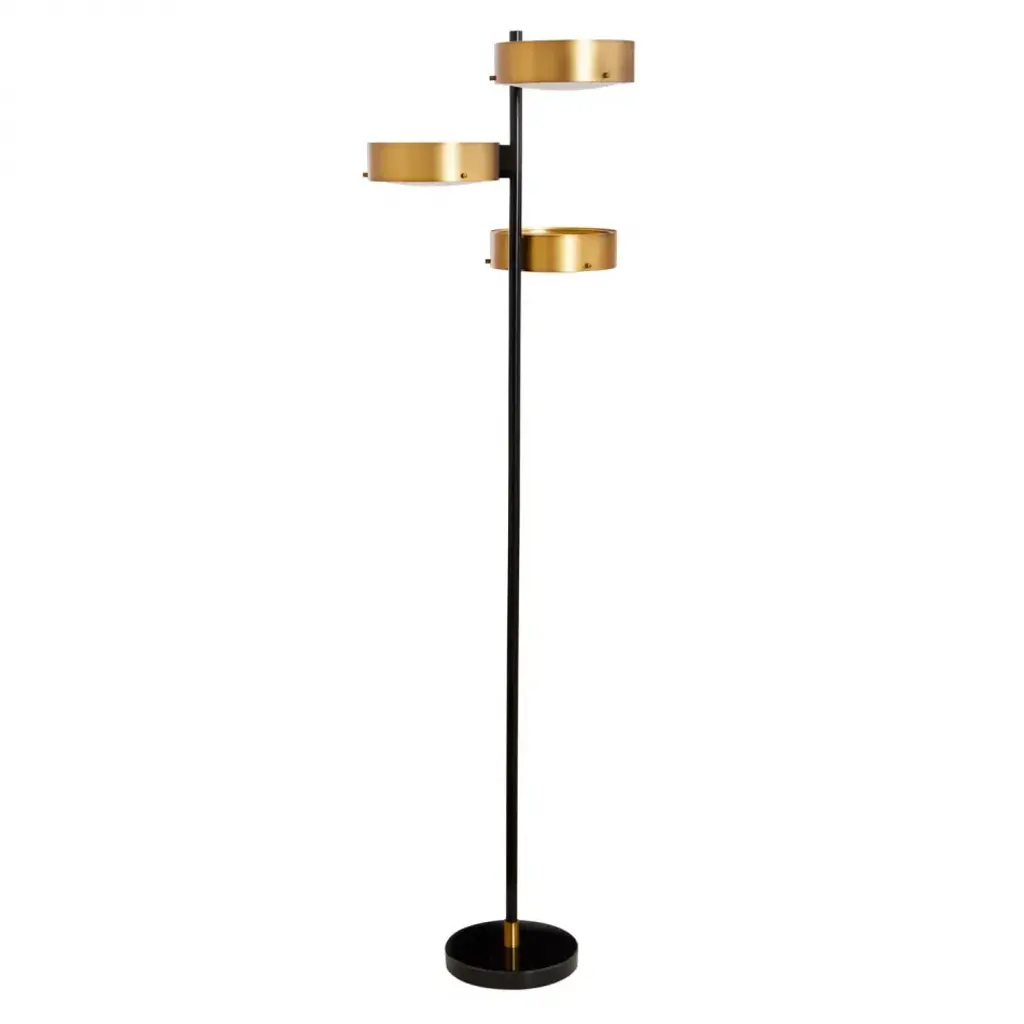 Industrial Modern.Our Industry lighting collection’s architectural rigor is at-home in a minimalist space, or use it to balance out a maximalist abode. Featuring a blackened steel stem anchored by a thick black marble base and three brass shades housing fully integrated LED panels, our Industry Floor Lamp is your go-to for creating a modern mood.All lighting sales are final.