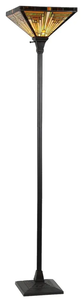 INNES, Tiffany-style mission torchiere is handcrafted with intricate designs and made of pure stained glass piece. Distinctive design featuring rows and columns. Each piece accentuated one another to create a wonderful pallet of warmth. Coated in an antique bronze patina tone. Details abound from the base to the top anchor. Expertly crafted with top quality materials. Great addition to any office or home.(1) 100 Watt max E26 Type A Bulb (not included)On-socket knob272 pcs glass cutUplightIndoor SettingHarmonized code: 940520Since these are hand crafted products, the exact color of glass pieces may vary. Colors of the glass will appear darker and less vibrant when not illuminated. Handmade glass will vary from one piece to the other; glass made at different times will also vary. Light bulbs used in lamps or ambient lighting may affect the appearance of the products. Stained glass product has been protected with mineral oil as part of the finishing process. Please use a soft dry cloth to remove any excess oil.