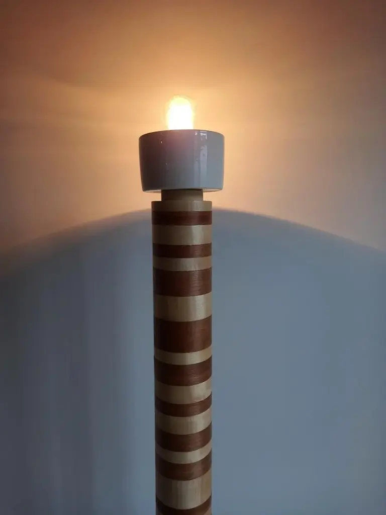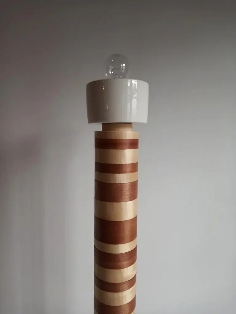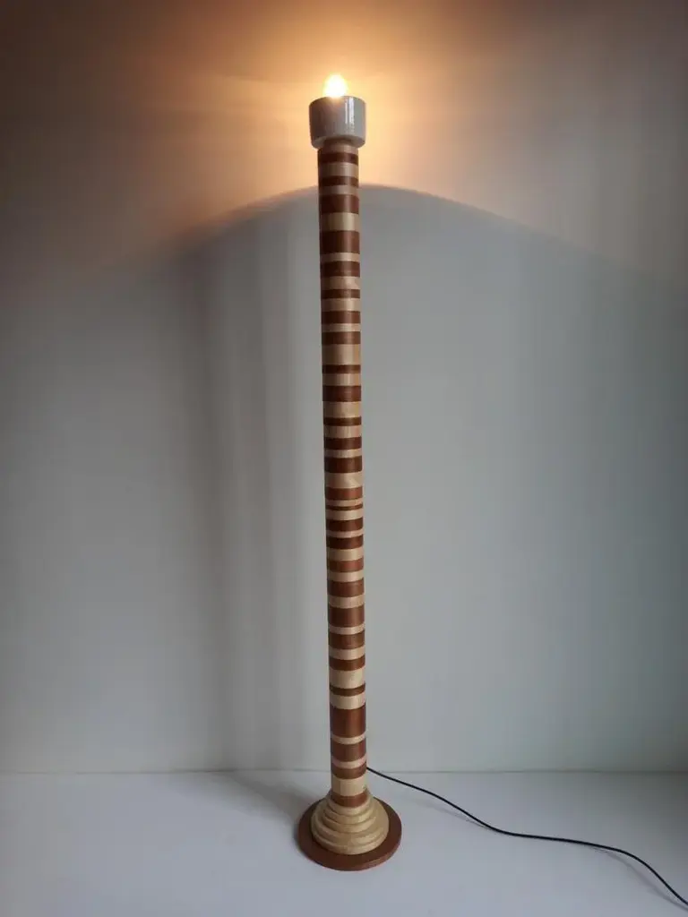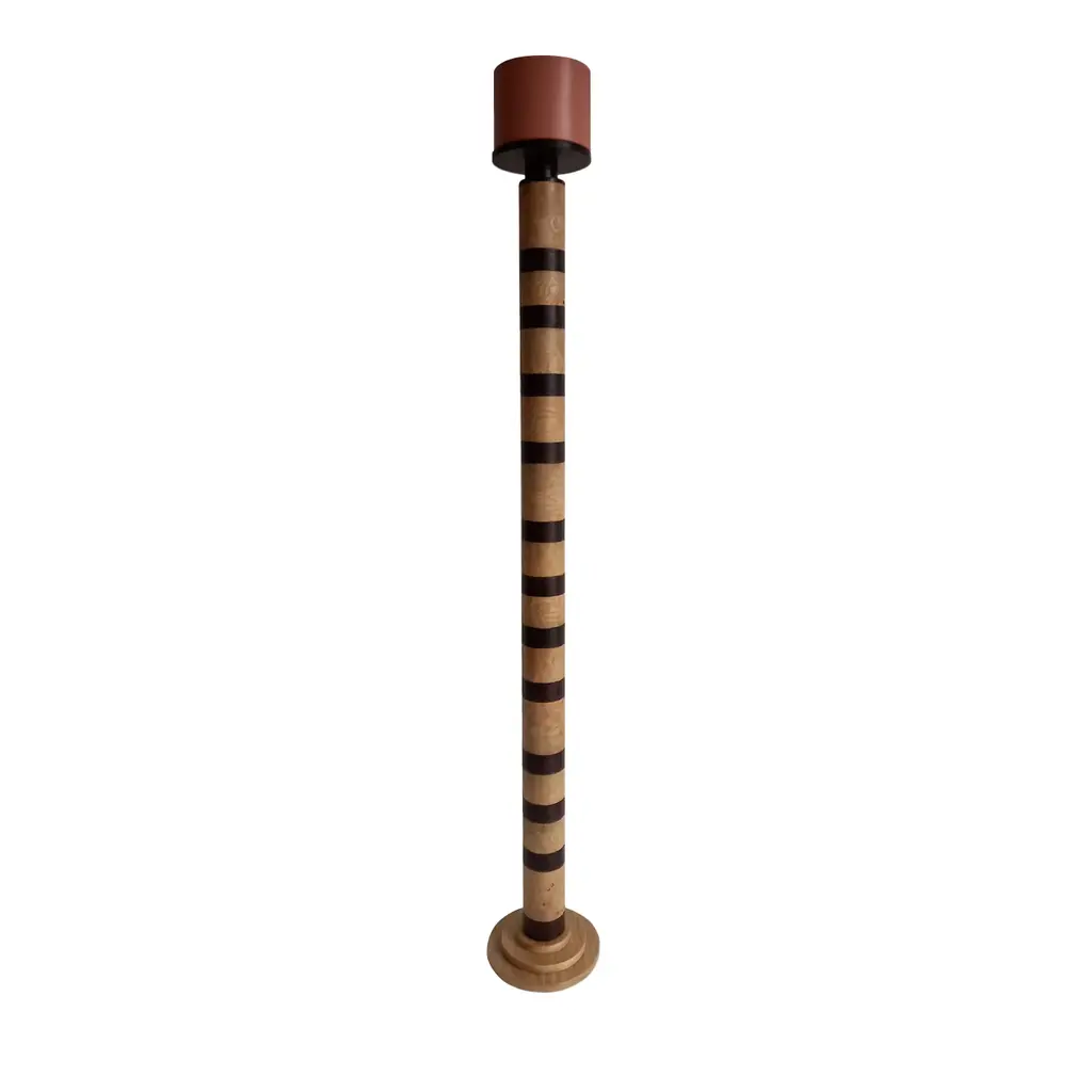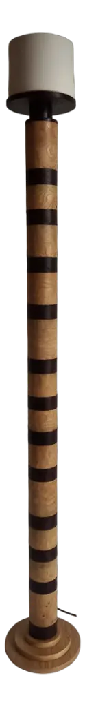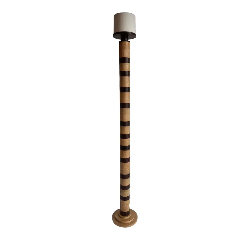 "Ionica" Floor Lamp by Pietro Meccani 2023 for Meccani Design. Flooring lamp in turned and inlaid wooden wood, upper part in white ceramic. Cherry and maple essences. Dimensions (cm): diameter 30 x h 195 Signed by Maker,Labeled by Maker, European Plug (up to 250V).