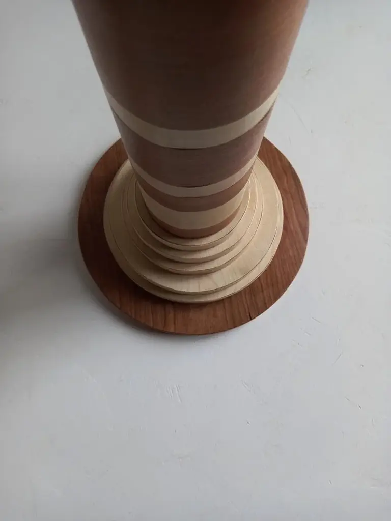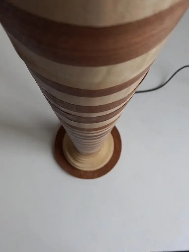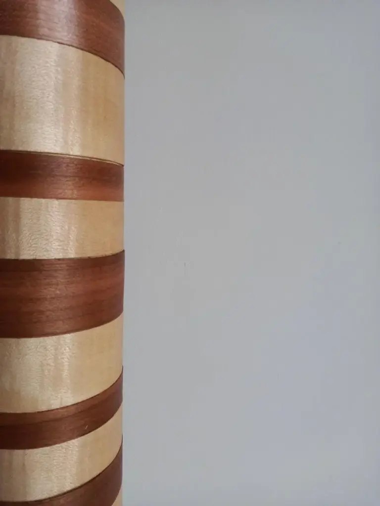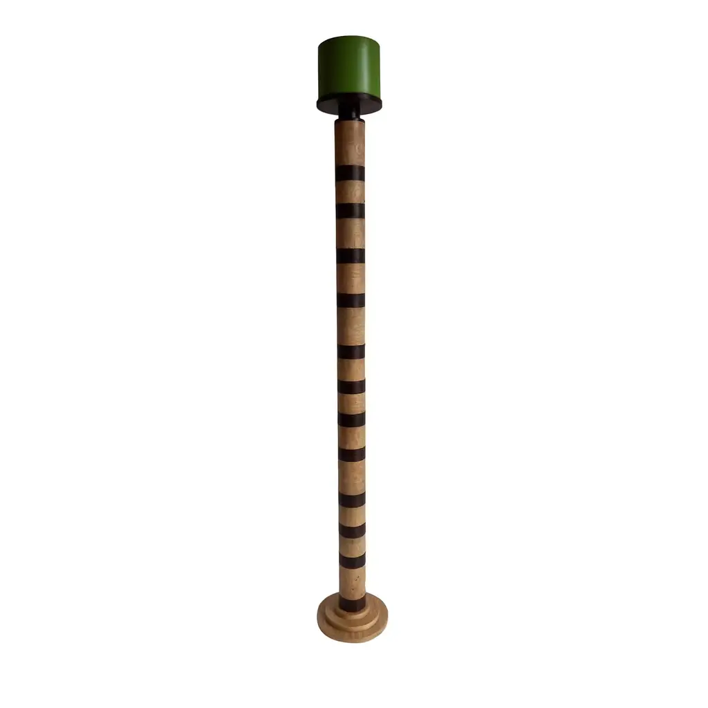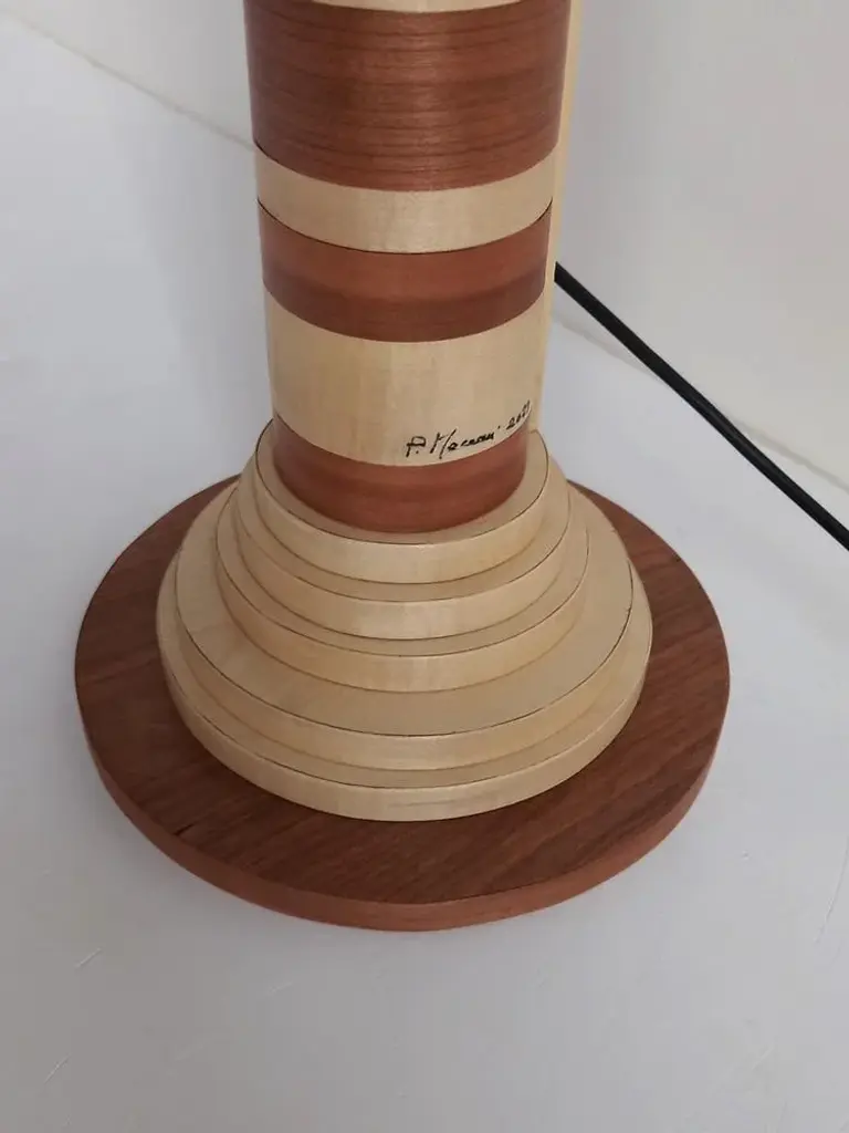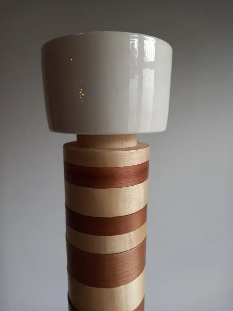 "Ionica" Floor Lamp by Pietro Meccani 2023 for Meccani Design. Flooring lamp in turned and inlaid wooden wood, upper part in white ceramic. Cherry and maple essences. Dimensions (cm): diameter 30 x h 195 Signed by Maker,Labeled by Maker, European Plug (up to 250V).