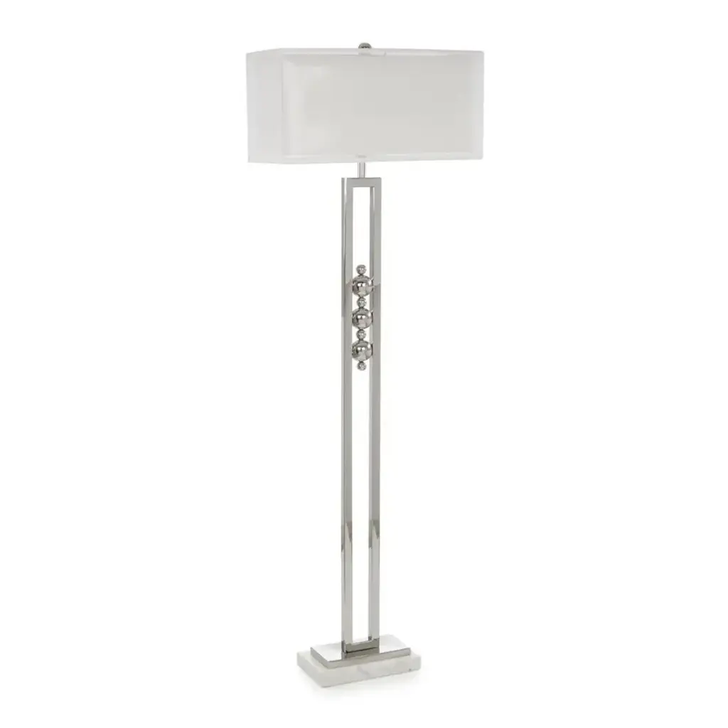 The Isla Floor Lamp displays an exceedingly contemporary design that lends an irresistible air of gravitas to an interior space. The frame features a rectangular body of steel, with an arrangement of lustrous orbs suspended in the center. With a gorgeous polished nickel finish, the body extends downwards onto a rectangular steel base with a larger slab of white marble beneath it. A rounded finial, also in polished nickel, completes the look of this beautiful turnkey lamp.