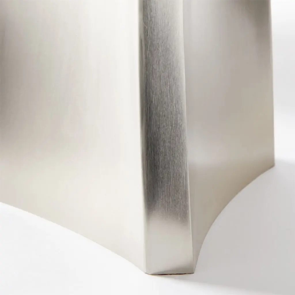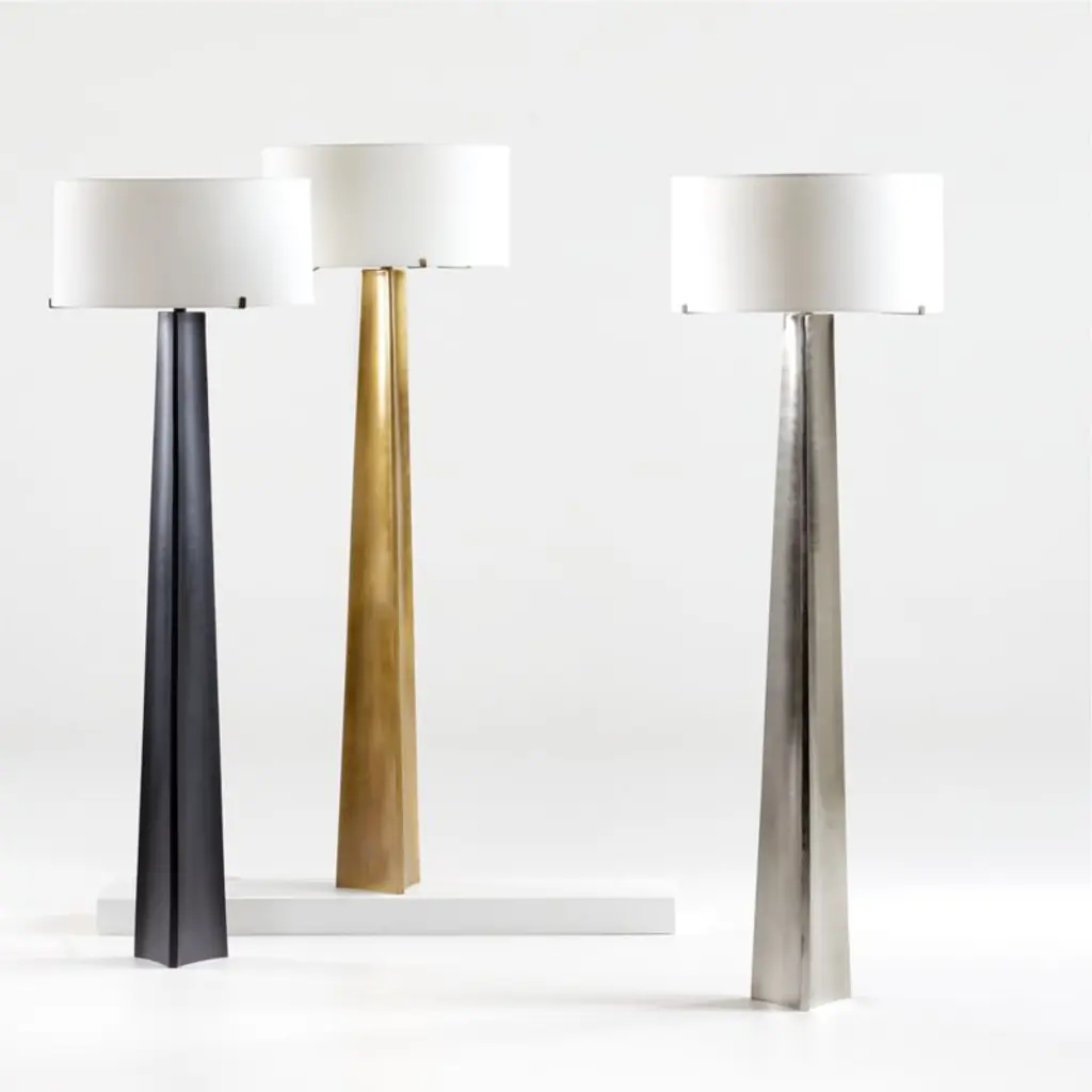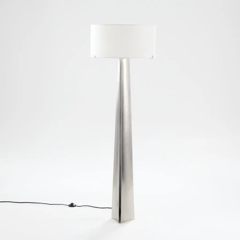 Like a refined steel beam finished in shimmering pewter, our Isla floor lamp graces rooms with industrial beauty and architectural grace. Three gently curved panels welded together sculpt a slim pyramid topped with a contrasting bright white cotton drum shade for softly diffused light. The clips of the built-in shade frame add dainty pewter details. Designed for us by Blake Tovin of Tovin Design, our exclusive Isla triangle floor lamp pairs with the matching table lamp for a unified room.