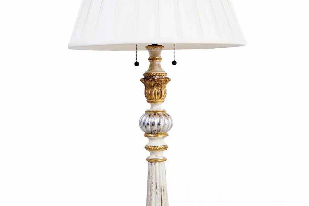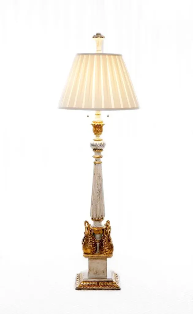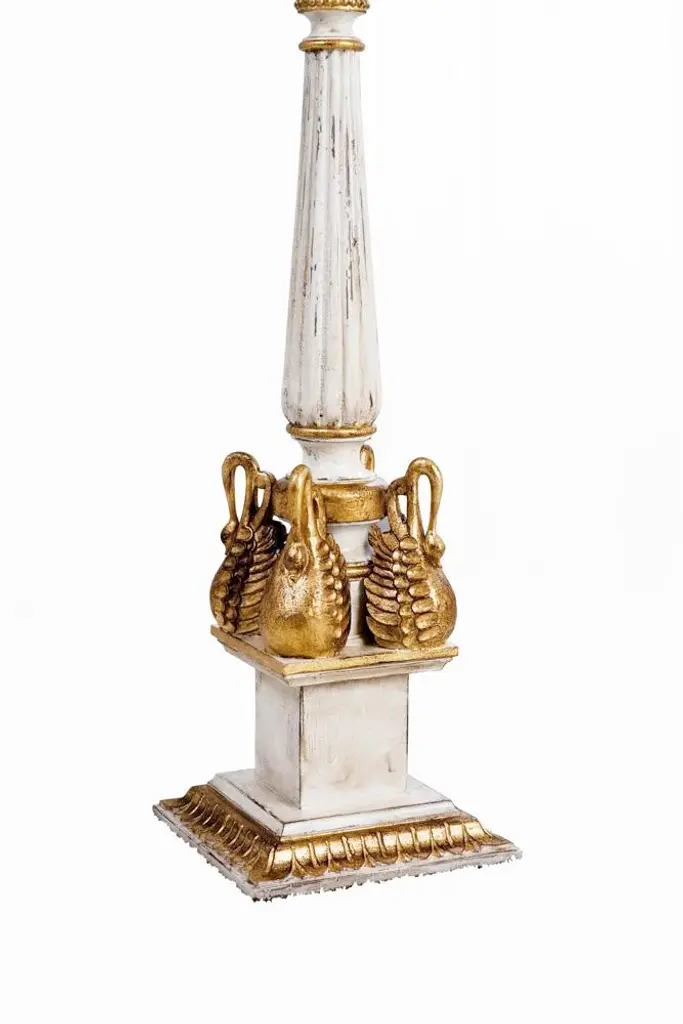 Created by Judson Rothschild for The Rothschild Collection – “Regine"© in the Italian Empire Style is manufactured out of American Hard Maple, with a lobed baluster and ring-turned columnar stem with foliate capital supported by a rectangular plinth base carved with four stylized swans, on a stepped square leaf-tip-carved foot, with a an antiqued hand-rubbed white and silver leaf & parcel-gilt gold finish. "Regine" is that floor lamp that dares not to be noticed.
