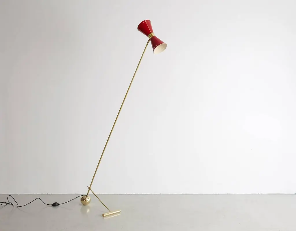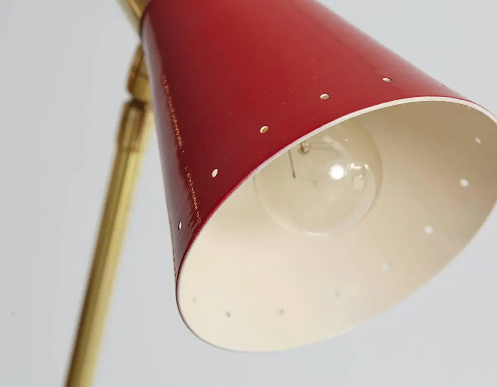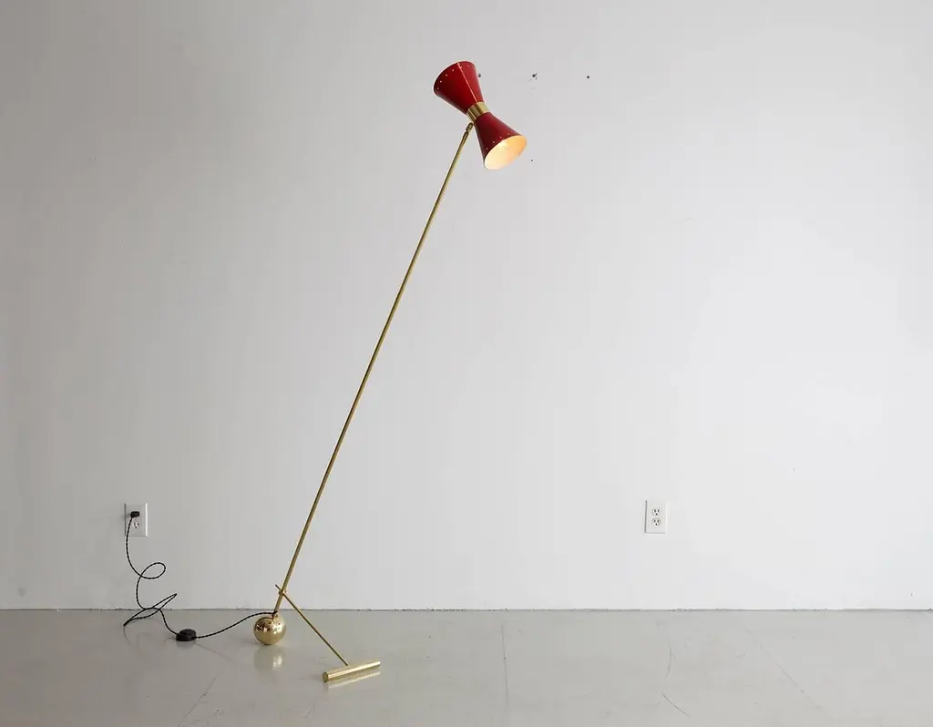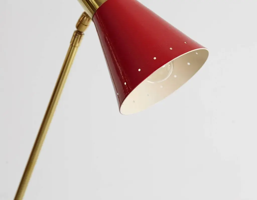 Italian floor light in the style of Stilnovo with articulating red shade, brass stem and counter weight ball foot. Newly produced in Italy and newly rewired.