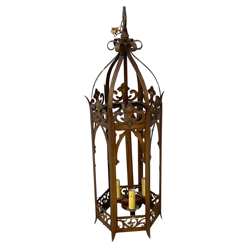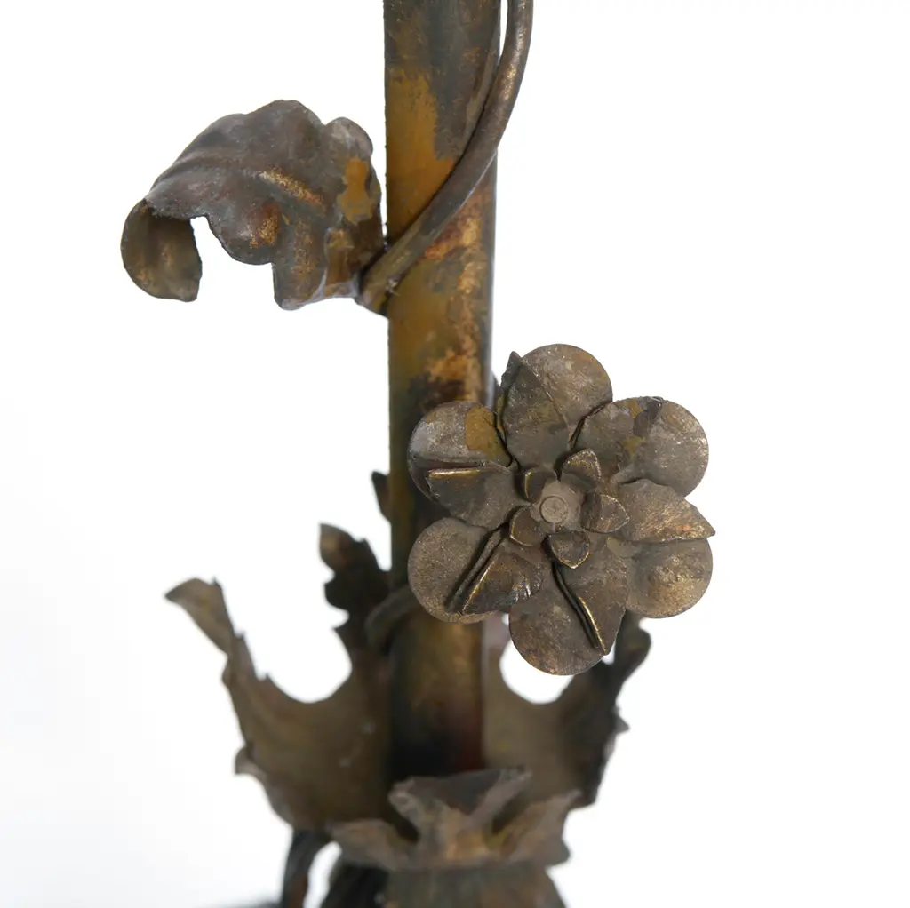 Italian Iron Floor Lamp Rusty Finish. Hand crafted vintage Italian wrought iron floor lamp, Stunning craftsmanship with lots of ornate detail. The gilt finish has been aged with oxidizers to add a natural rust patina over the original gilt surface. Re-wired with solid brass sockets & switches, standard bulb recommended. Measurements are from the widest point. There is just one lamp.