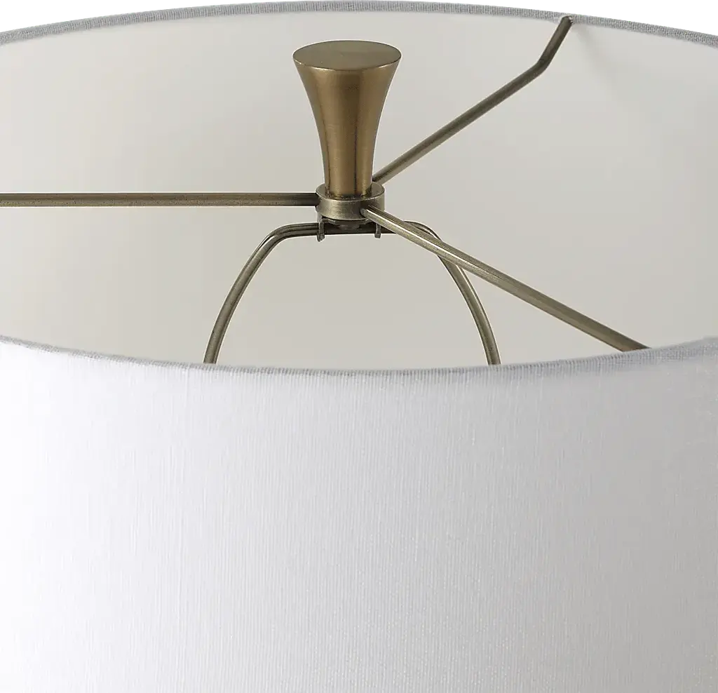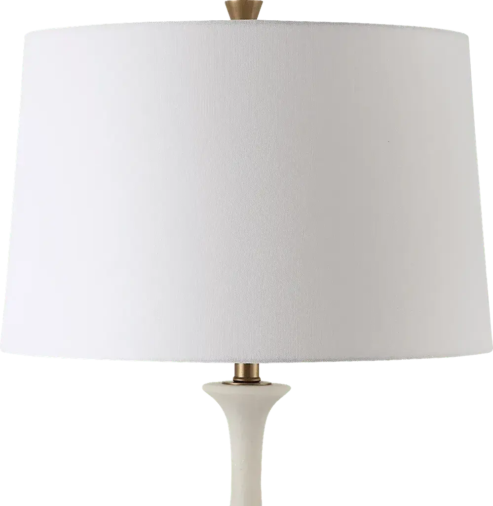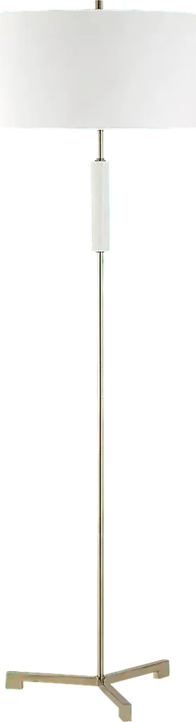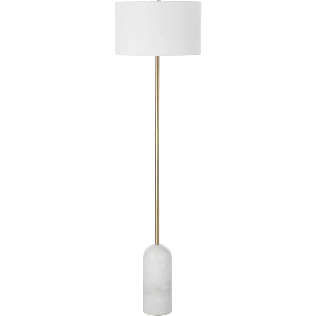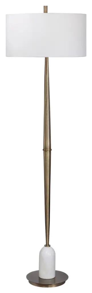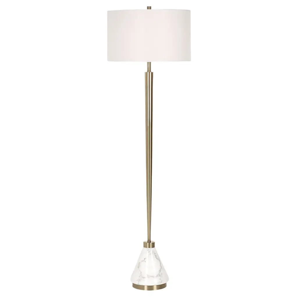 The Ivanhoe Alley Brass Floor Lamp adds an air of elegance and sophistication to any space. The base of the lamp is crafted from ivory man-made stone that accurately replicates the look of Thassos marble and is accented by plated antique brass details, displayed on a crystal foot. The tapered round hardback shade is covered in a white linen fabric. Partial assembly may be required.