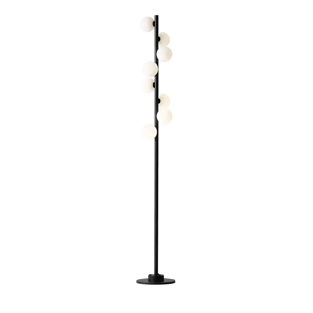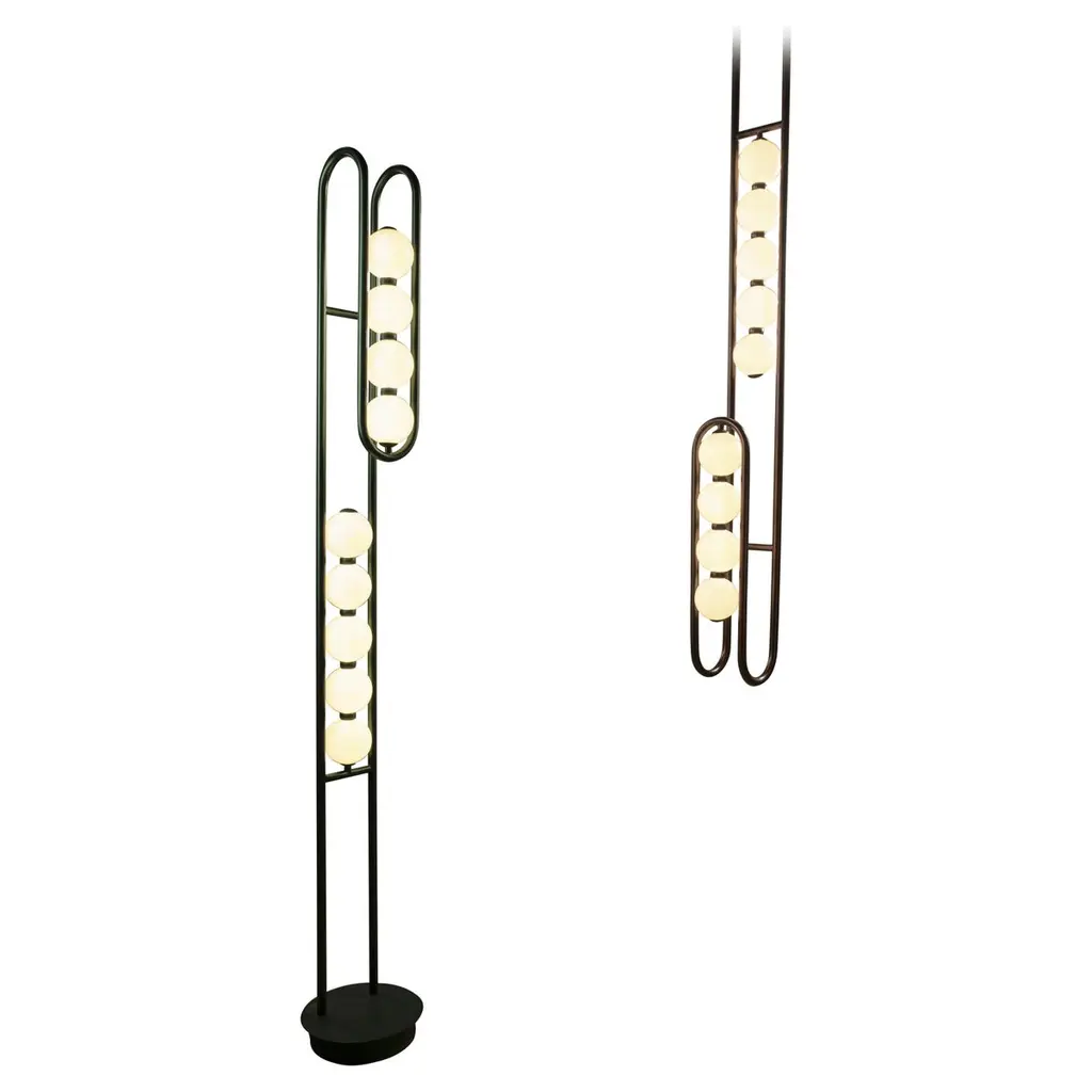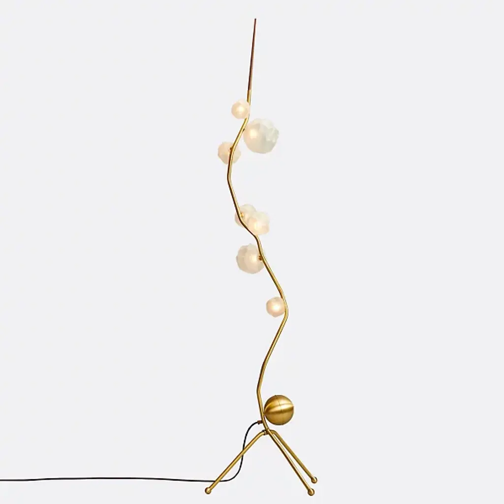 Transform indoor floors with the airy, vibrant character of the Ivy Branch Floor Lamp from Shakuff. A 2023 design made in the USA that matches clean contemporary lines with artisanal flair, it starts with a tripod base atop ball-shaped feet, extending a winding metal stem upward, evoking a vibrant climbing vine headed towards sunlight. The metal stem is capped with a wooden ferrule, adding a touch of natural woodgrain to the design, while small lamps studded along the stem are surrounded by hand-blown glass shades, each one featuring unique creases and pleats, continuing the organic appeal.
