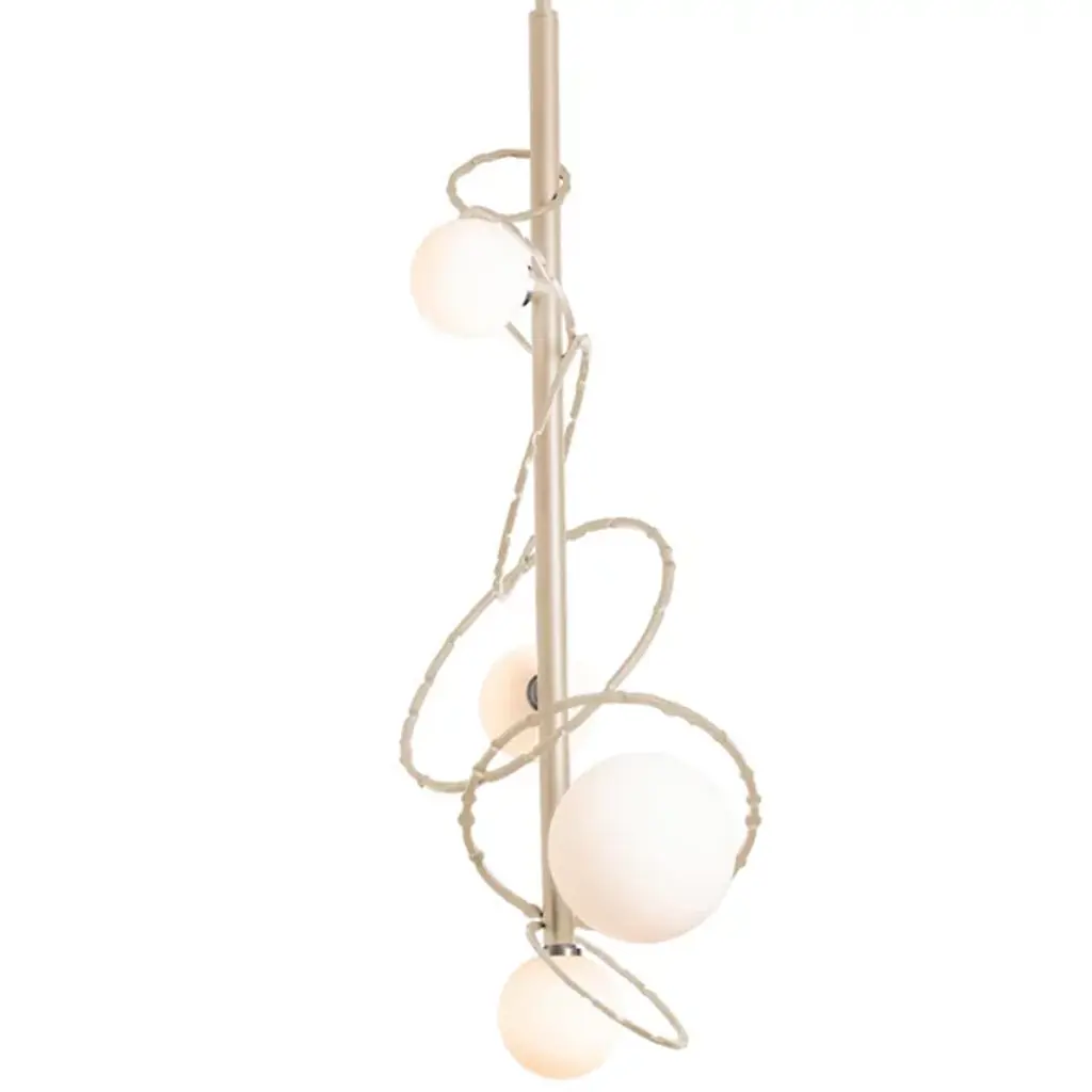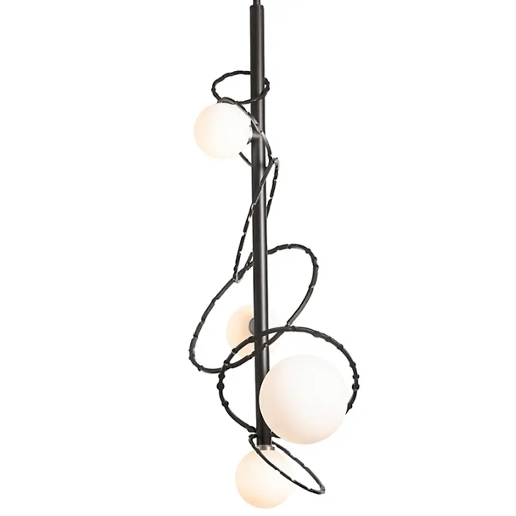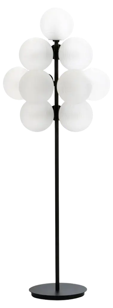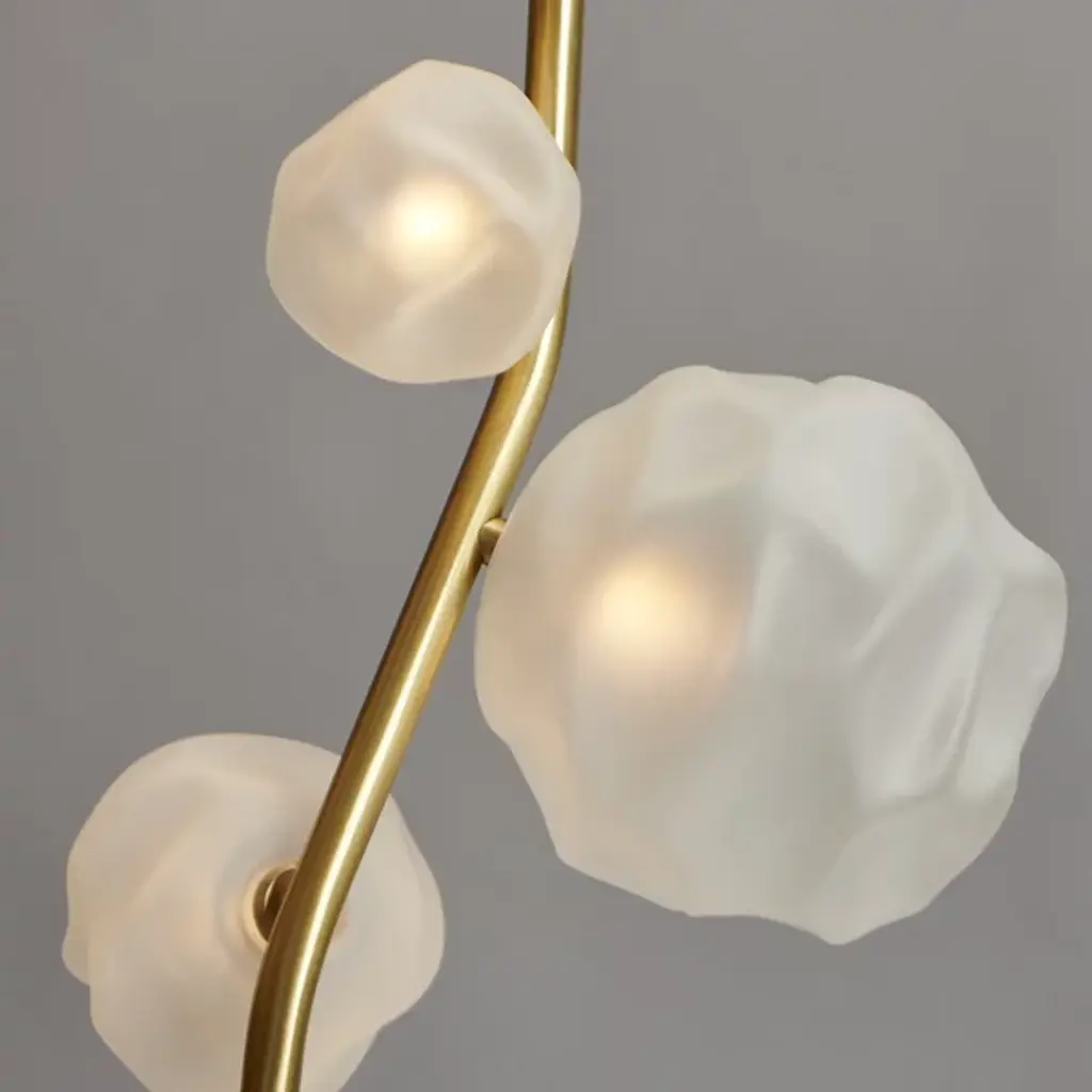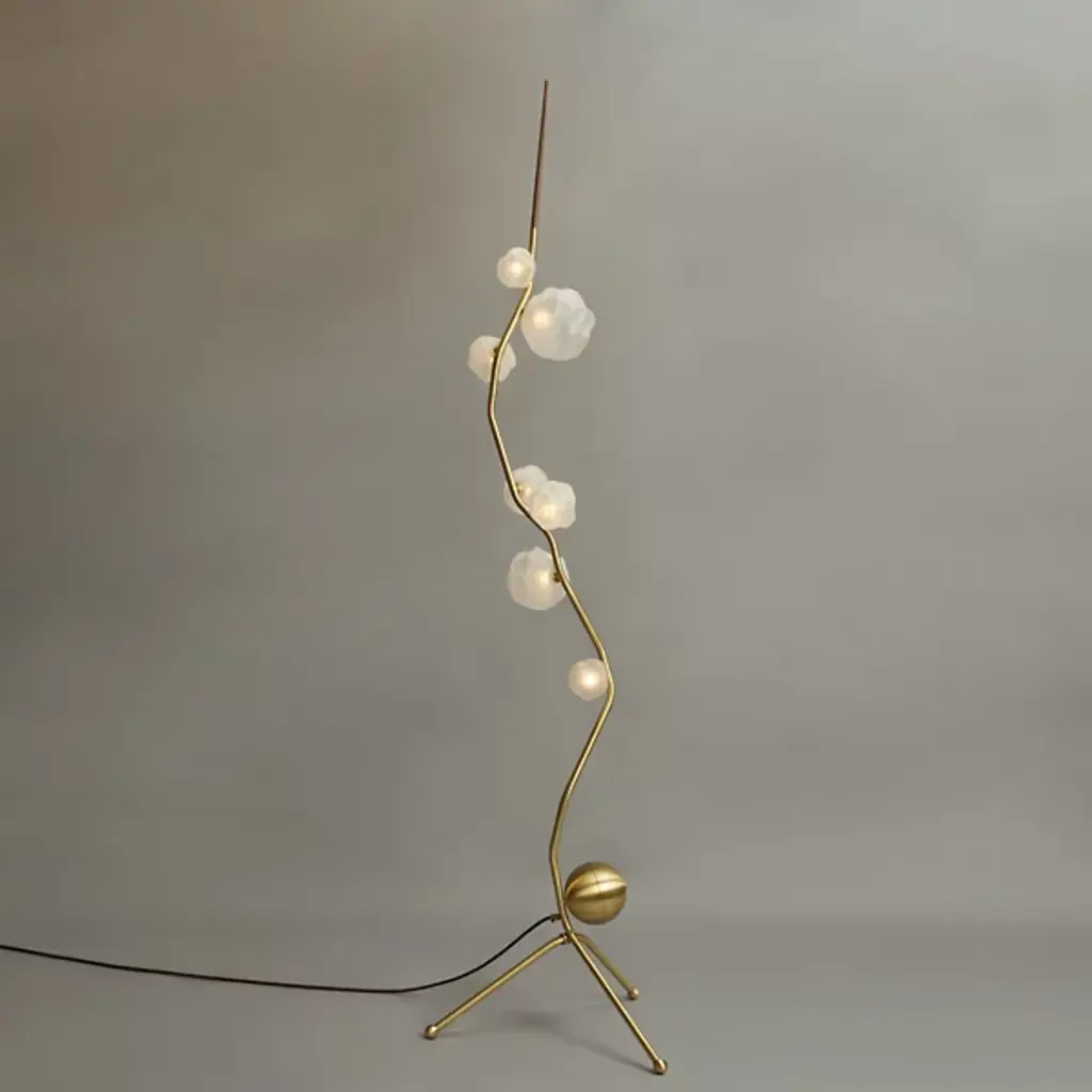 Transform indoor floors with the airy, vibrant character of the Ivy Branch Floor Lamp from Shakuff. A 2023 design made in the USA that matches clean contemporary lines with artisanal flair, it starts with a tripod base atop ball-shaped feet, extending a winding metal stem upward, evoking a vibrant climbing vine headed towards sunlight. The metal stem is capped with a wooden ferrule, adding a touch of natural woodgrain to the design, while small lamps studded along the stem are surrounded by hand-blown glass shades, each one featuring unique creases and pleats, continuing the organic appeal.