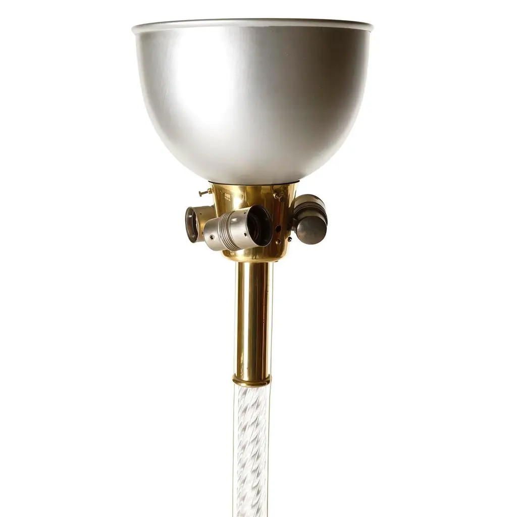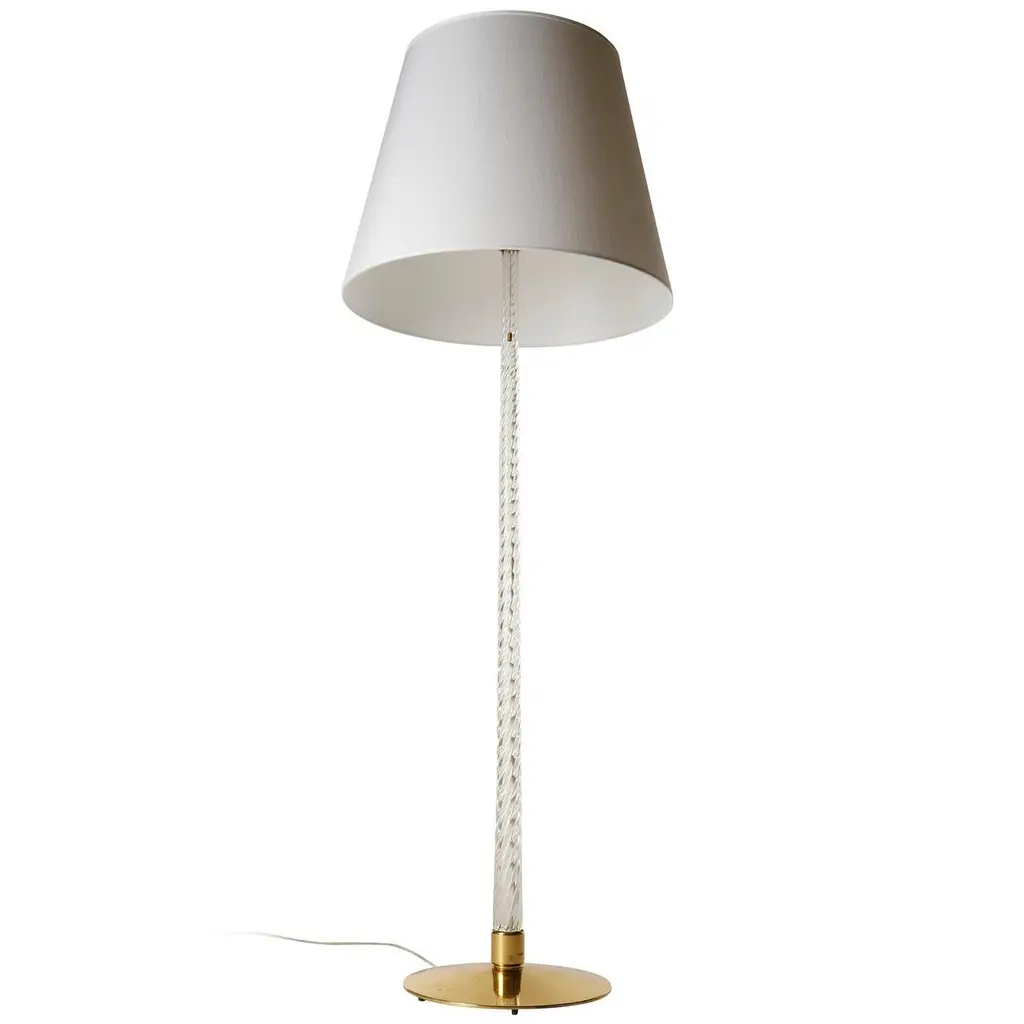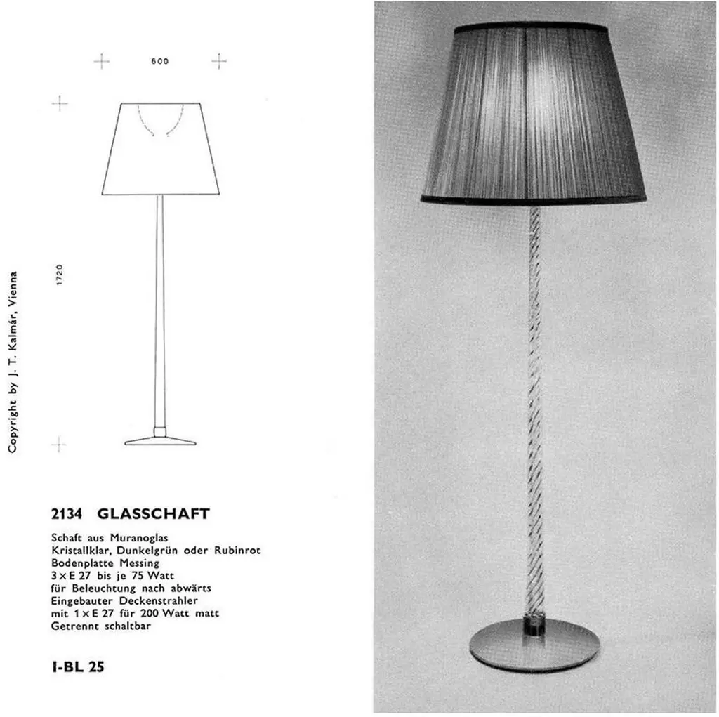 One of two fantastic and rare floor lamps 'Glasschaft' (engl. 'glass rod'), no. 2134 by J.T. Kalmar, Austria, Vienna, manufactured in midcentury, circa 1960.The base is made of polished brass and the stand is made of a twisted clear glass rod which was produced in Italy, very likely from Venini.Each light has four sockets for medium screw base bulbs type E26/E27. In detail there are three bulbs with max. 60W per bulb and one bulb upwards directed within an aluminium reflector with max. 200W for indirect lighting. These bulbs can be switched on separately with two pull switches. The light works well with LED or filament bulbs.The lamp shades have been renewed and are covered with a natural white textile. Other colors (yellow, blue, red, green, beige, grey, ...), sizes and forms of the lamp shades can be customized.The price is per lamp. They are sold individually or as pair.About Kalmar:Founded in Vienna by Julius August Kalmar in 1881, Kalmar first specialized in the production of handcrafted objects of cast bronze.After the turn of the century, Julius Theodor Kalmar, son of the original founder, studied under the renowned Austrian architect and designer Josef Hoffmann. In the following years the company realized modern lighting concepts and designs. Kalmar worked together with the Austrian Werkbund and the most important Austrian architects like Josef Frank, Oskar Wlach, Oswald Haerdtl, Clemens Holzmeister, Ernst Plischke, and Oskar Strnad.
