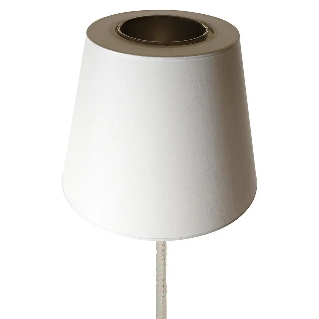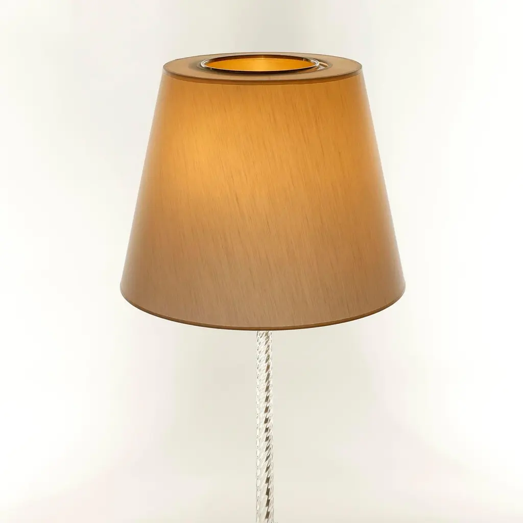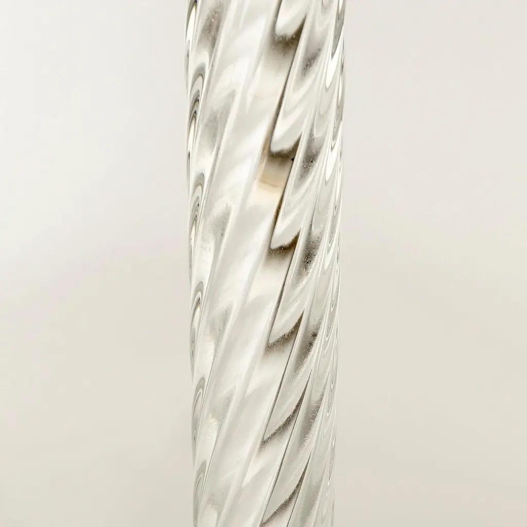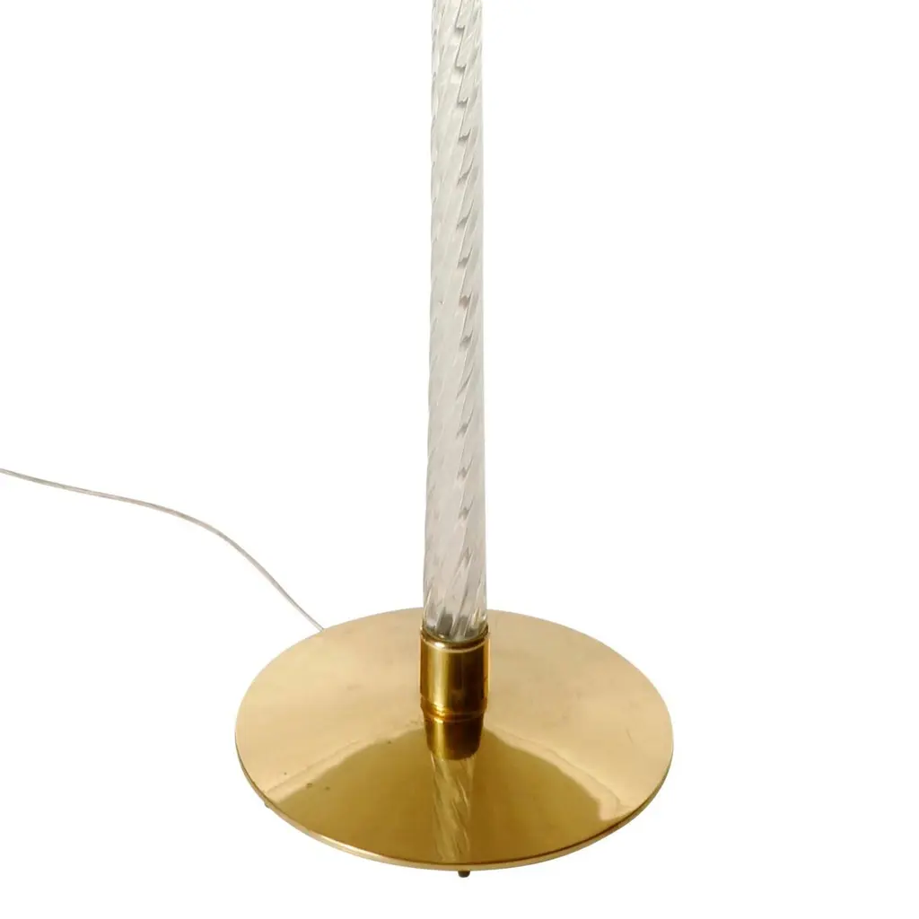 One of two fantastic and rare floor lamps 'Glasschaft' (engl. 'glass rod'), no. 2134 by J.T. Kalmar, Austria, Vienna, manufactured in midcentury, circa 1960.The base is made of polished brass and the stand is made of a twisted clear glass rod which was produced in Italy, very likely from Venini.Each light has four sockets for medium screw base bulbs type E26/E27. In detail there are three bulbs with max. 60W per bulb and one bulb upwards directed within an aluminium reflector with max. 200W for indirect lighting. These bulbs can be switched on separately with two pull switches. The light works well with LED or filament bulbs.The lamp shades have been renewed and are covered with a natural white textile. Other colors (yellow, blue, red, green, beige, grey, ...), sizes and forms of the lamp shades can be customized.The price is per lamp. They are sold individually or as pair.About Kalmar:Founded in Vienna by Julius August Kalmar in 1881, Kalmar first specialized in the production of handcrafted objects of cast bronze.After the turn of the century, Julius Theodor Kalmar, son of the original founder, studied under the renowned Austrian architect and designer Josef Hoffmann. In the following years the company realized modern lighting concepts and designs. Kalmar worked together with the Austrian Werkbund and the most important Austrian architects like Josef Frank, Oskar Wlach, Oswald Haerdtl, Clemens Holzmeister, Ernst Plischke, and Oskar Strnad.