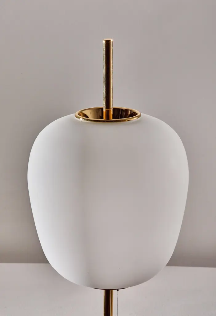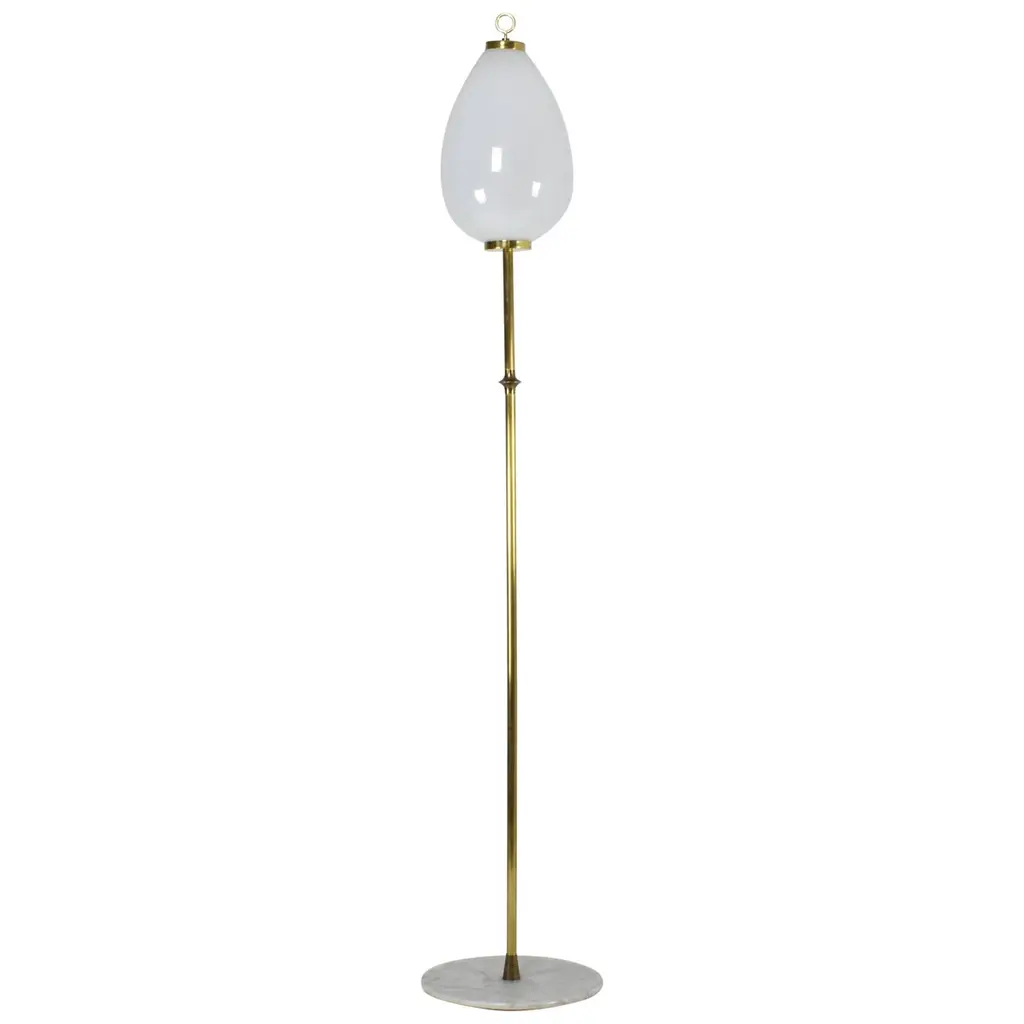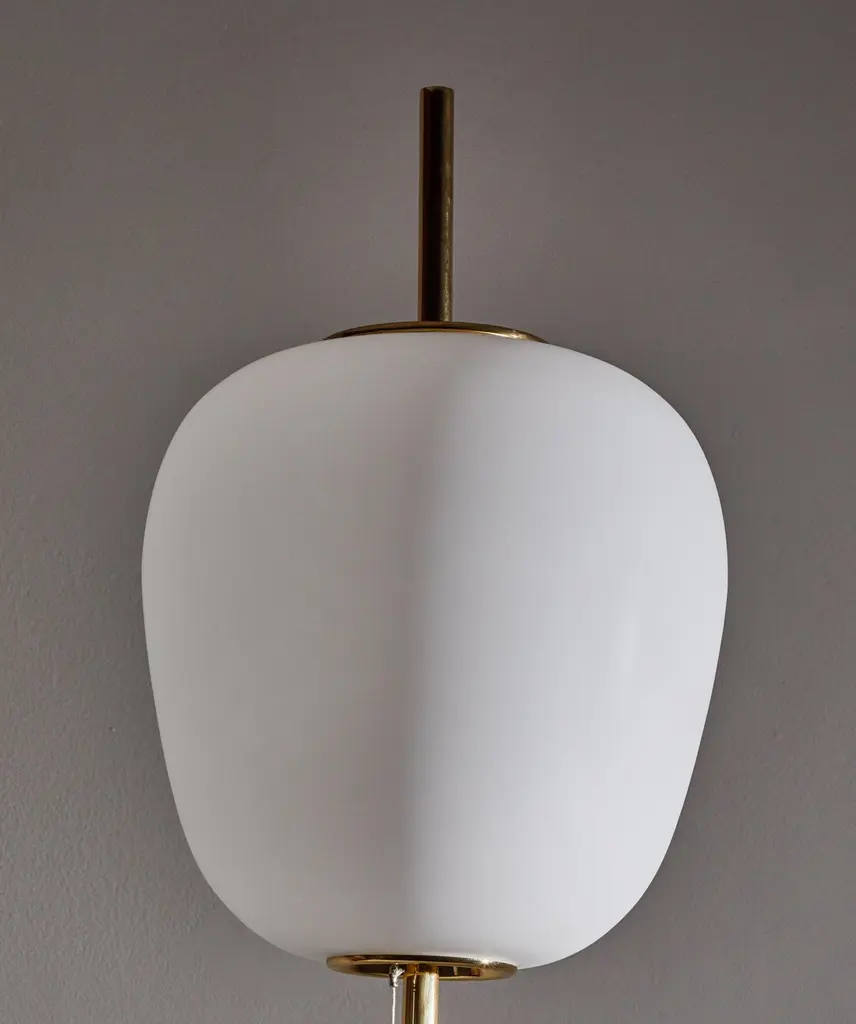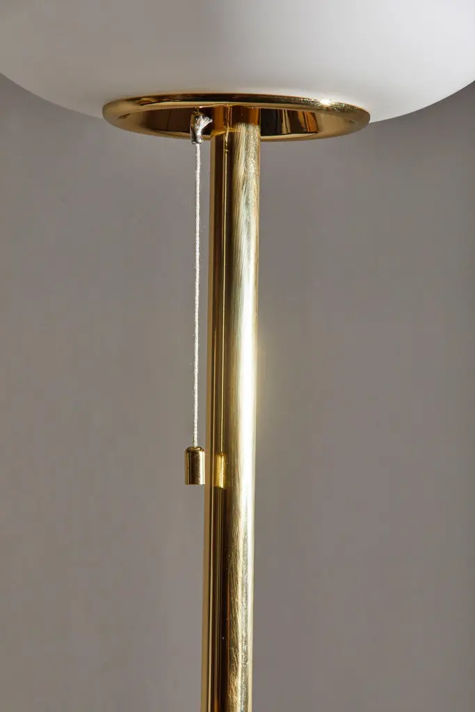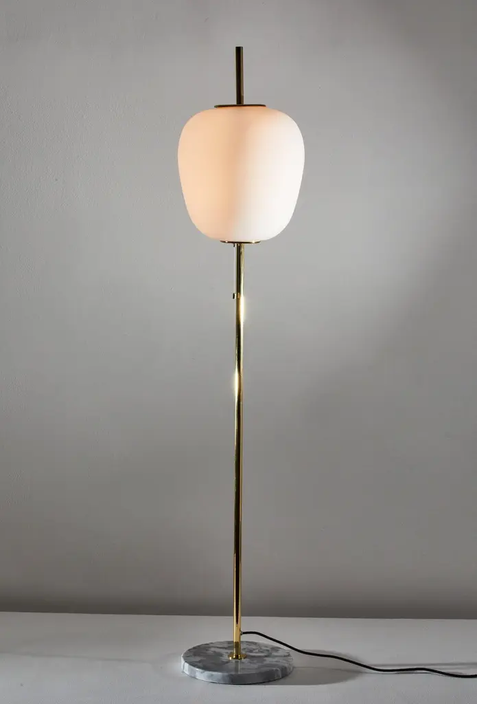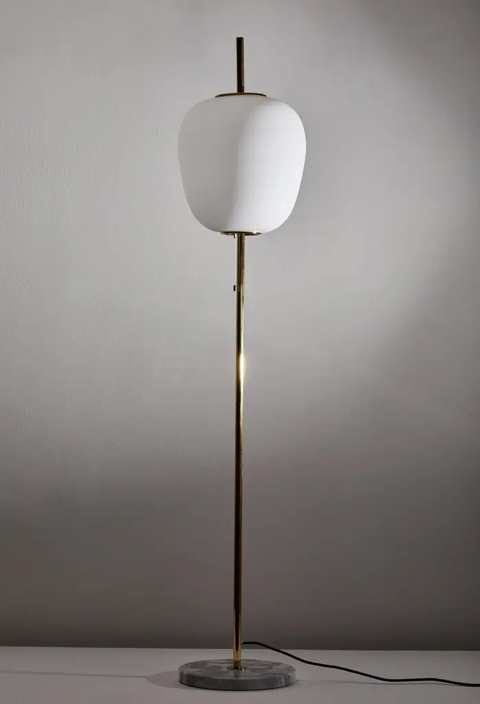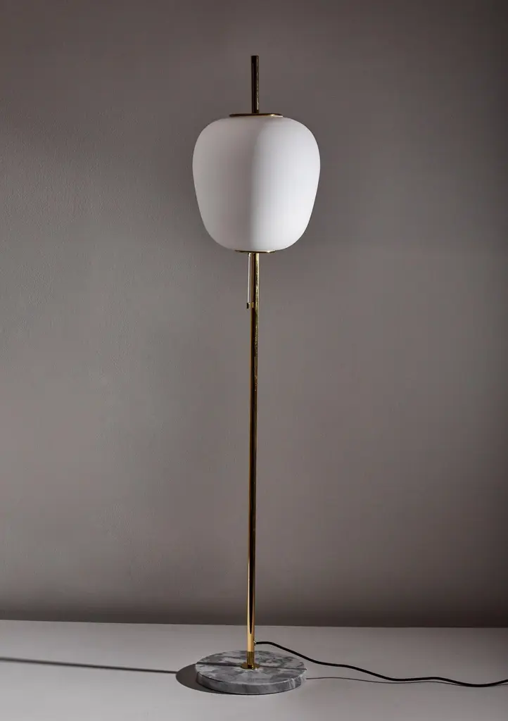 J14 floor lamp by Joseph-André Motte. Licensed, current production manufactured in France by Disderot. Brushed satin glass diffuser, brass stem with marble base. Numbered edition, delivered with authentication certificate. Wired for US. Takes one E27 75w maximum bulb. CE and UL certified.