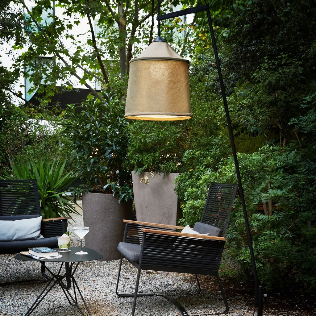 The Jaima Outdoor Fixed LED Floor Lamp from Marset is a creative and versatile statement piece for outdoor spaces. Its stainless steel frame allows for 180-degree rotation and adjustable height, while the textilene shade infuses modern style with an antique-inspired look. Warm up any outdoor patio or back deck seating group with the warm glow from this sophisticated luminary. Highlights